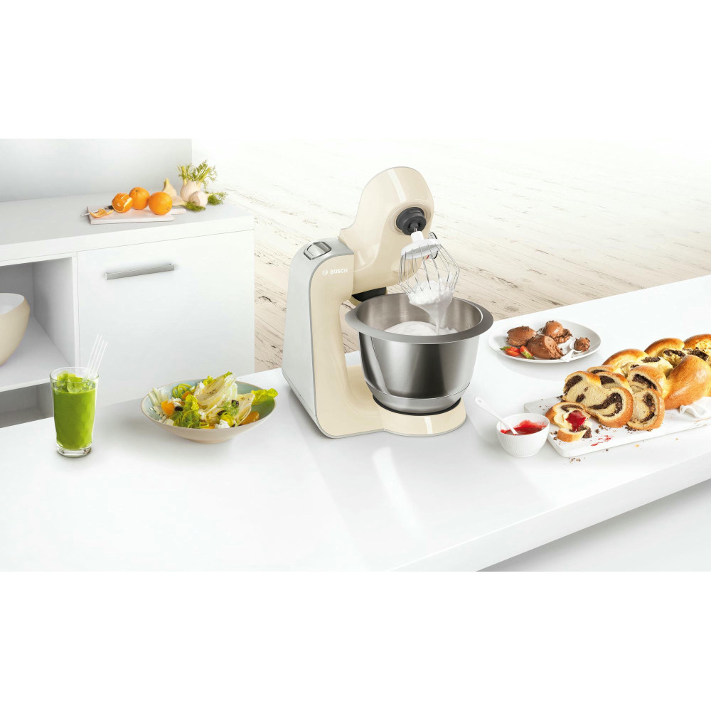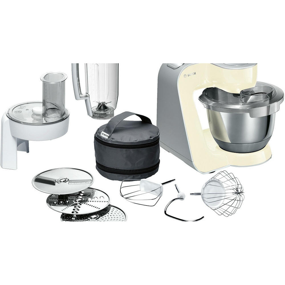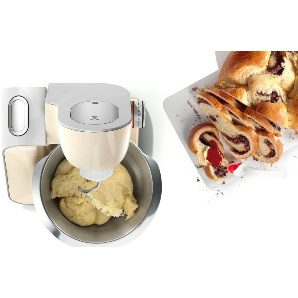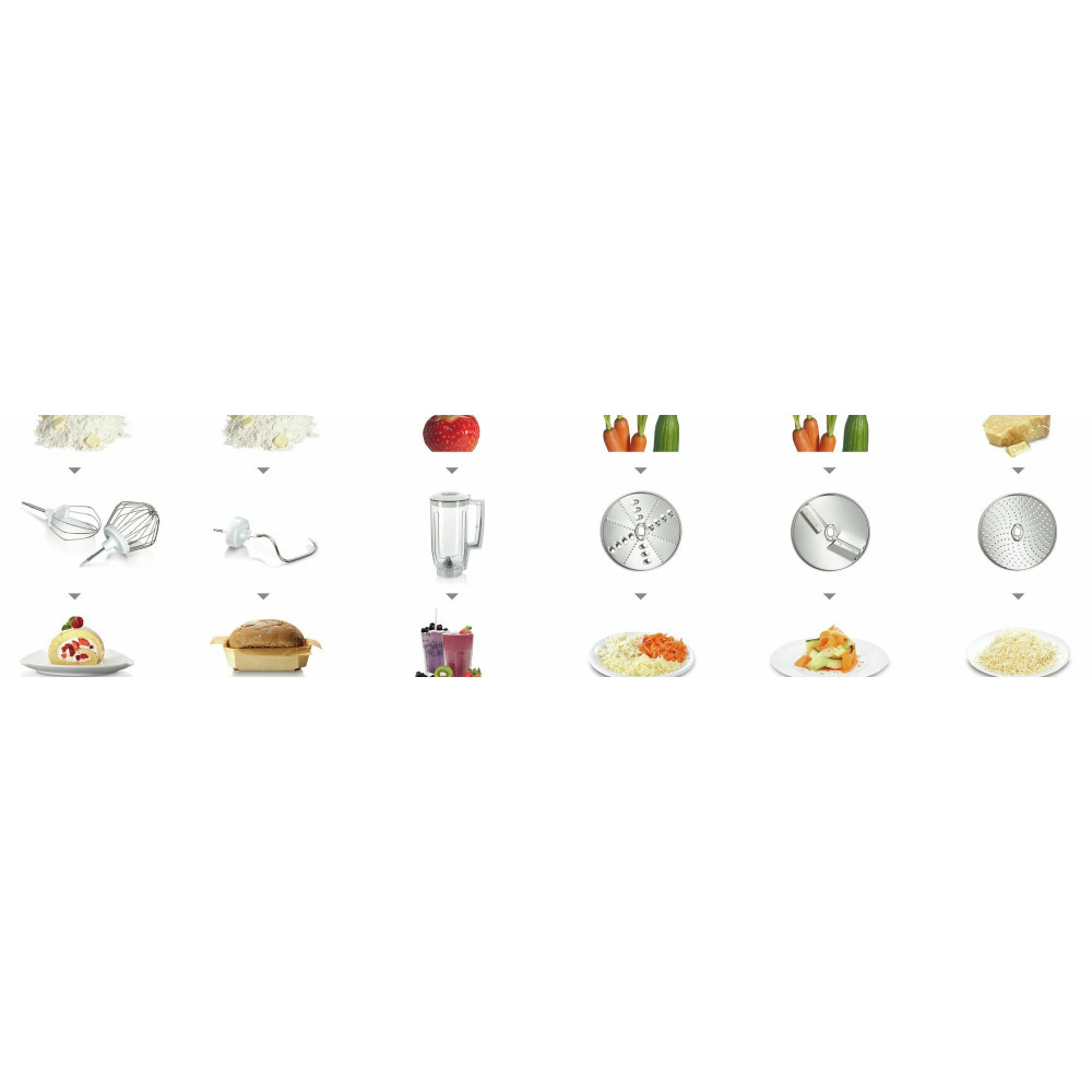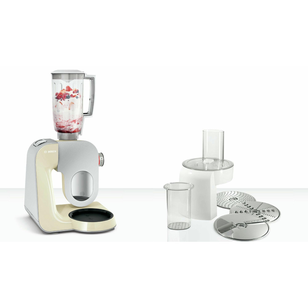 Кухонный комбайн Bosch MUM 58920 – многофункциональная модель с шестью насадками. Две венчика и крюк для теста позволяют замешивать до 1,9 кг дрожжевого или 2,7 кг легкого теста. Две терки разного диаметра и шинковка дают возможность приготовить салаты и ингредиенты для блюд. Семь скоростей и импульсный режим подходят для различных овощей, сыра, шоколада, орехов. В блендере можно измельчить ягоды, приготовить смузи, пюре и мороженое.