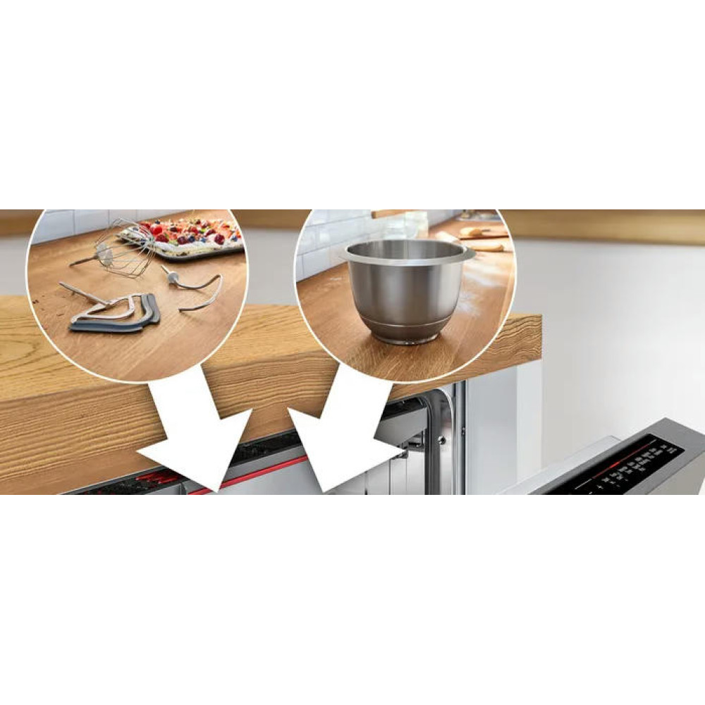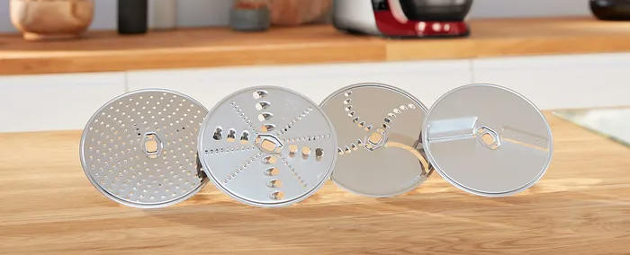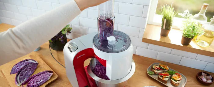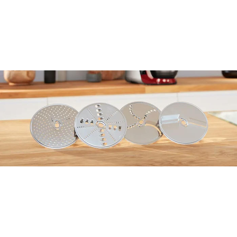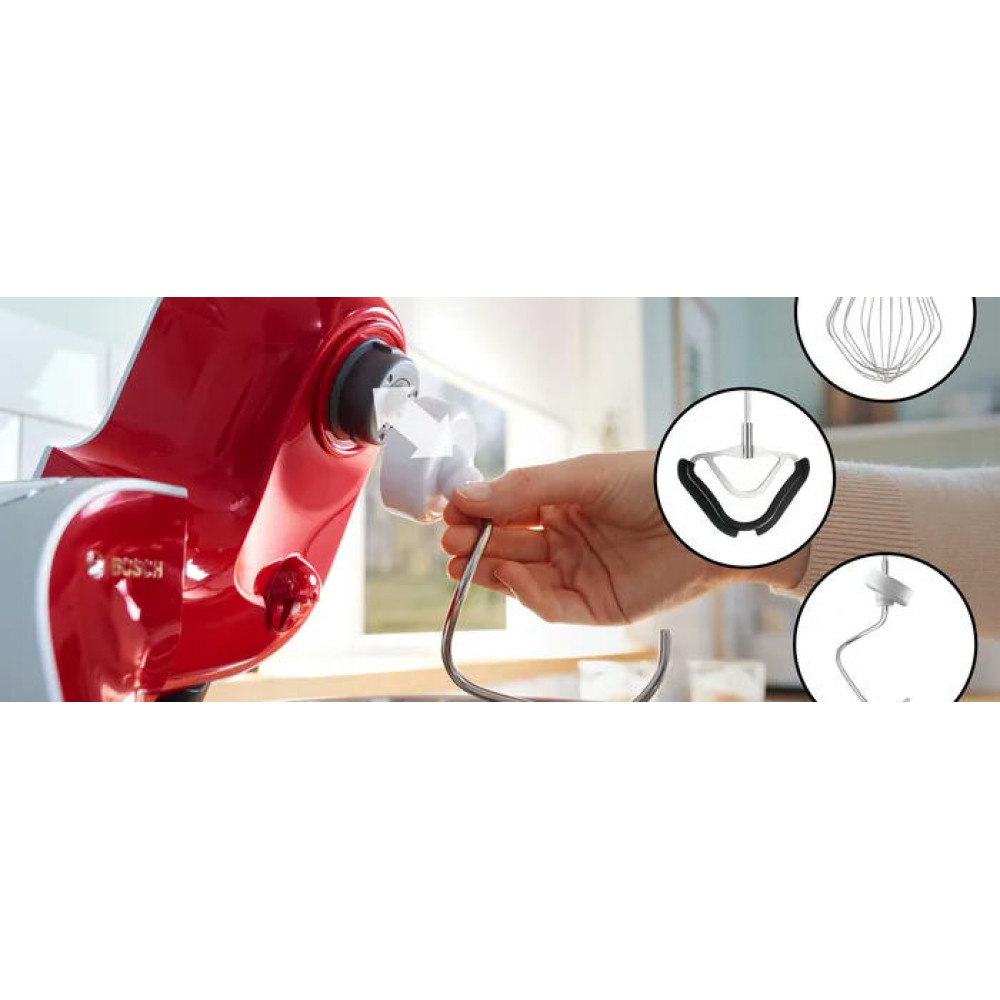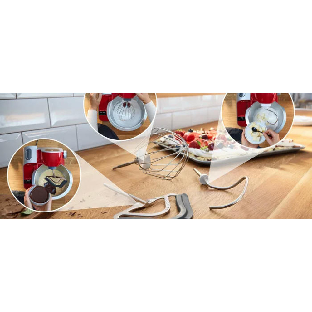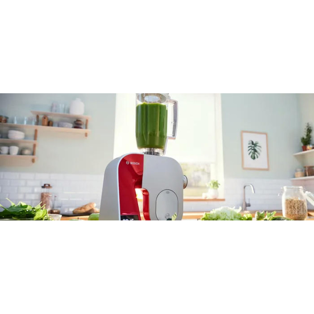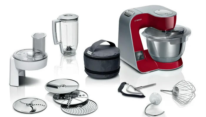 Кухонная машина Bosch MUM5X720 оснащена чашей из нержавеющей стали емкостью 3.9 литра и блендером на 1.25 литра. Есть три привода и четыре подключения для семи дополнительных насадок, включая универсальный нож-измельчитель, двухсторонний диск для шинковки и терки, венчики для взбивания и жидкого теста, а также крюк для теста.