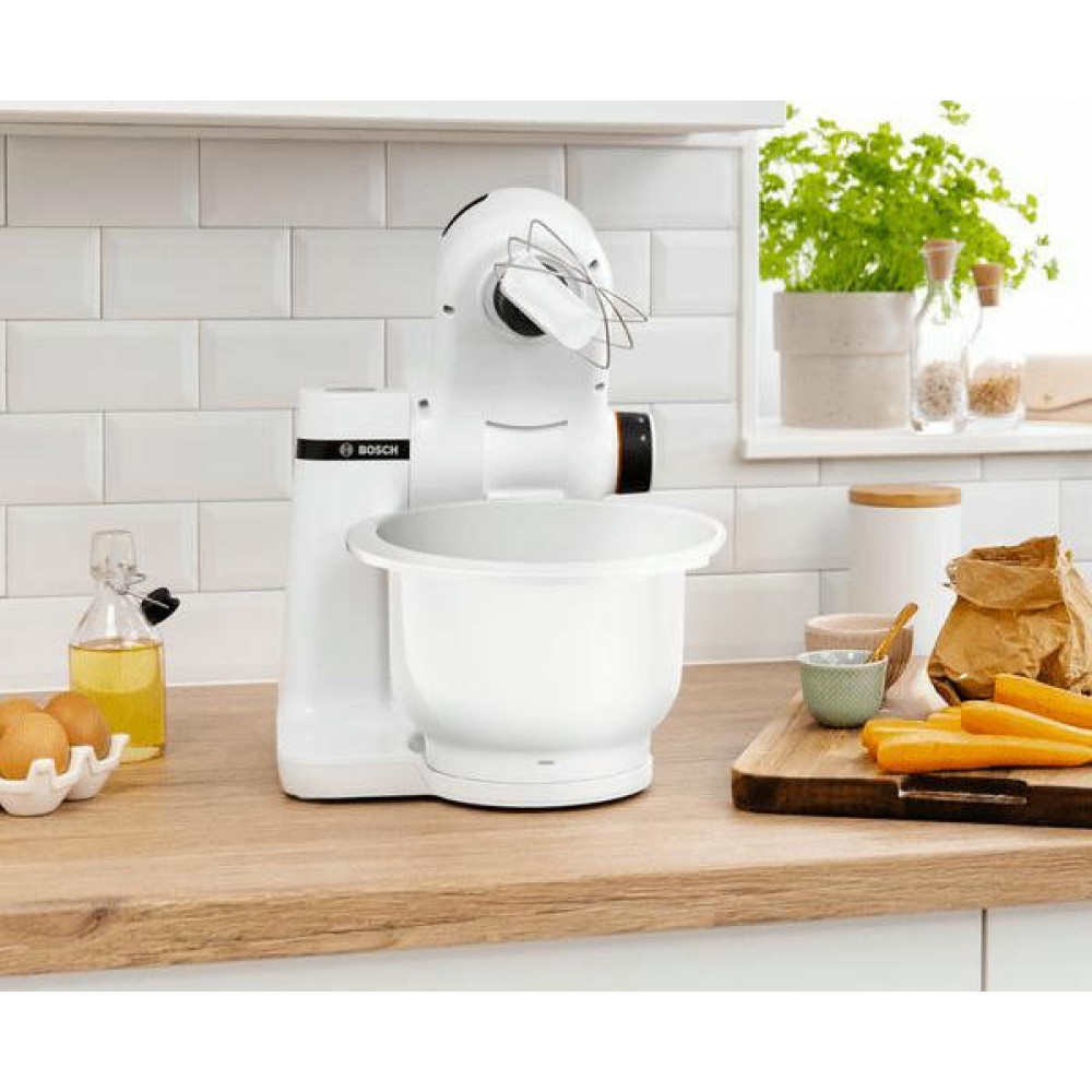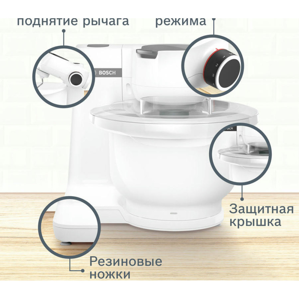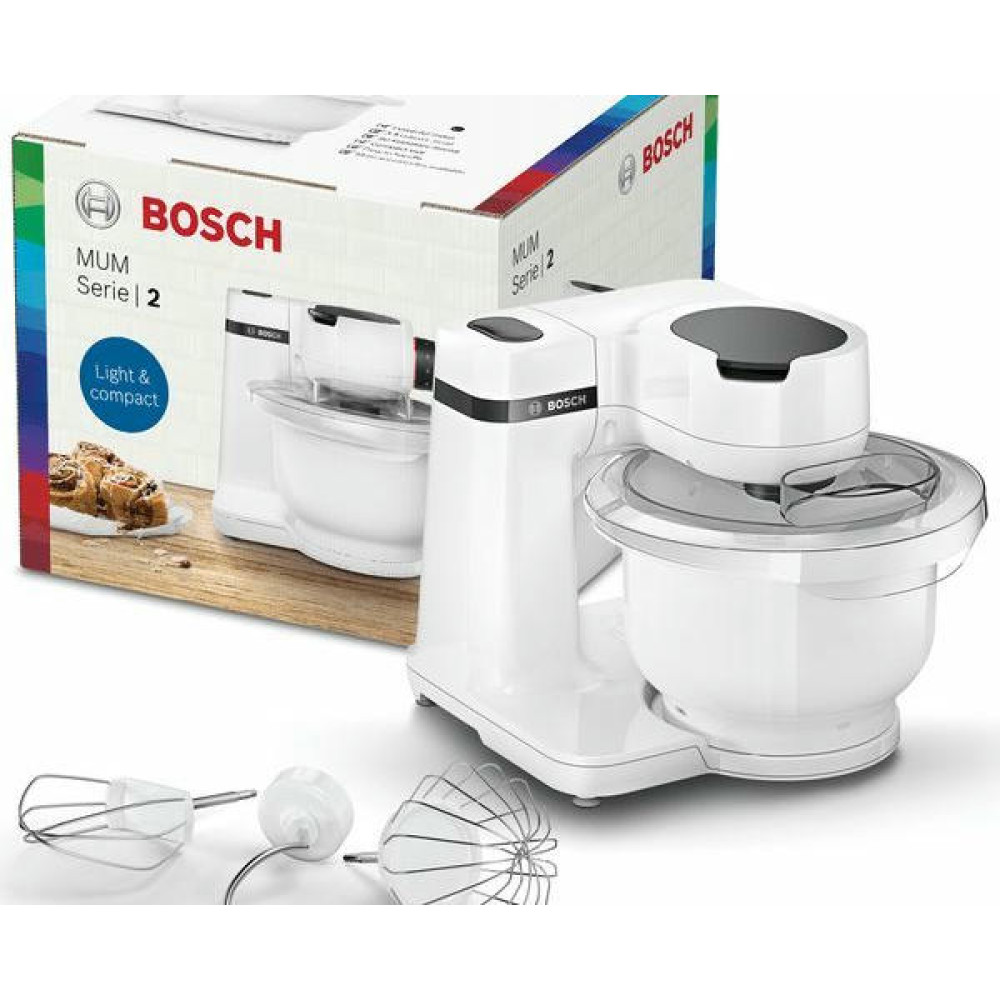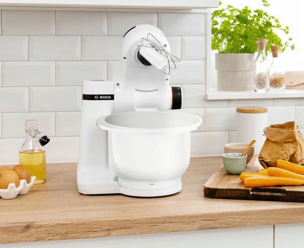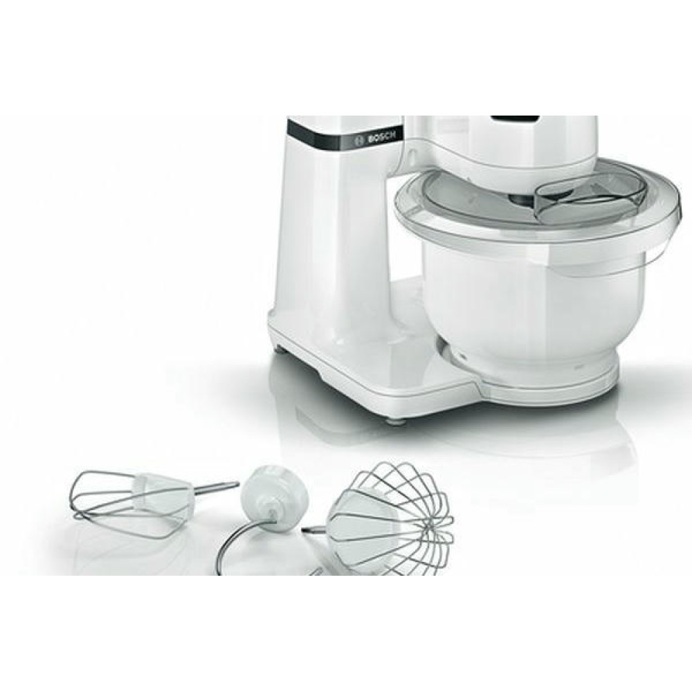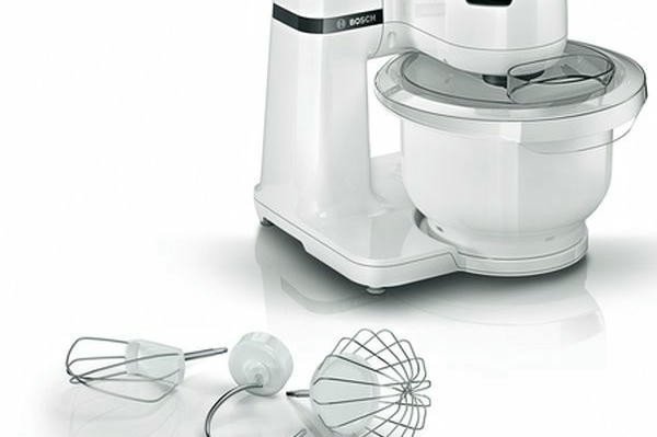 Кухонный комбайн BOSCH MUM S2AW00 отличается системой планетарного вращения, что позволяет качественно смешивать ингредиенты, замесить тесто. Мощность комбайна в 700 Вт позволяет производить работы быстро, без особых усилий. Такой прибор просто необходим в хозяйстве тех, кто любит стряпать, но при этом ограничен во времени. Насадки для миксера помогут вам взбить пышный, необыкновенно вкусный крем. Имеется 4 скорости с электронной регулировкой. Резиновые ножки-присоски не позволяют двигаться прибору по столу. Вместительная чаша на 3,8 л позволяет приготовить максимально 1.7 л теста.