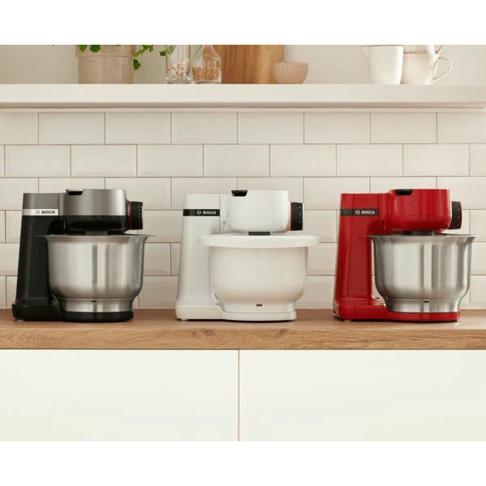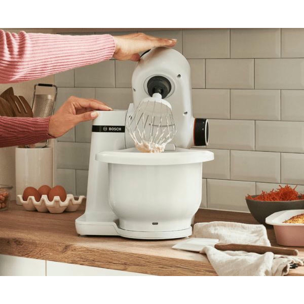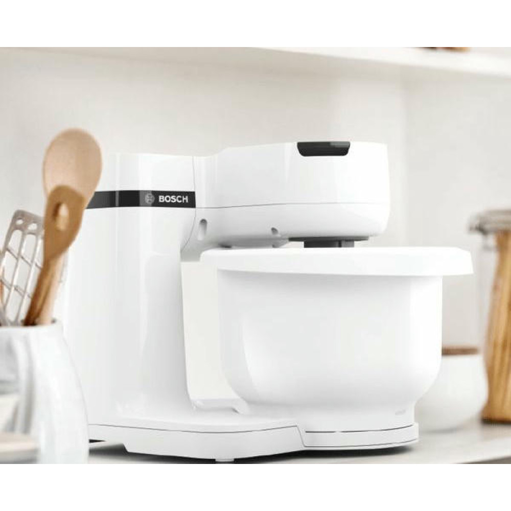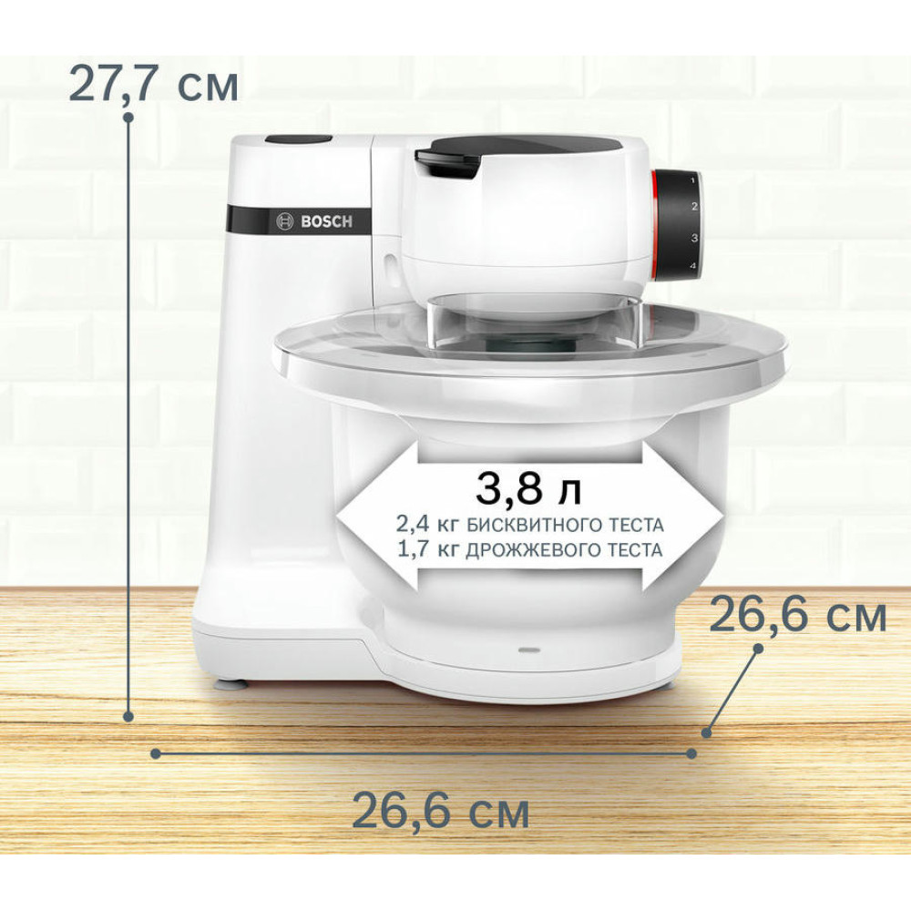 Кухонный комбайн BOSCH MUM S2AW00 отличается системой планетарного вращения, что позволяет качественно смешивать ингредиенты, замесить тесто. Мощность комбайна в 700 Вт позволяет производить работы быстро, без особых усилий. Такой прибор просто необходим в хозяйстве тех, кто любит стряпать, но при этом ограничен во времени. Насадки для миксера помогут вам взбить пышный, необыкновенно вкусный крем. Имеется 4 скорости с электронной регулировкой. Резиновые ножки-присоски не позволяют двигаться прибору по столу. Вместительная чаша на 3,8 л позволяет приготовить максимально 1.7 л теста.