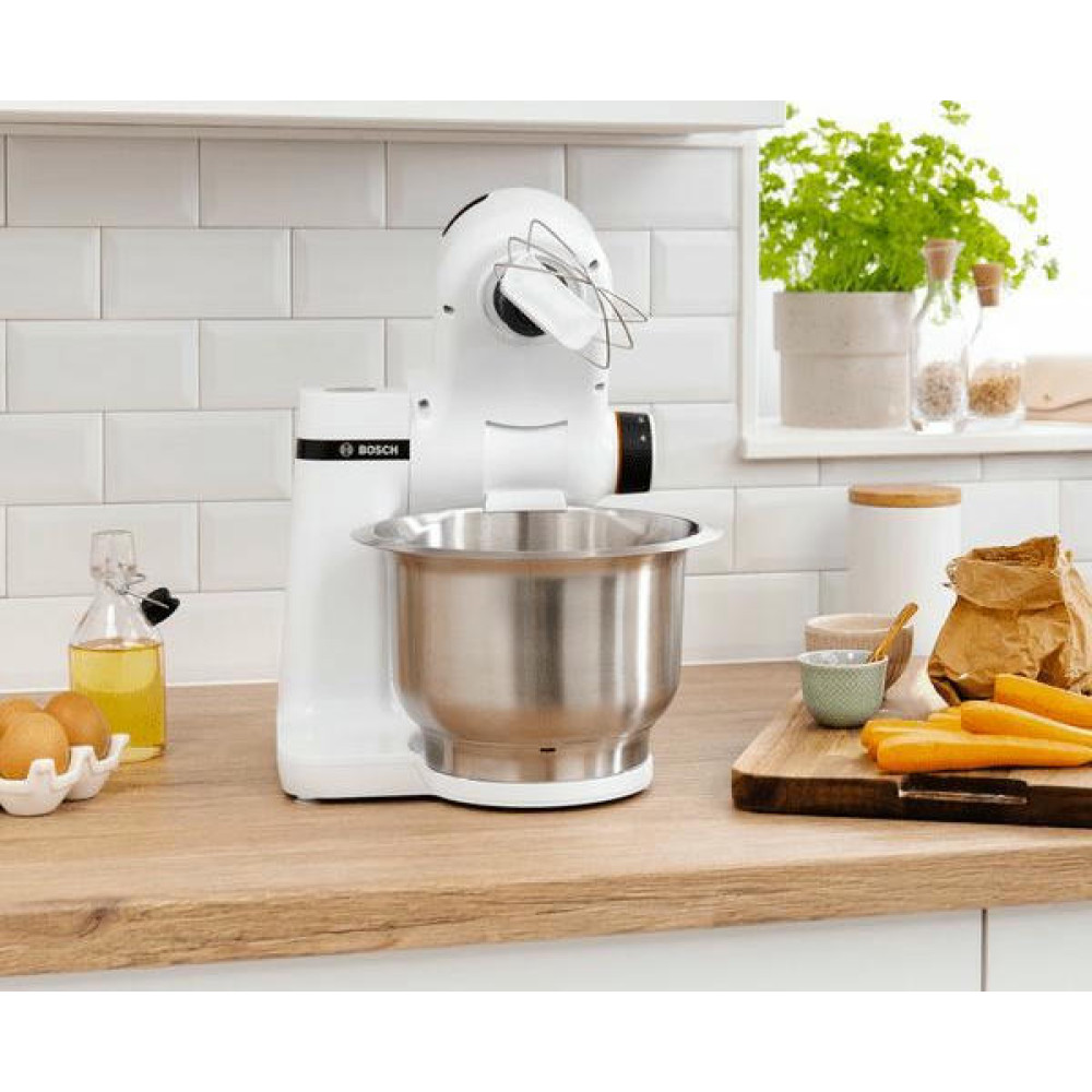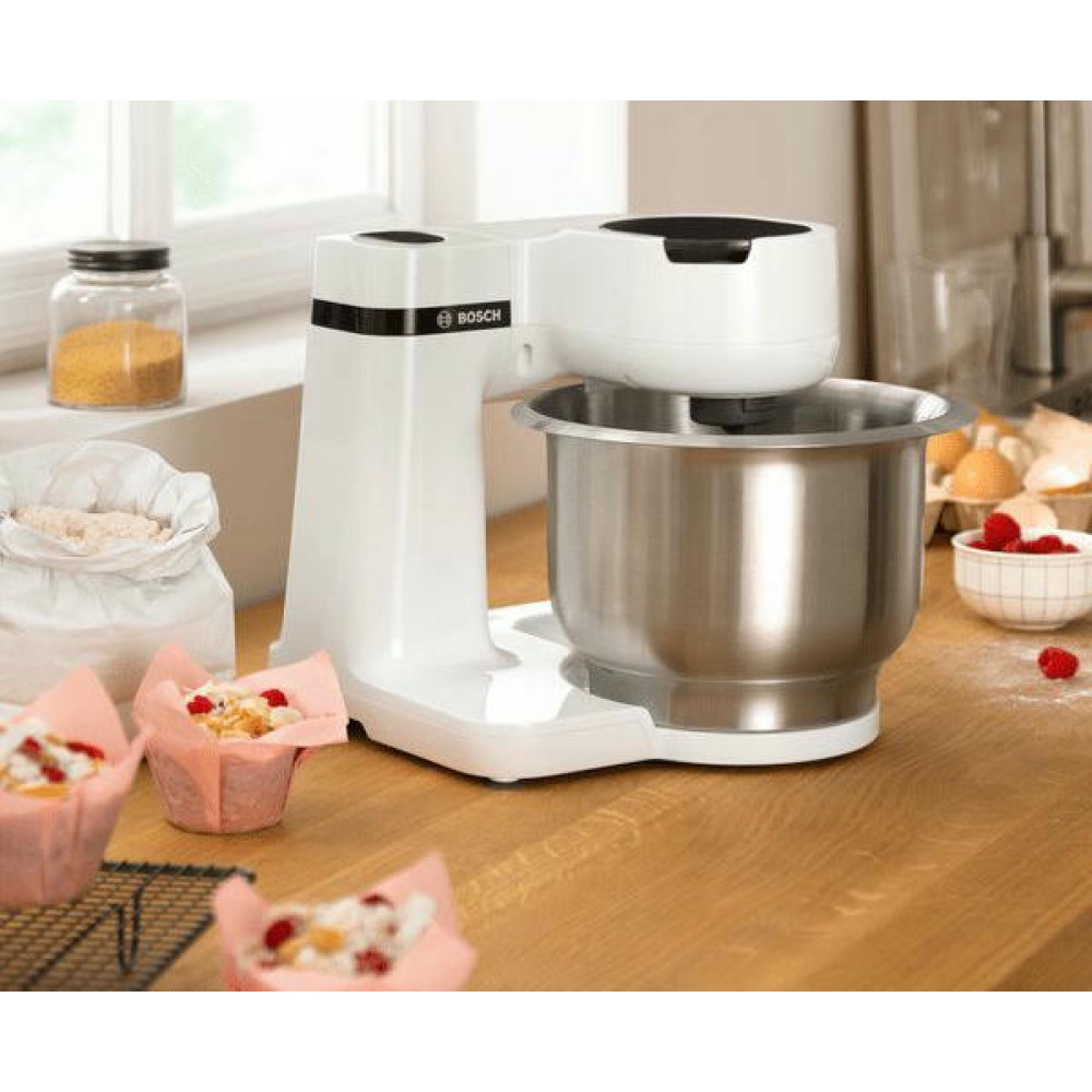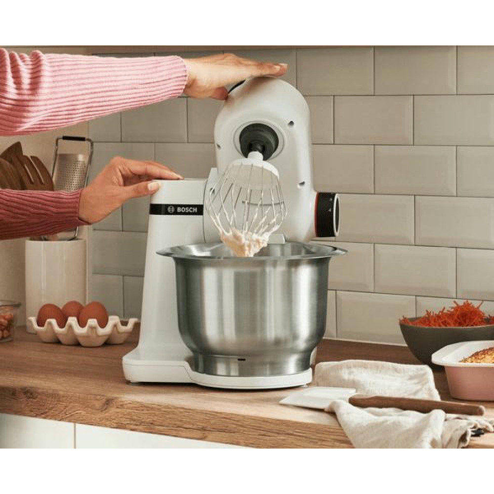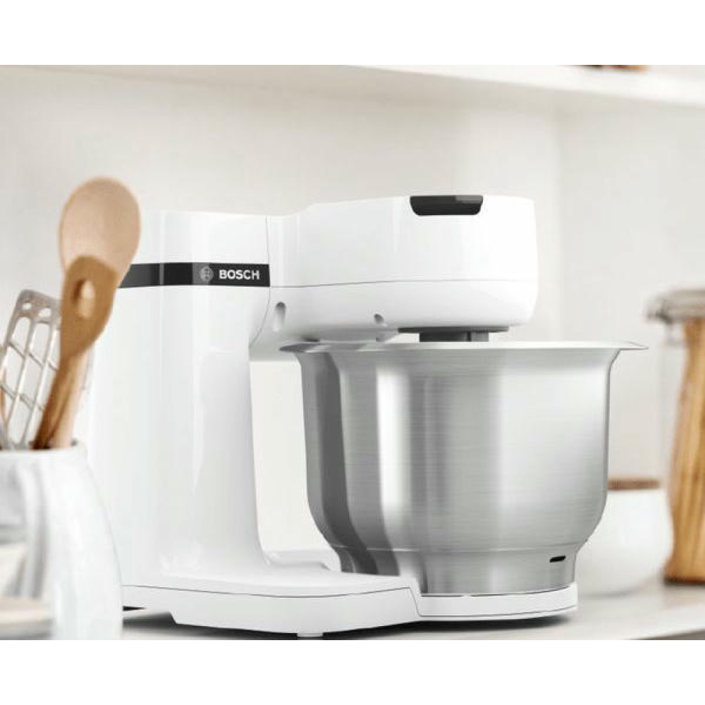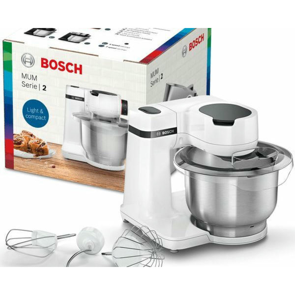 Кухонный комбайн Bosch MUM S2EW00 — мощная машина для приготовления салатов и выпечки. Современный привлекательный дизайн и компактность — MUM Serie | 2 идеально впишется даже в небольшую кухню. Чаша из нержавеющей стали или пластмассы объемом 3,8 л позволяет замесить до 1.7 кг дрожжевого и до 2.4 кг бисквитного теста. 3D планетарный принцип вращения обеспечит качественное смешивание ингредиентов — насадки вращаются сразу в трех направлениях.