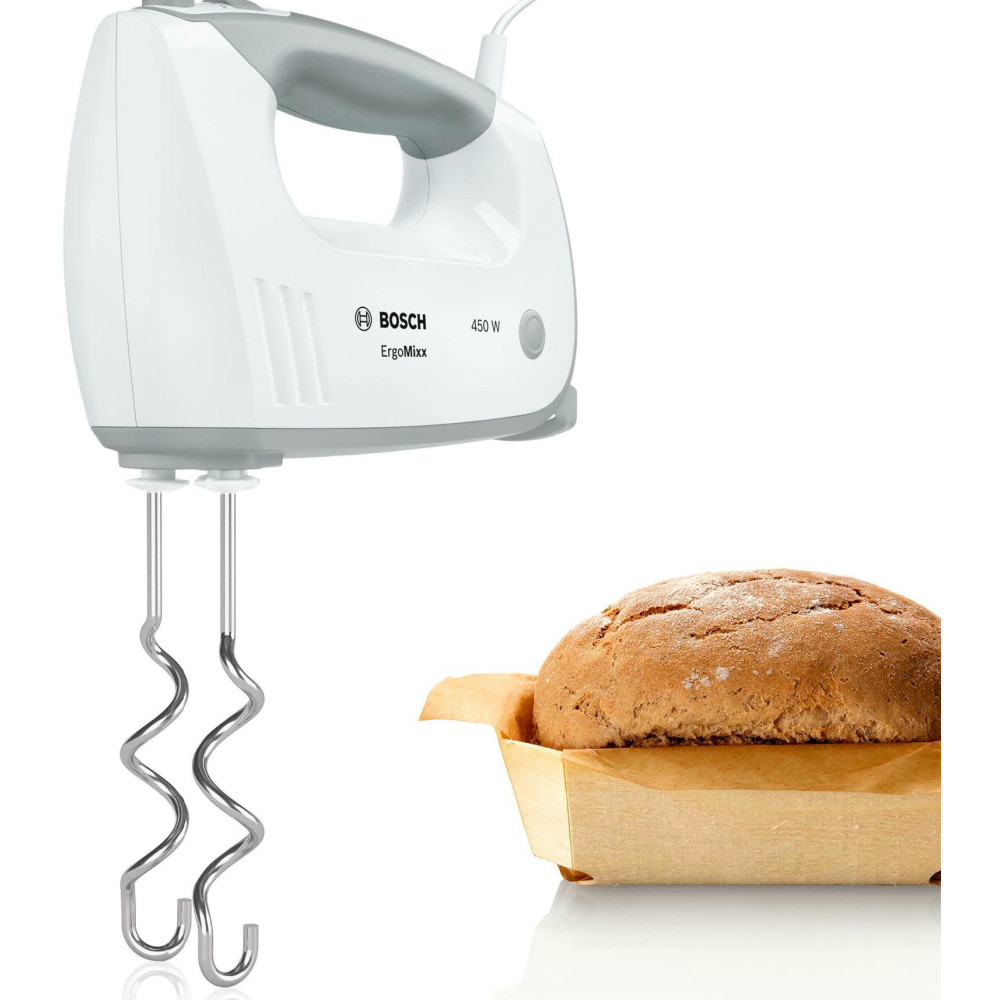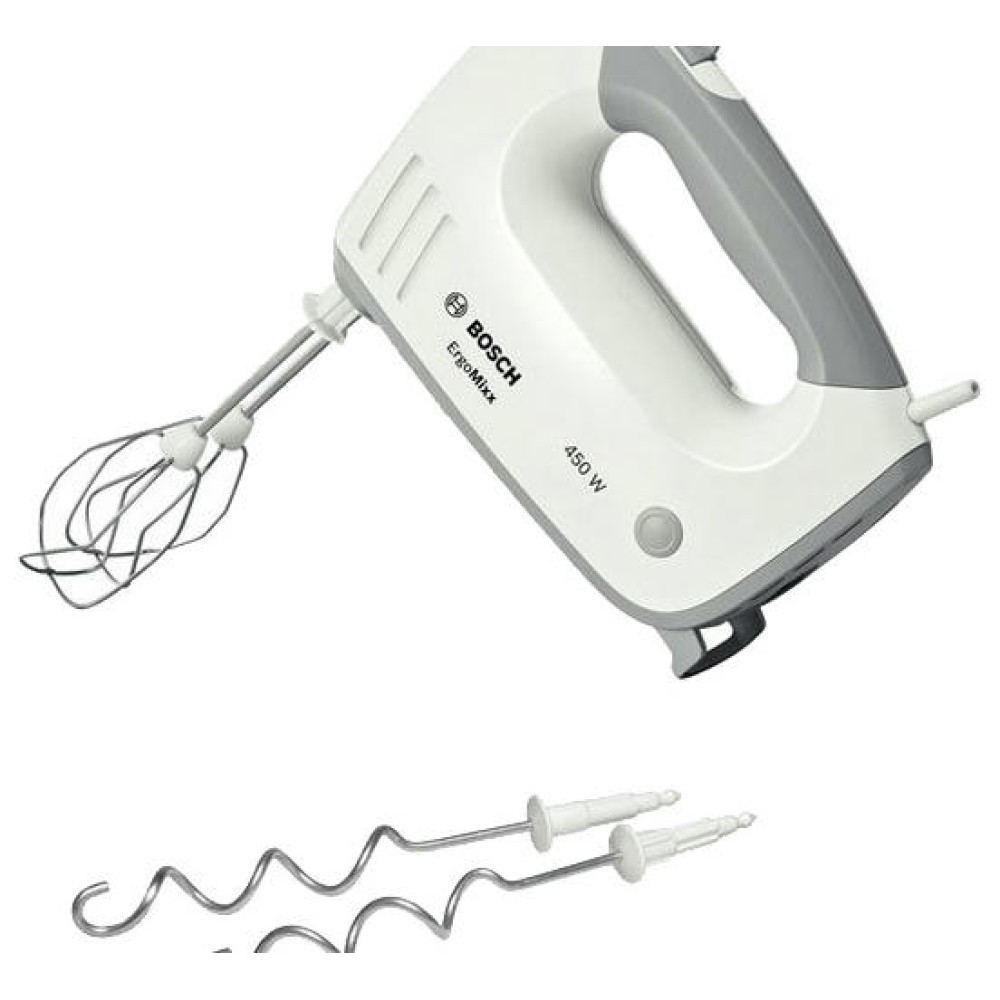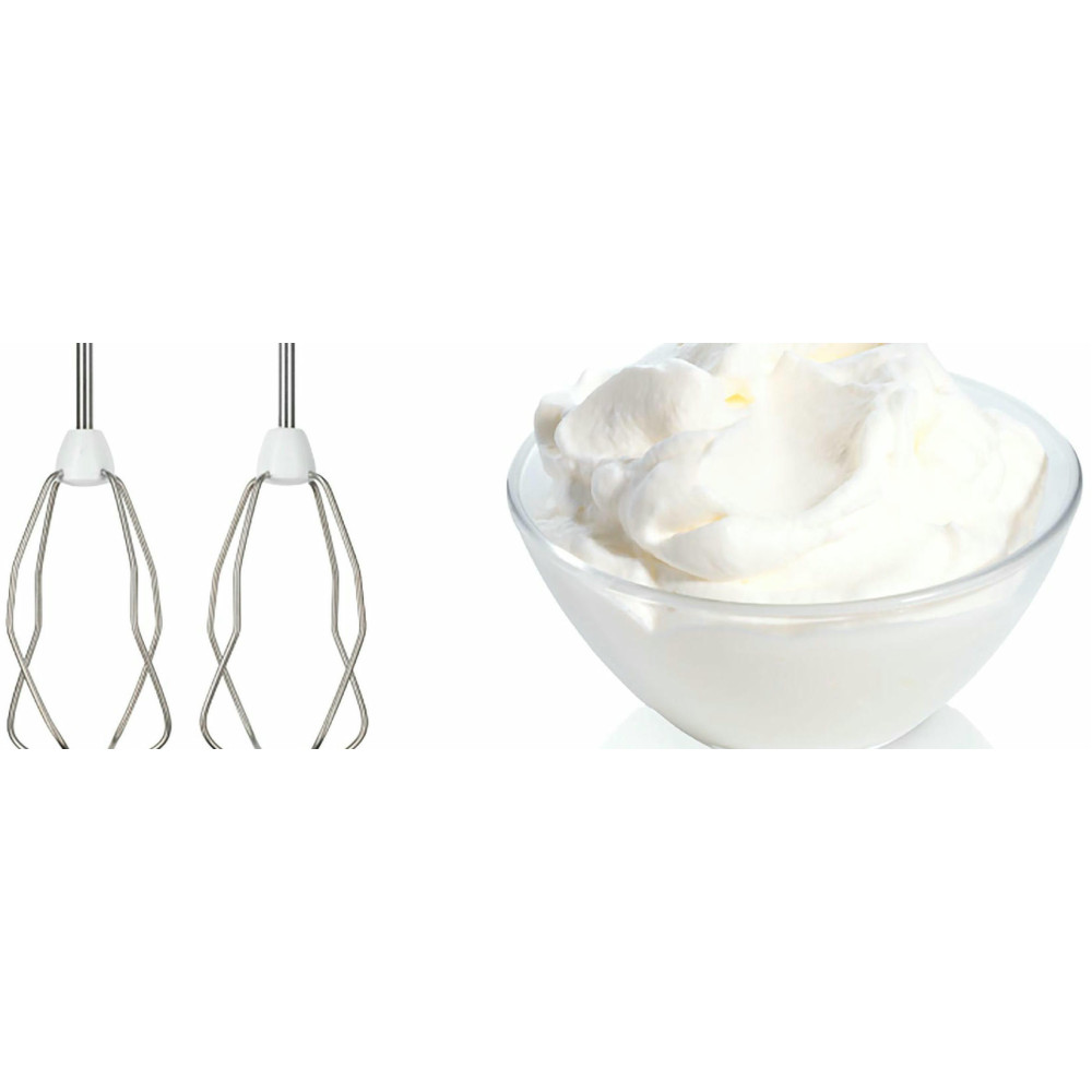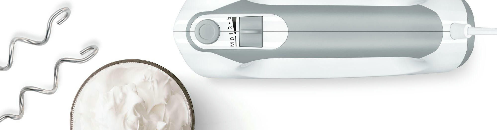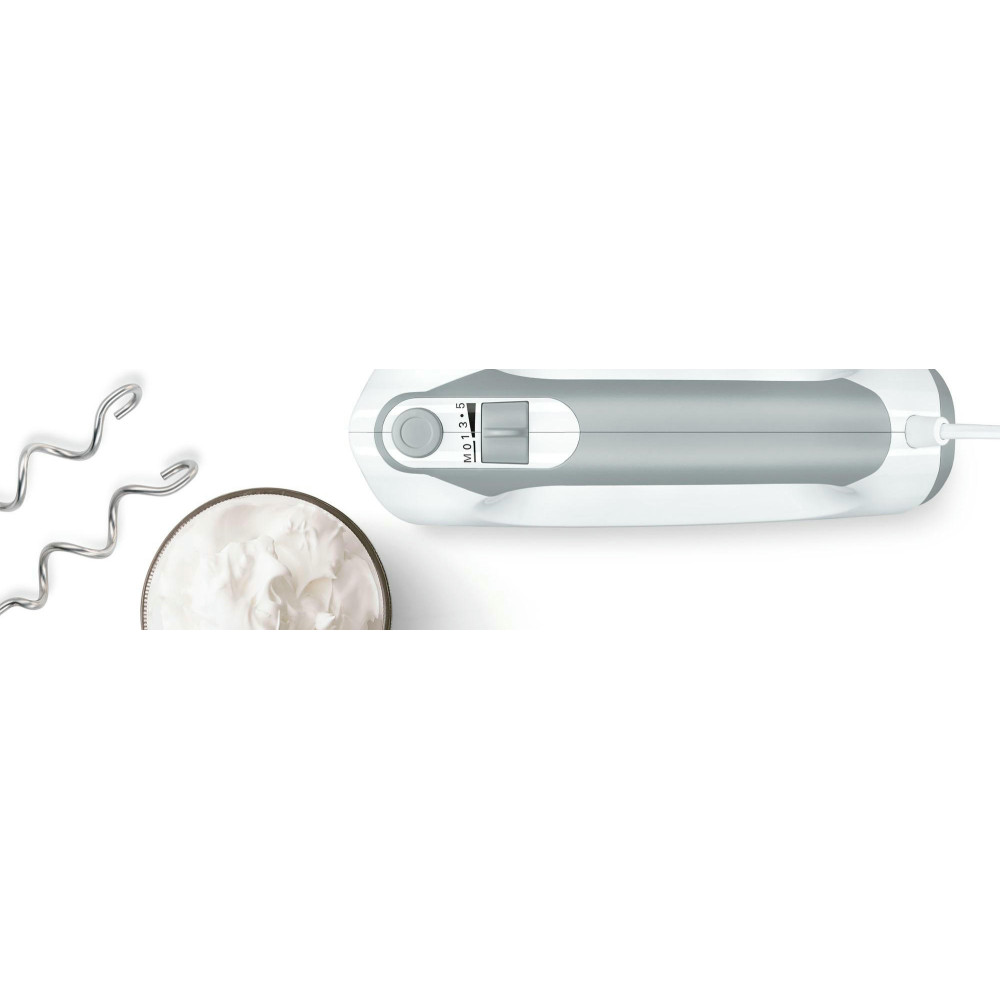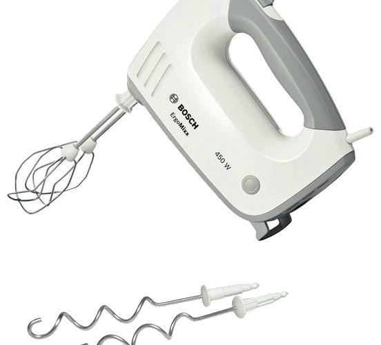 Выполнен в сочетании серого и белого цвета. Имеет 5 скоростей и дополнительный турборежим. В комплекте идут 4 насадки: 2 венчика для взбивания и 2 крючка для замешивания теста.
