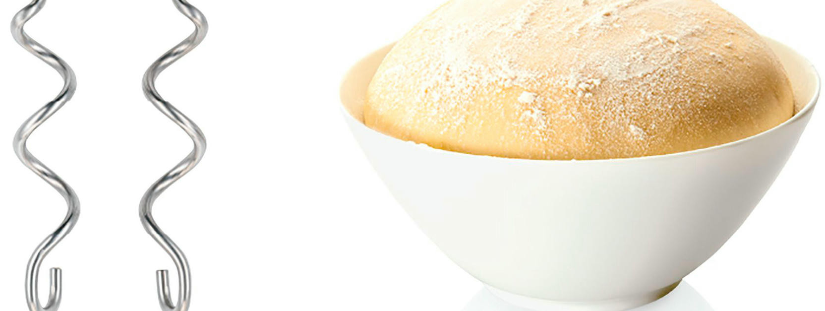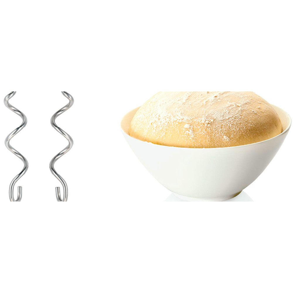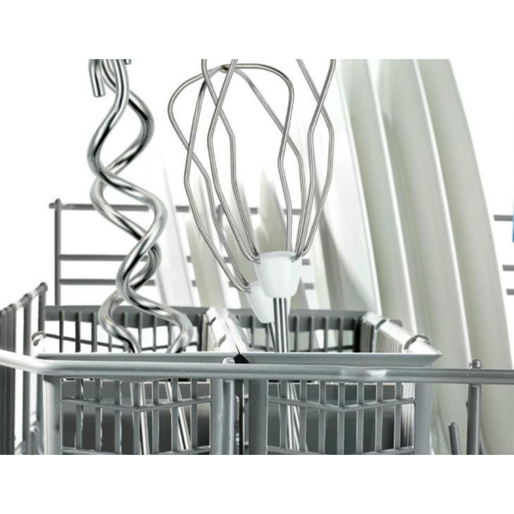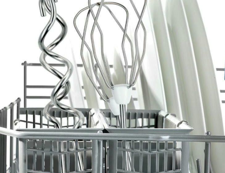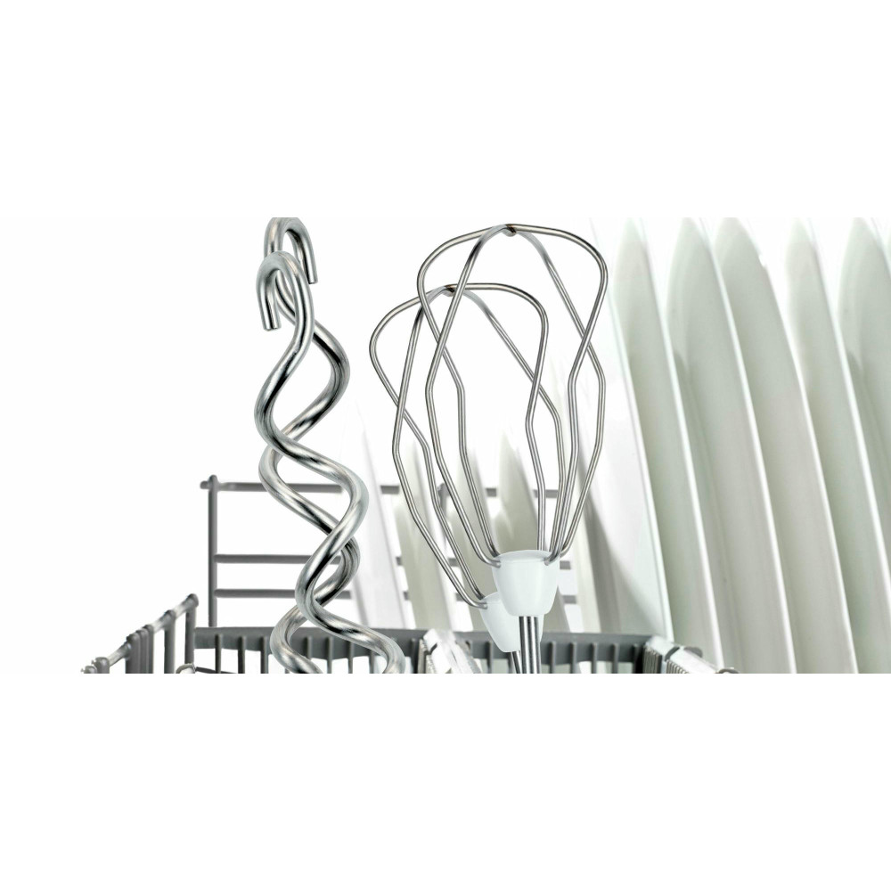Выполнен в сочетании серого и белого цвета. Имеет 5 скоростей и дополнительный турборежим. В комплекте идут 4 насадки: 2 венчика для взбивания и 2 крючка для замешивания теста.