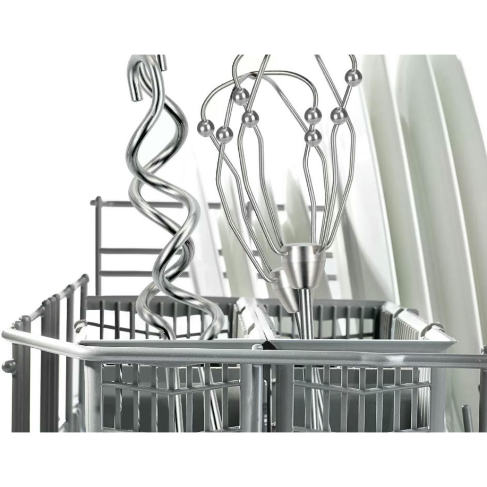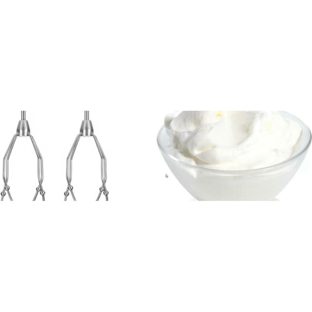 В арсенале модели есть 5 скоростей работы, от медленной до максимально быстрой, что позволяет начинать работу плавно и без брызг, а затем достигать высокой скорости вращения. Кроме того предусмотрен импульсный режим, когда при нажатии кнопки миксер начинает работать сразу на наибольшей мощности. Это поможет избавиться от остатков жидкости на венчиках или быстро вмешать новые ингредиенты в уже готовую массу.