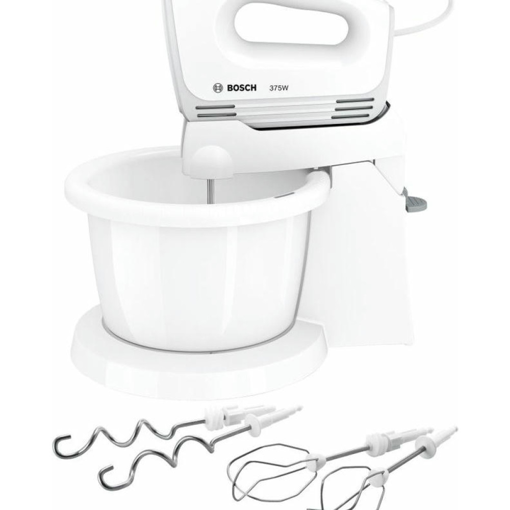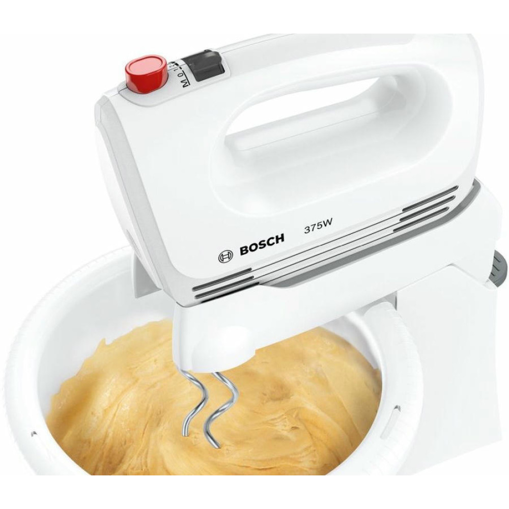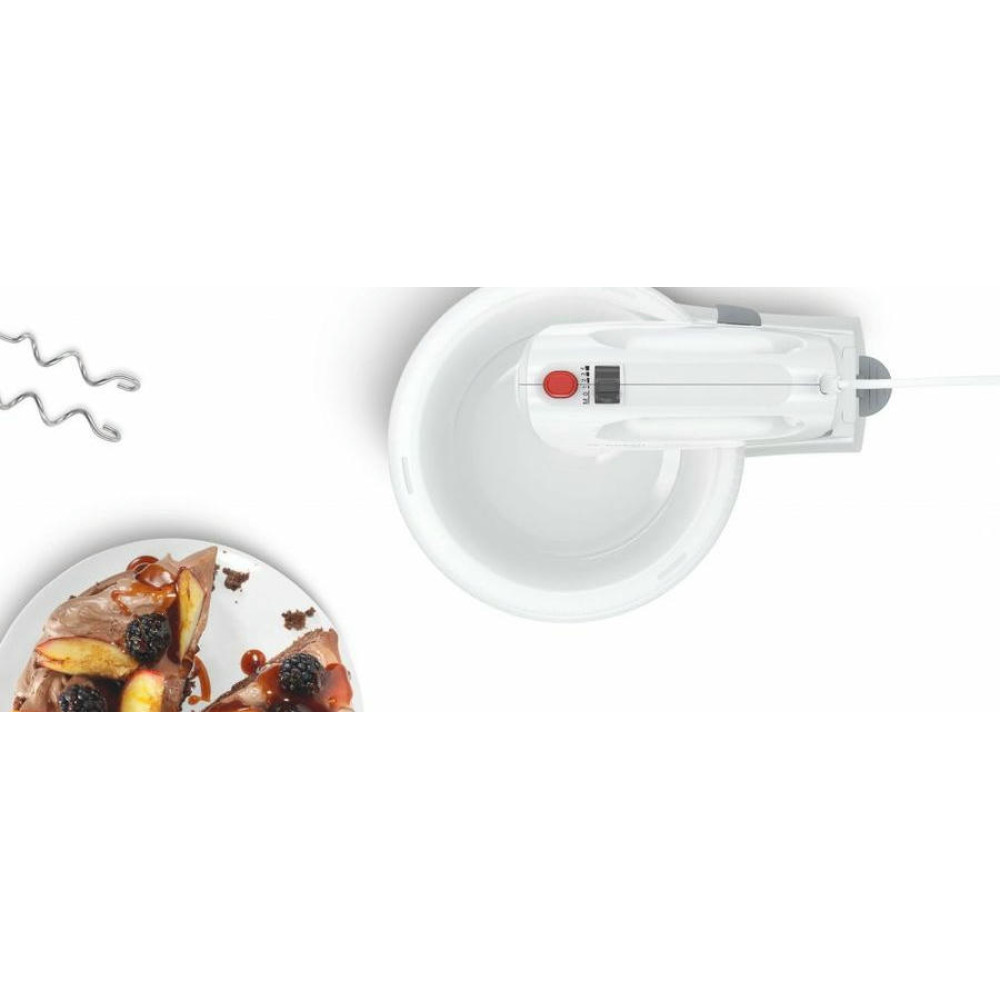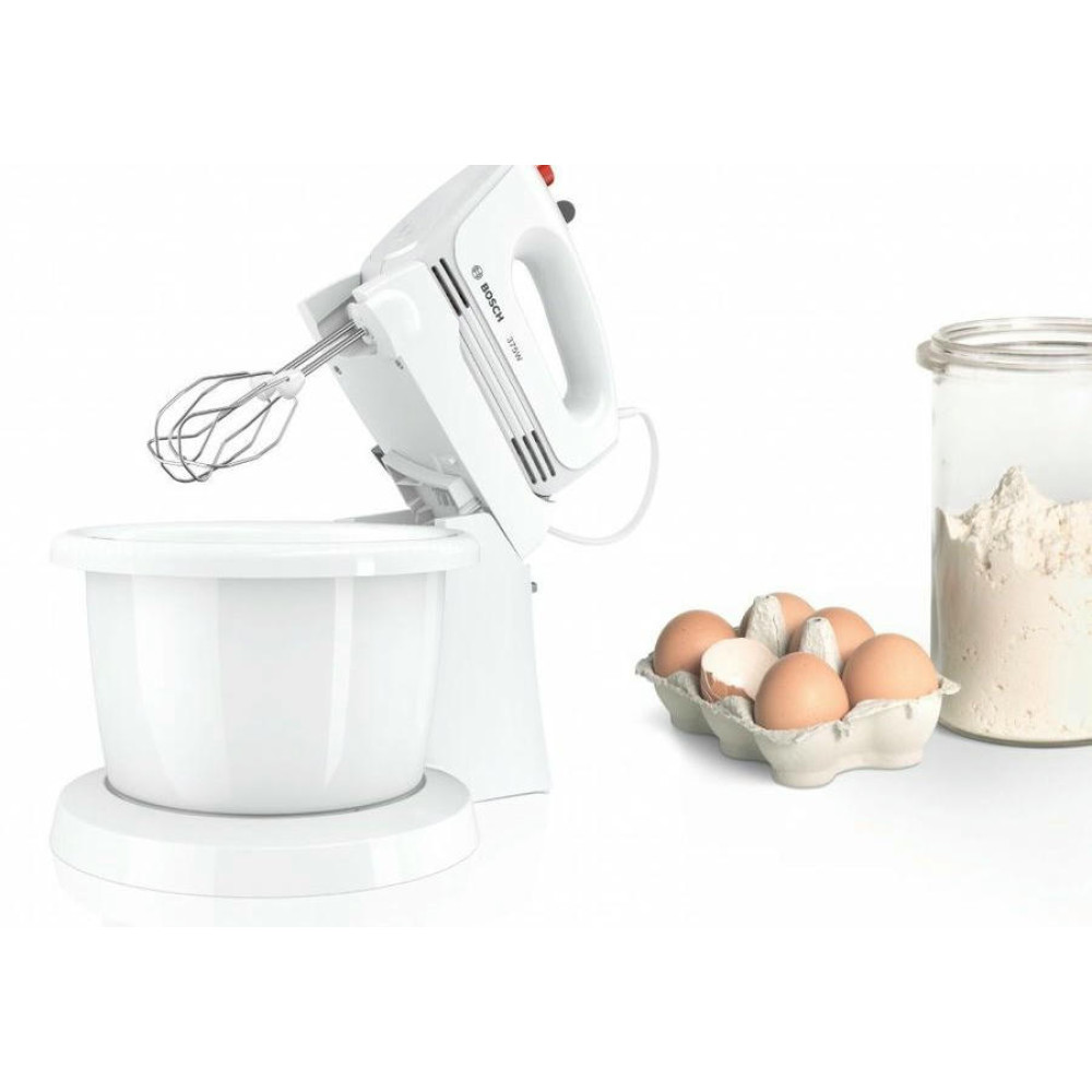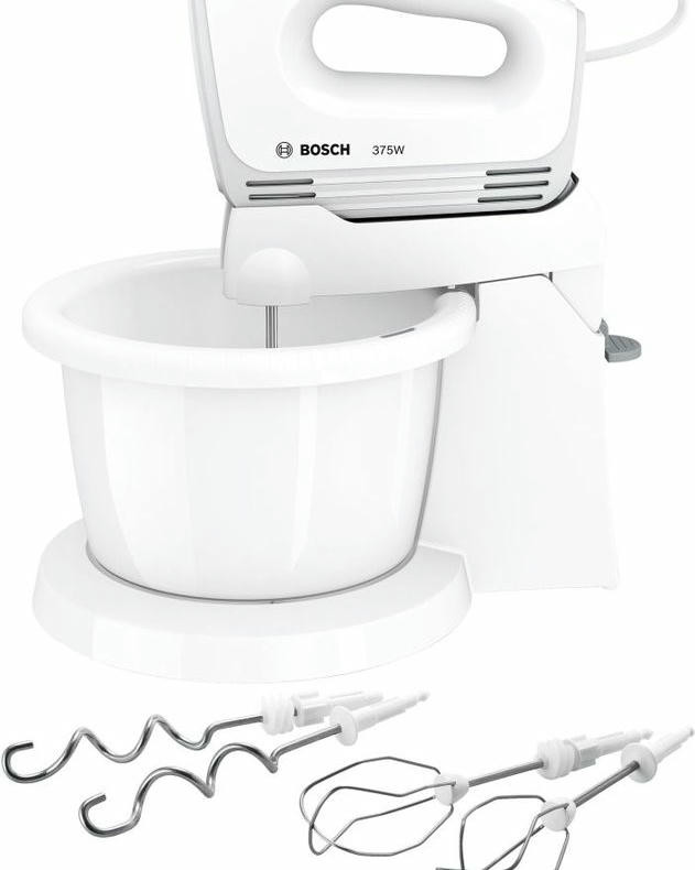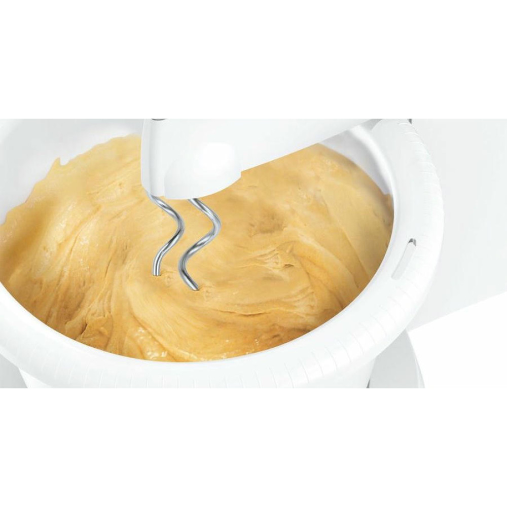 Миксер Bosch MFQ2600W оснащен чашей на подставке, которая вращается во время замешивания помимо самих насадок. Турбо-режим для твердых ингредиентов и 4 скорости вращения позволят выбрать наиболее подходящую для разных типов продуктов. Прибор можно снять с подставки и использовать как ручной, небольшой вес устройства обесепечит длительное замешивание.