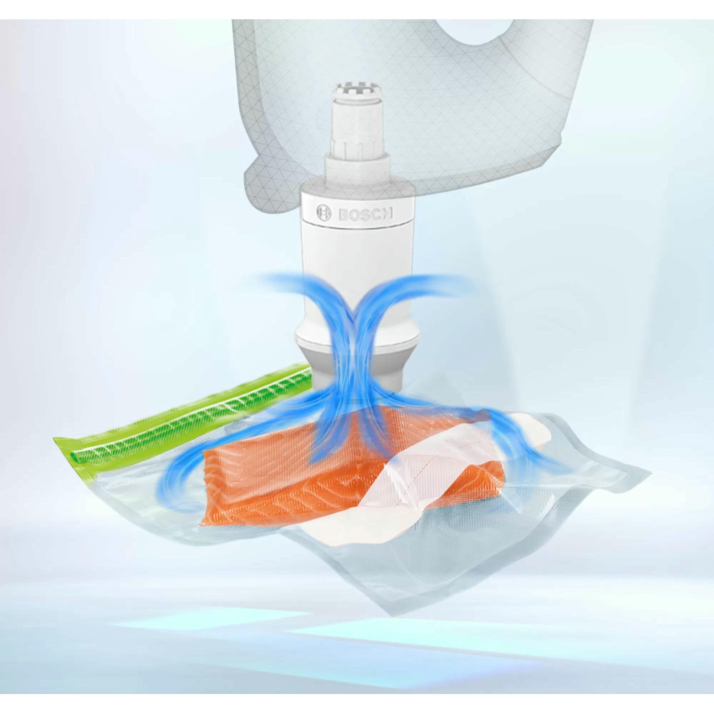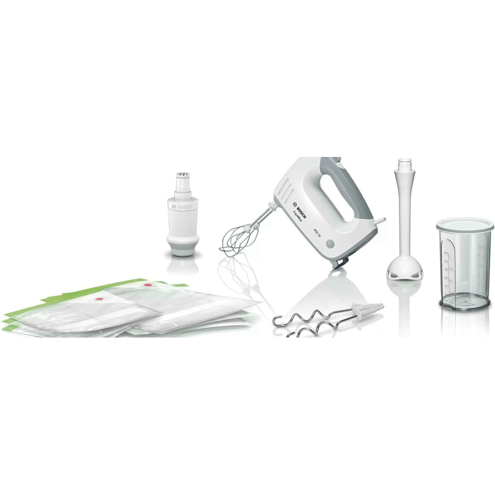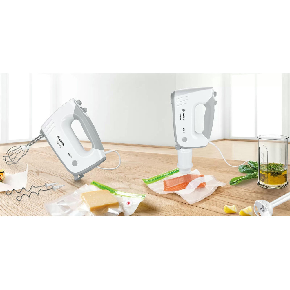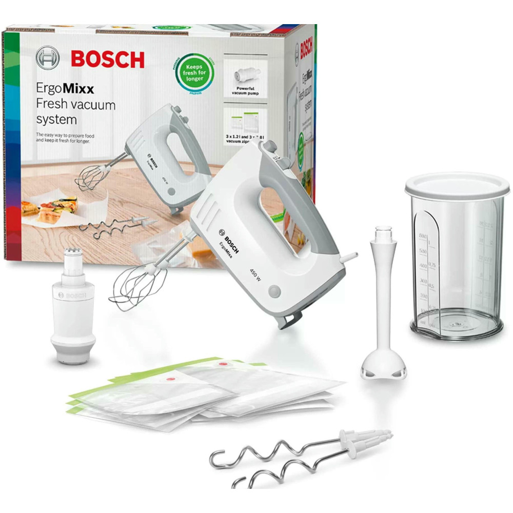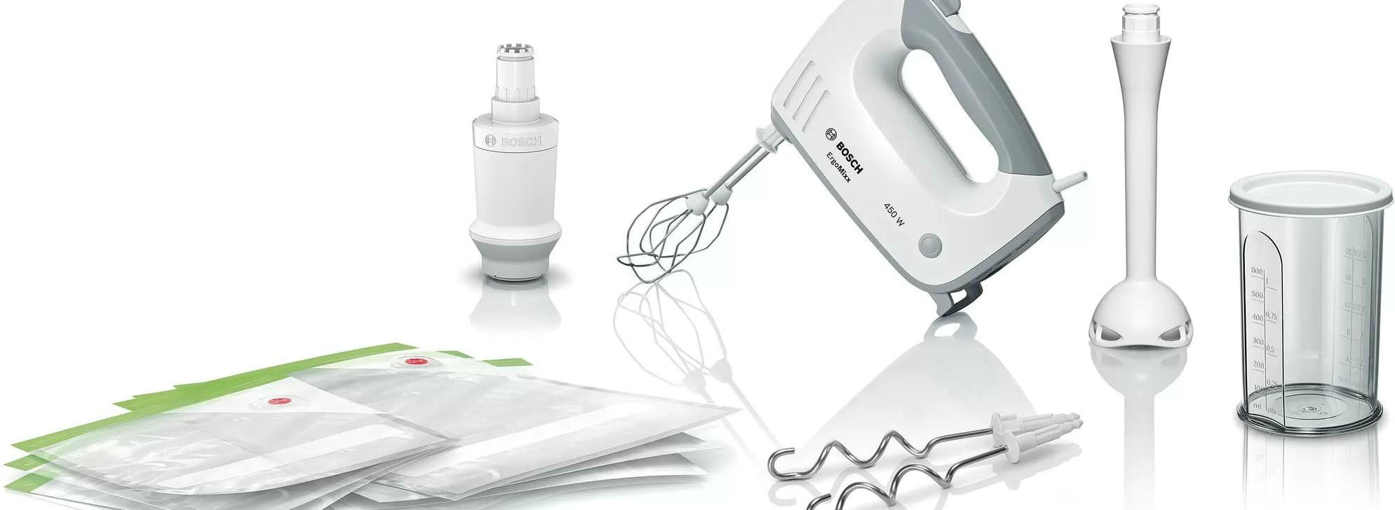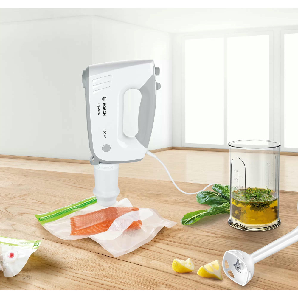 Миксер Bosch MFQ364V0 относится к линейке ErgoMixx и обладает удобной эргономичной ручкой с мягким покрытием Soft-touch и большими кнопками. В приборе имеется функция вакуумирования с 3 пакетами объемом 1,2 и 3,8 л. Ножка блендера из термоустойчивого пластика с ножами из нержавеющей стали легко взобьет или пошинкует различные продукты. Используя пять скоростных режимов, вы можете смешать любой ингредиент до желаемой консистенции, от низкой скорости для смешивания до максимальной для взбивания яичных белков.