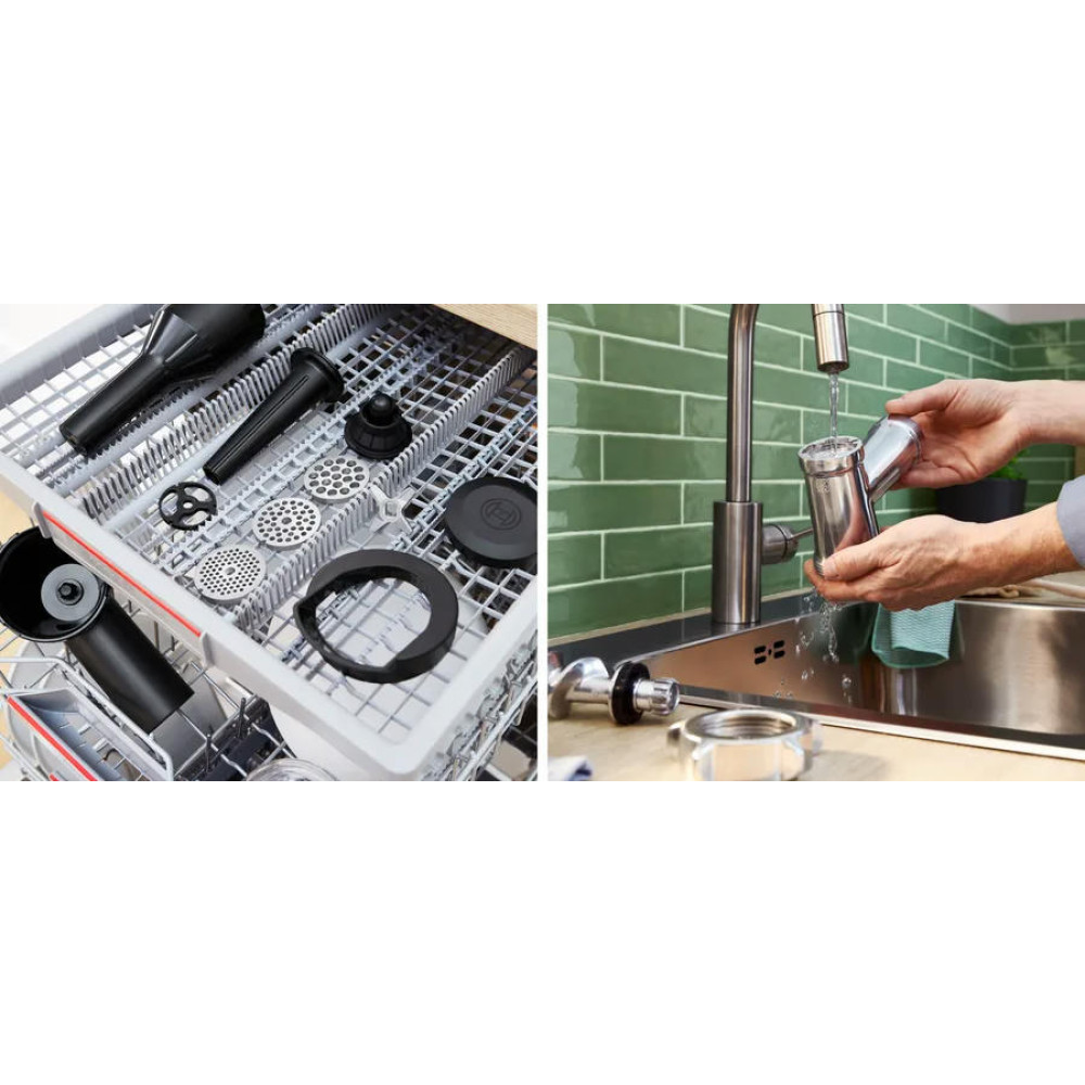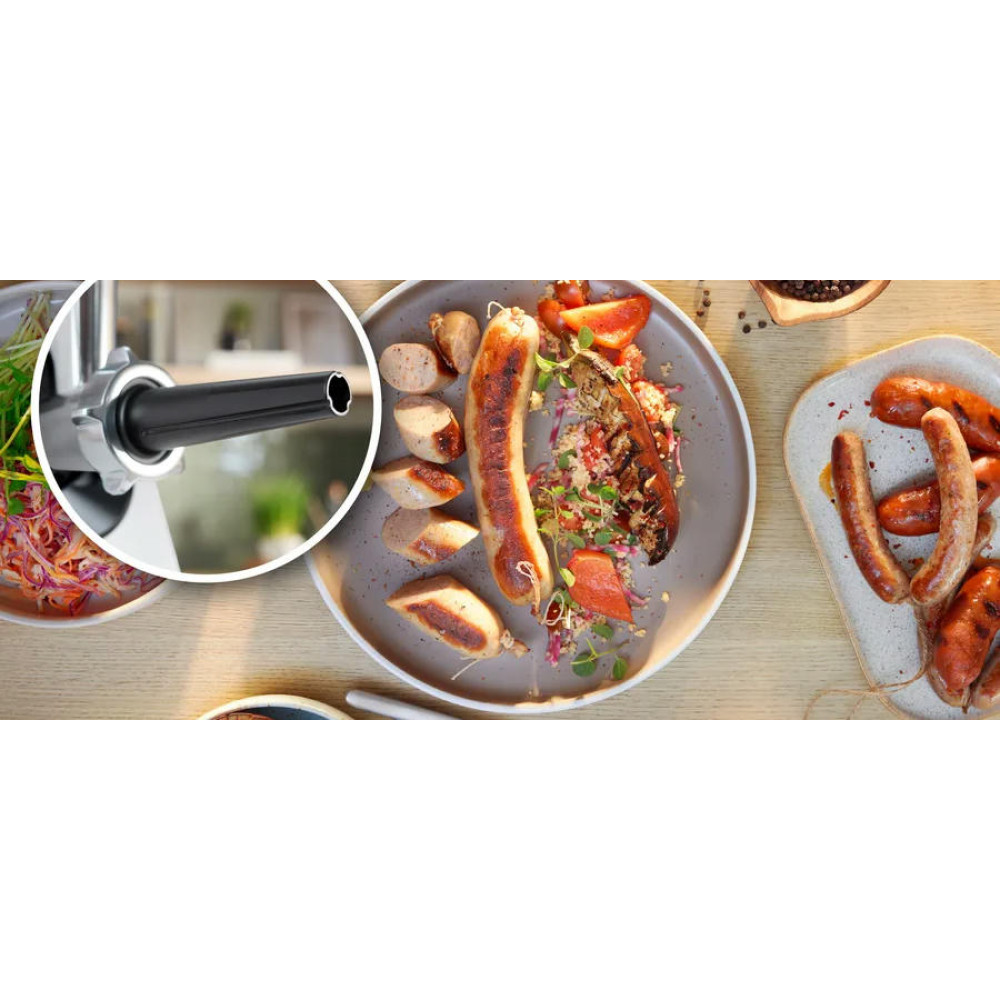 Особенностью модели является наличие насадки для приготовления колбас, что расширяет возможности использования мясорубки. Универсальный толкатель обеспечивает равномерное прохождение продуктов через мясорубку, а загрузочный лоток из пластика удобен в использовании.
