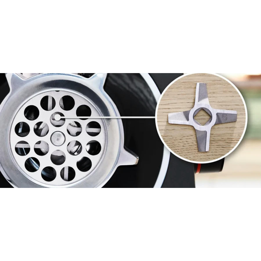 Кроме того, в комплекте с мясорубкой предусмотрены формовочные диски для фарша разного диаметра (3, 4.8 и 8 мм), что позволяет варьировать консистенцию фарша в зависимости от ваших кулинарных предпочтений. Насадка для приготовления колбас и насадка для кеббе делают эту модель идеальной для любителей домашнего приготовления мясных продуктов. Универсальный толкатель, входящий в комплект, облегчает процесс загрузки мяса в мясорубку. Загрузочный лоток выполнен из пластика, что обеспечивает его долговечность и удобство в использовании. Прорезиненные ножки обеспечивают устойчивость мясорубки на поверхности стола или столешницы. Мощность мясорубки составляет 500 Вт, что обеспечивает высокую производительность - до 2.5 кг фарша в минуту. Система реверса позволяет избежать засорения и продлевает срок службы устройства.