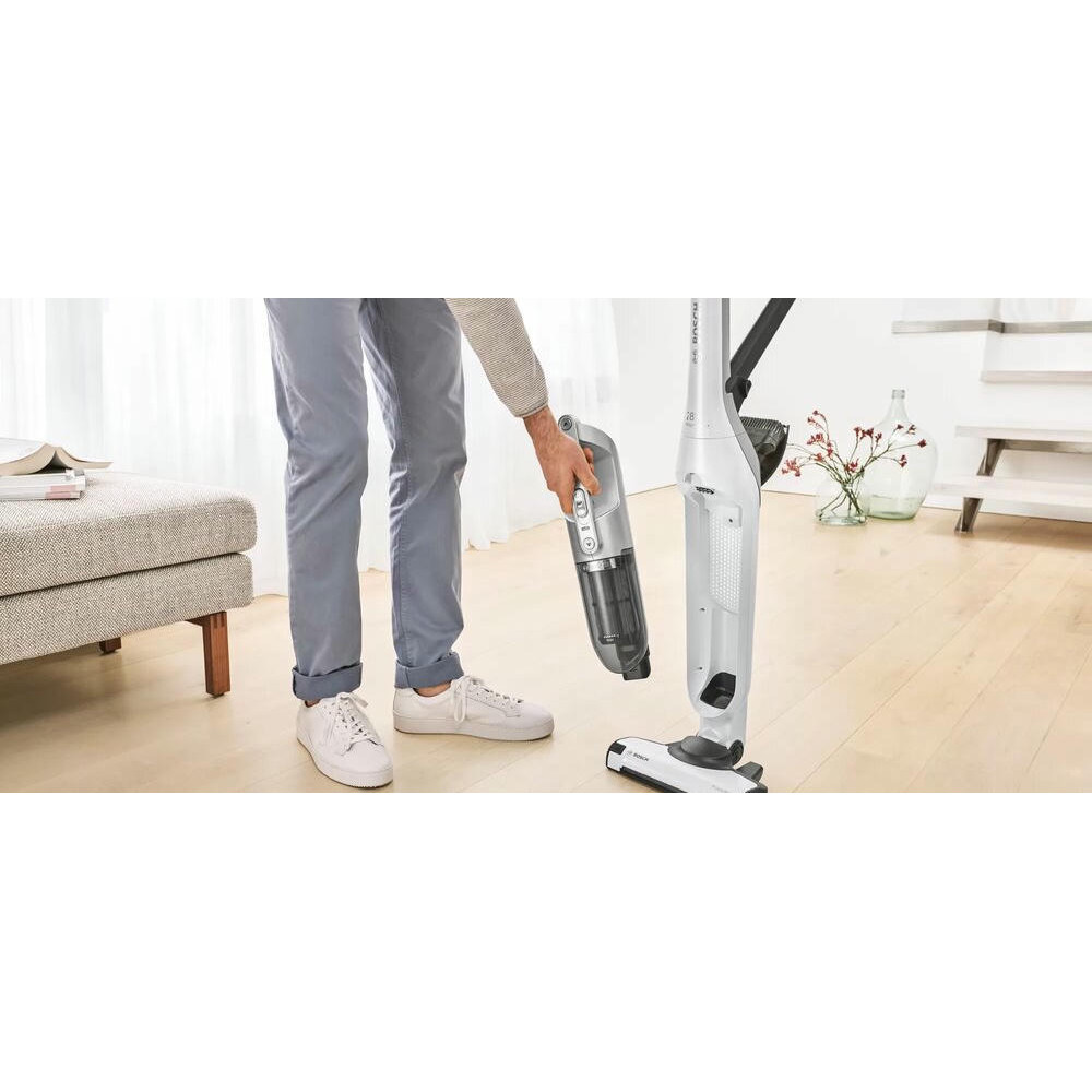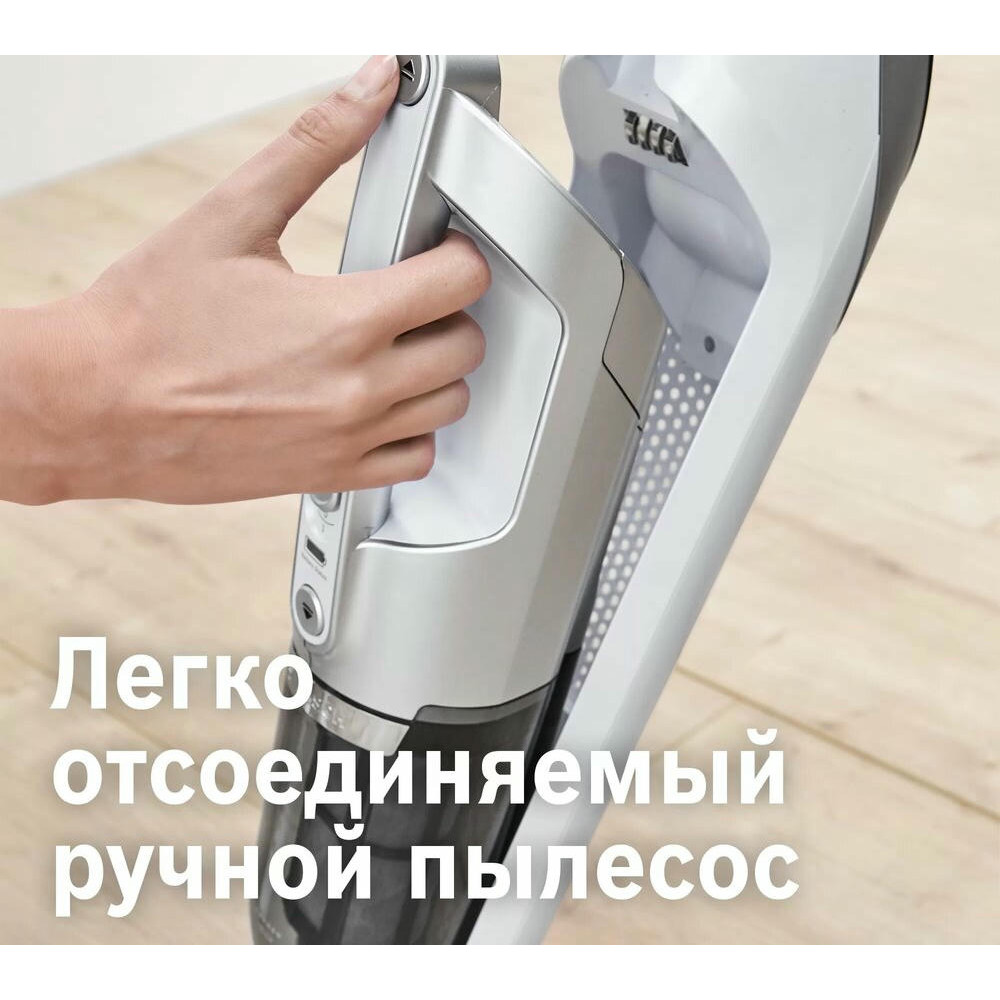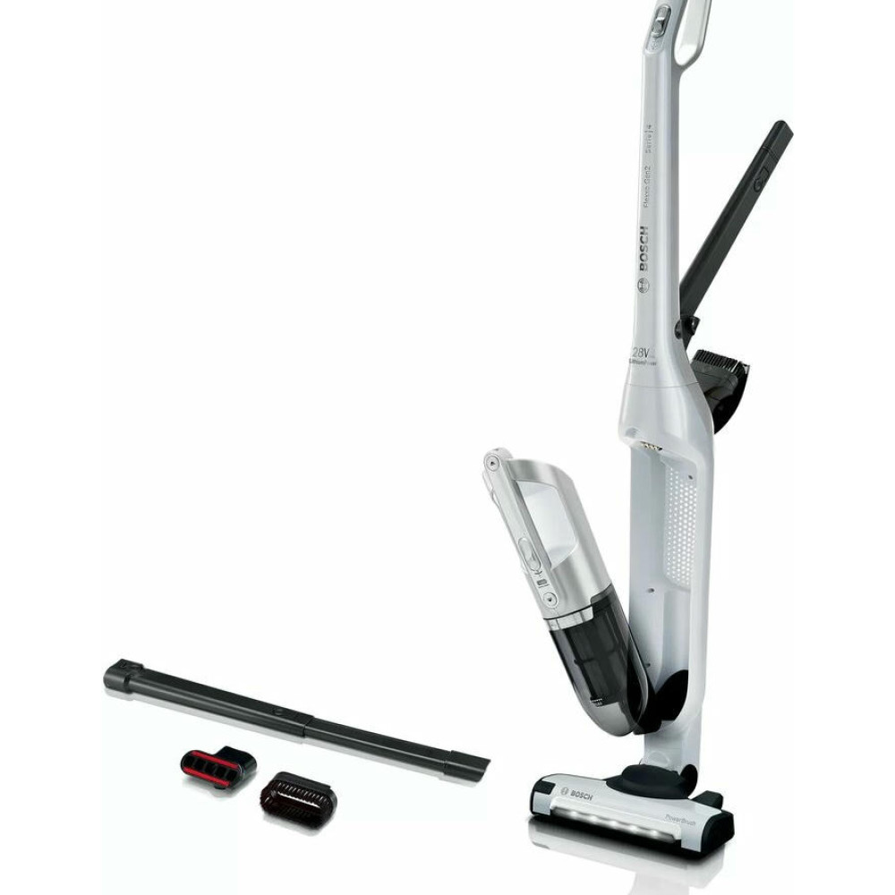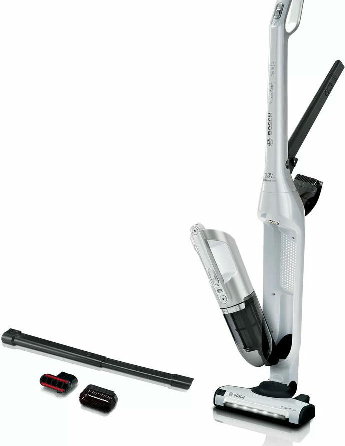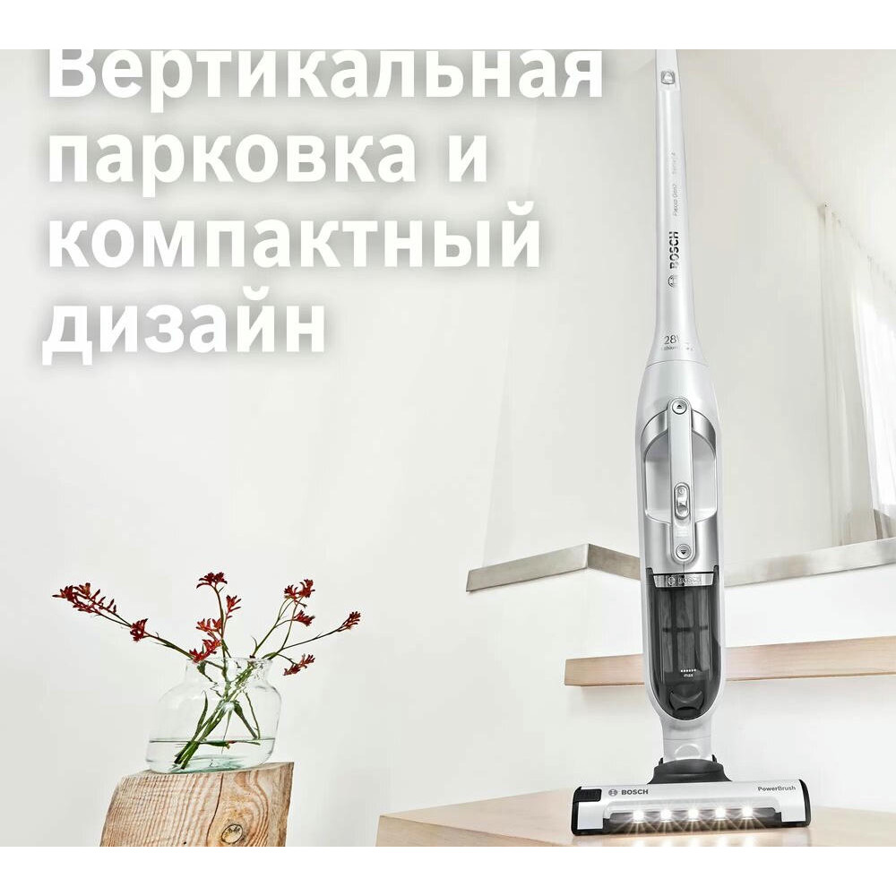 Пылесос Bosch BBH3ALL28 — это удобная модель в эксплуатации, выполненная в черно-серебристом цвете. Она не займет у вас много места в помещении, поскольку ее габариты небольшие: высота — 115 см, ширина — 26,5 см, глубина — 18 см. Это вертикальная техника, обладающая сухим типом уборки. Аккумулятор может работать от Li-ion или Ni-Mh элементов питания до 60 минут. За это время вы легко сможете сделать легкую и быструю, но при этом качественную уборку. Модель удобна лежит в руке, поэтому не стоит переживать о неудобстве. Время подзарядки — до 5 часов (100% заряда).