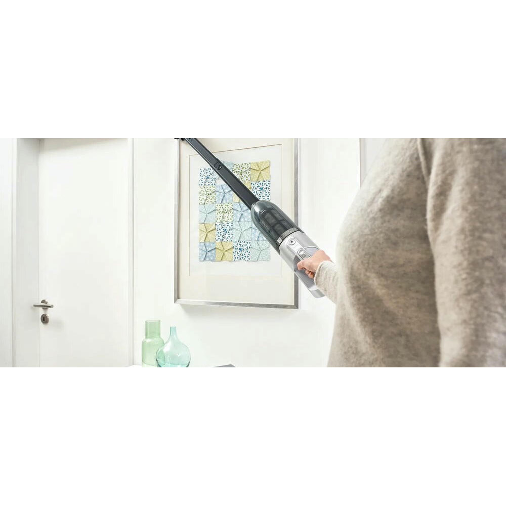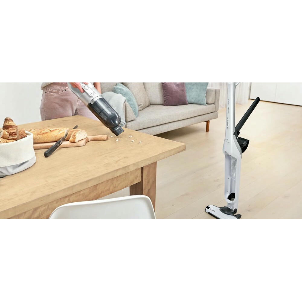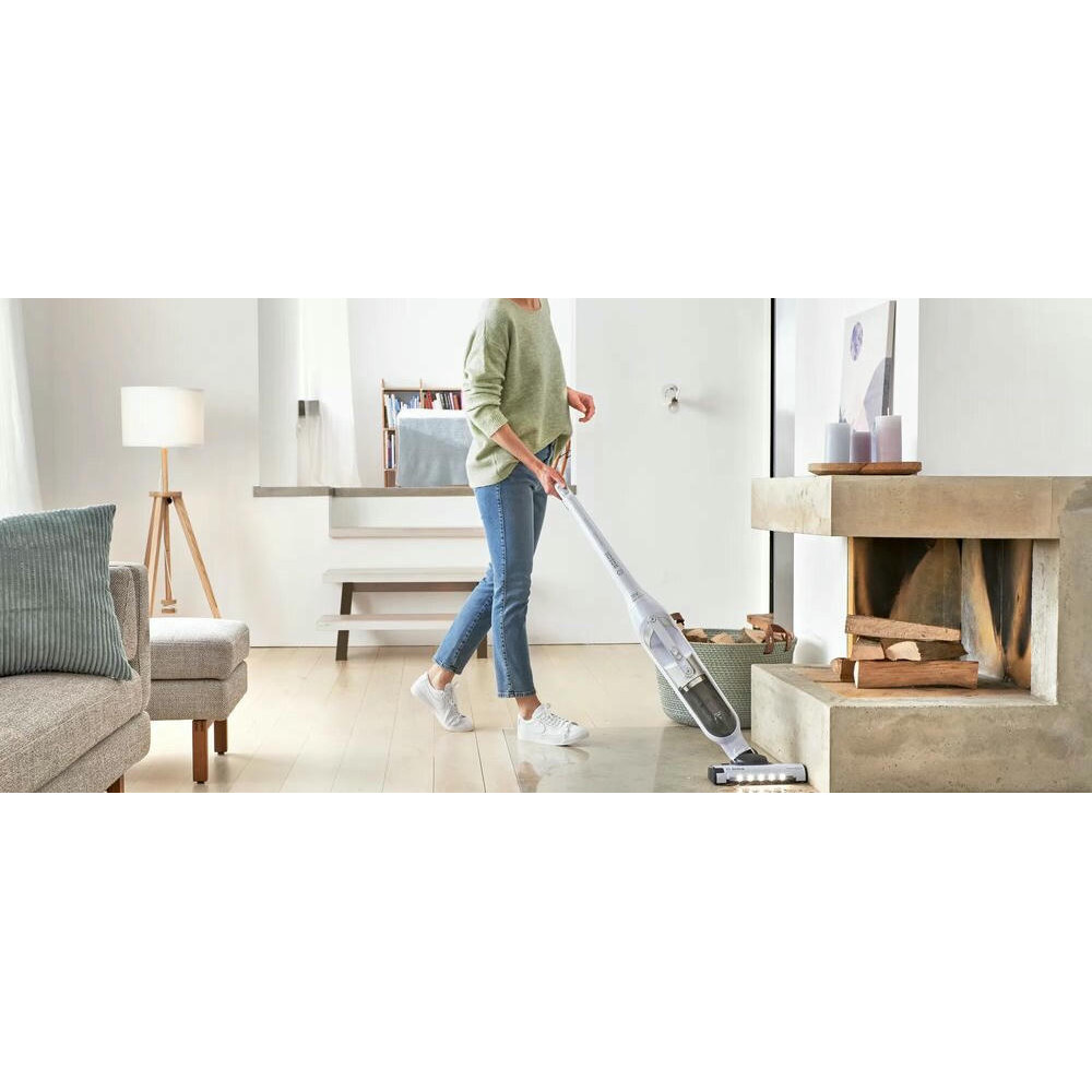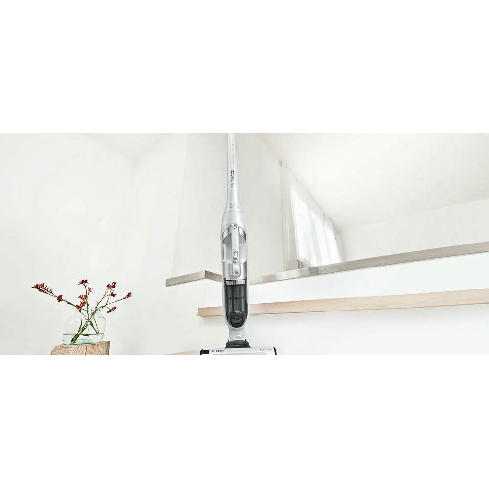 Пылесос Bosch BBH3ALL28 — это удобная модель в эксплуатации, выполненная в черно-серебристом цвете. Она не займет у вас много места в помещении, поскольку ее габариты небольшие: высота — 115 см, ширина — 26,5 см, глубина — 18 см. Это вертикальная техника, обладающая сухим типом уборки. Аккумулятор может работать от Li-ion или Ni-Mh элементов питания до 60 минут. За это время вы легко сможете сделать легкую и быструю, но при этом качественную уборку. Модель удобна лежит в руке, поэтому не стоит переживать о неудобстве. Время подзарядки — до 5 часов (100% заряда).