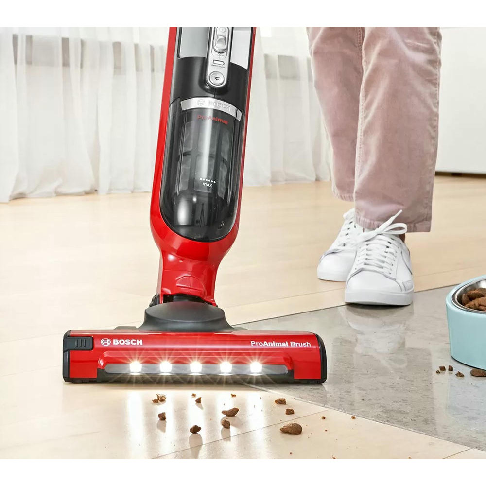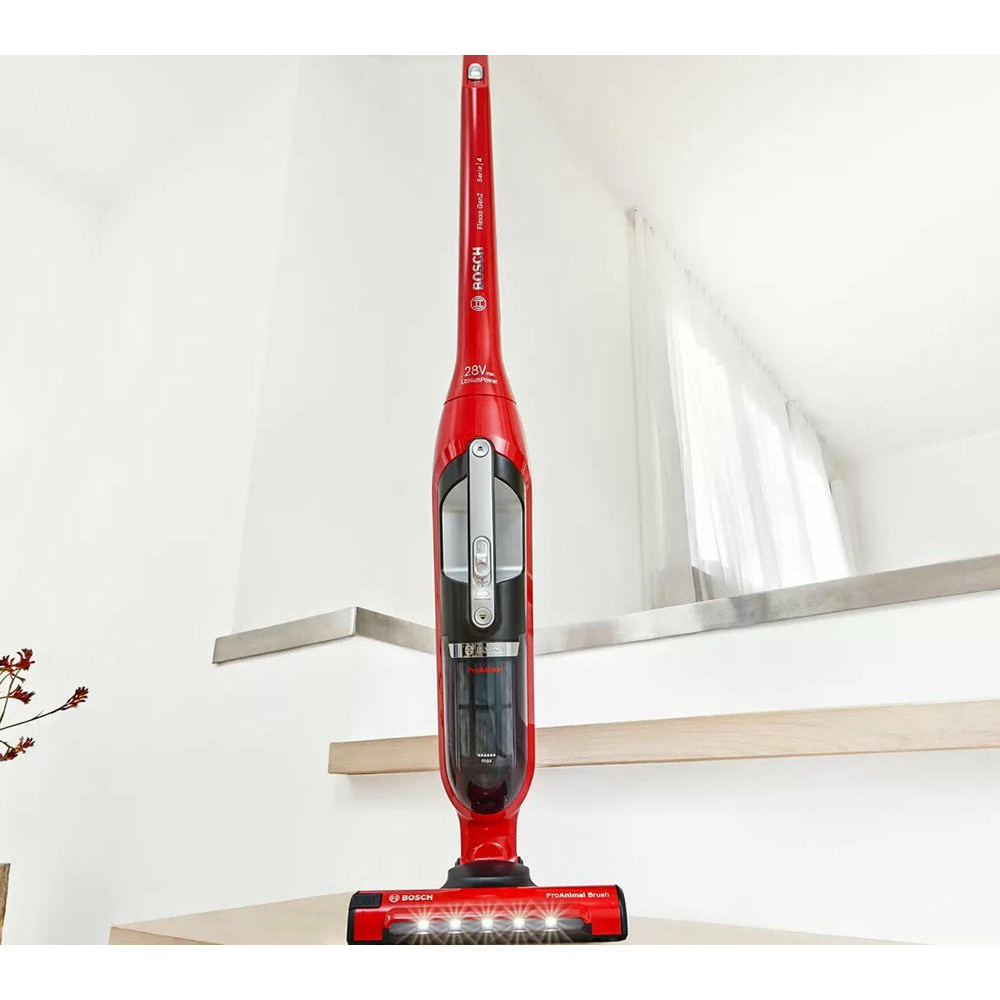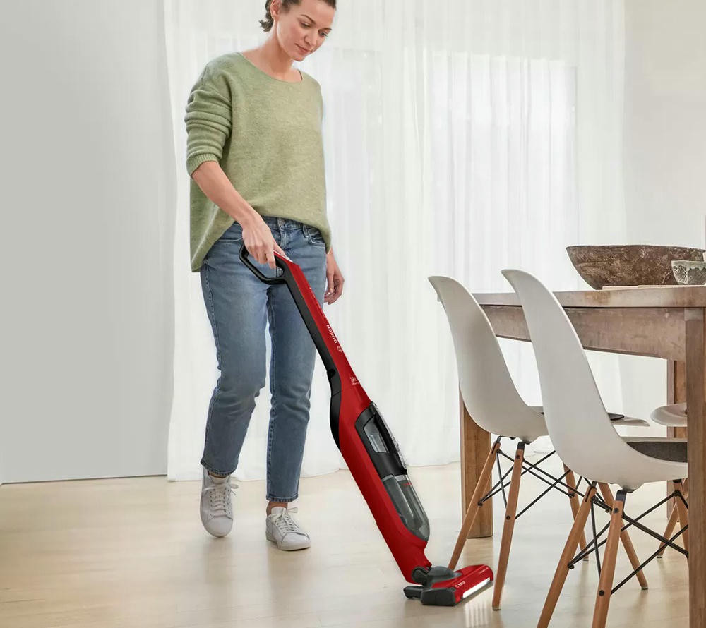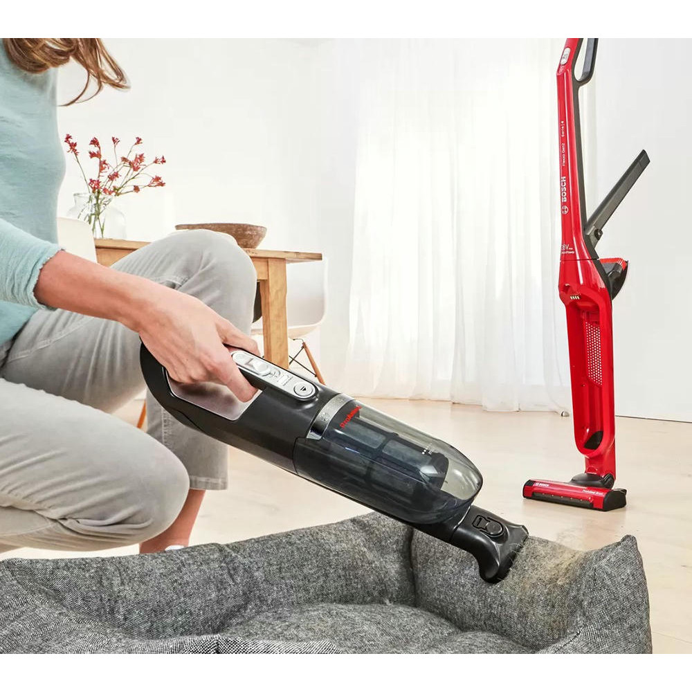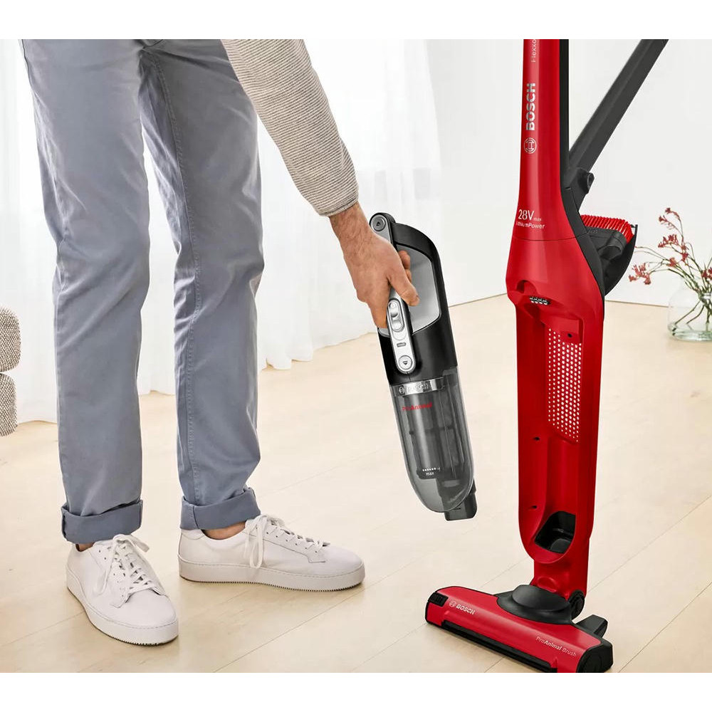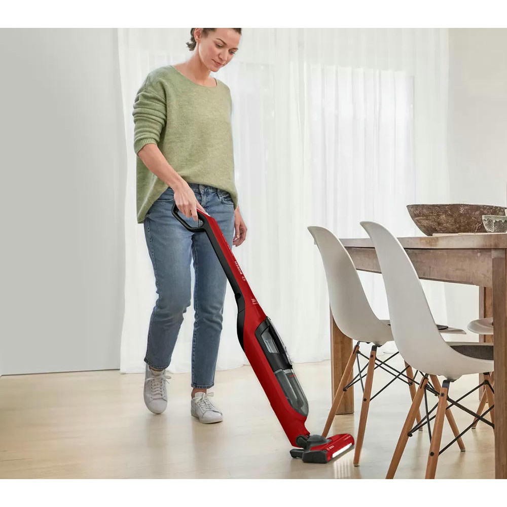 Пылесос Bosch BBH3ZOO28 подходит только для сухой уборки. Применена циклоническая система — воздух внутри пылесборника движется по спирали, поэтому волосы, шерсть и другой мусор сбиваются в плотный комок, который потом легко убрать. Емкости встроенной батареи хватит приблизительно на 55 минут непрерывного использования устройства. Мощность достигает 600 Вт. Также в наборе идут три дополнительные насадки для эффективной очистки различных поверхностей. Показатель шума в процессе работы не превышает 82 дБ.