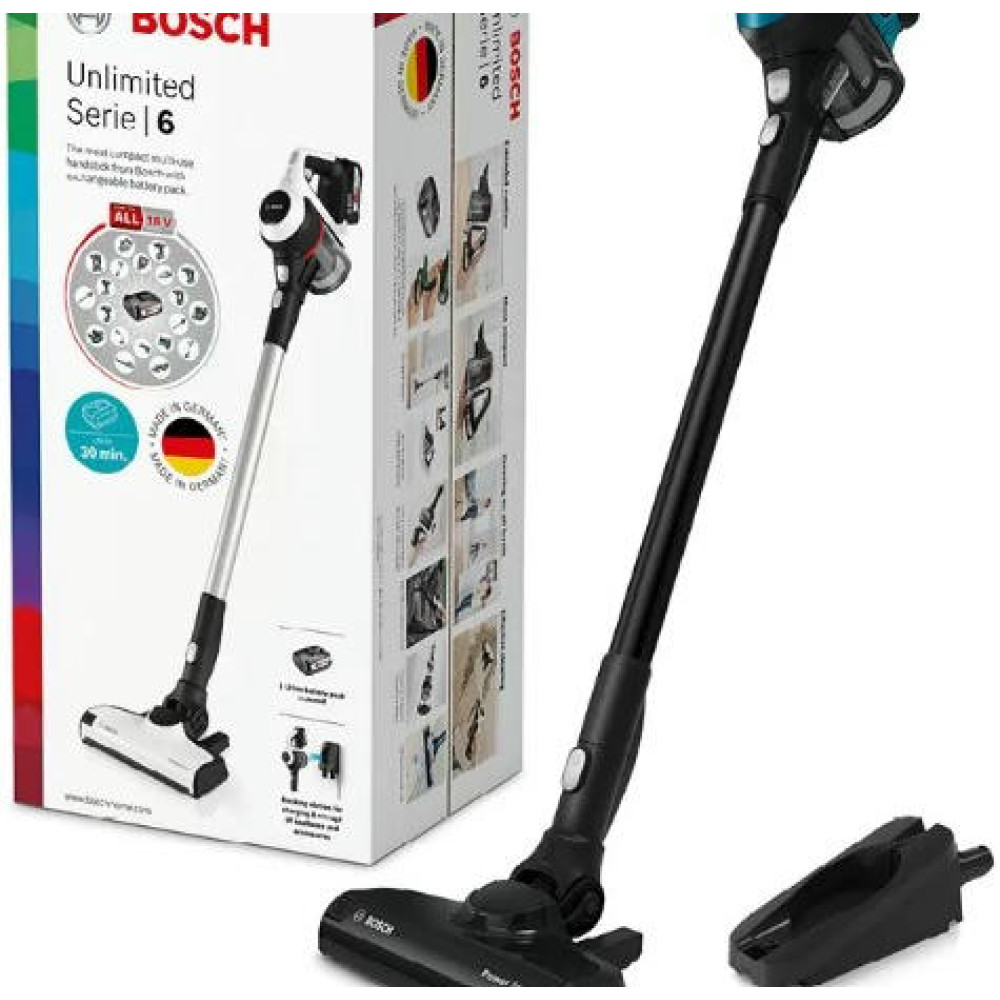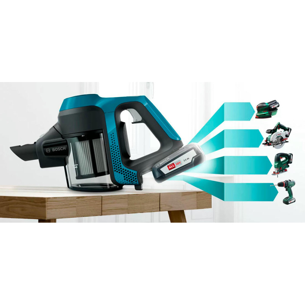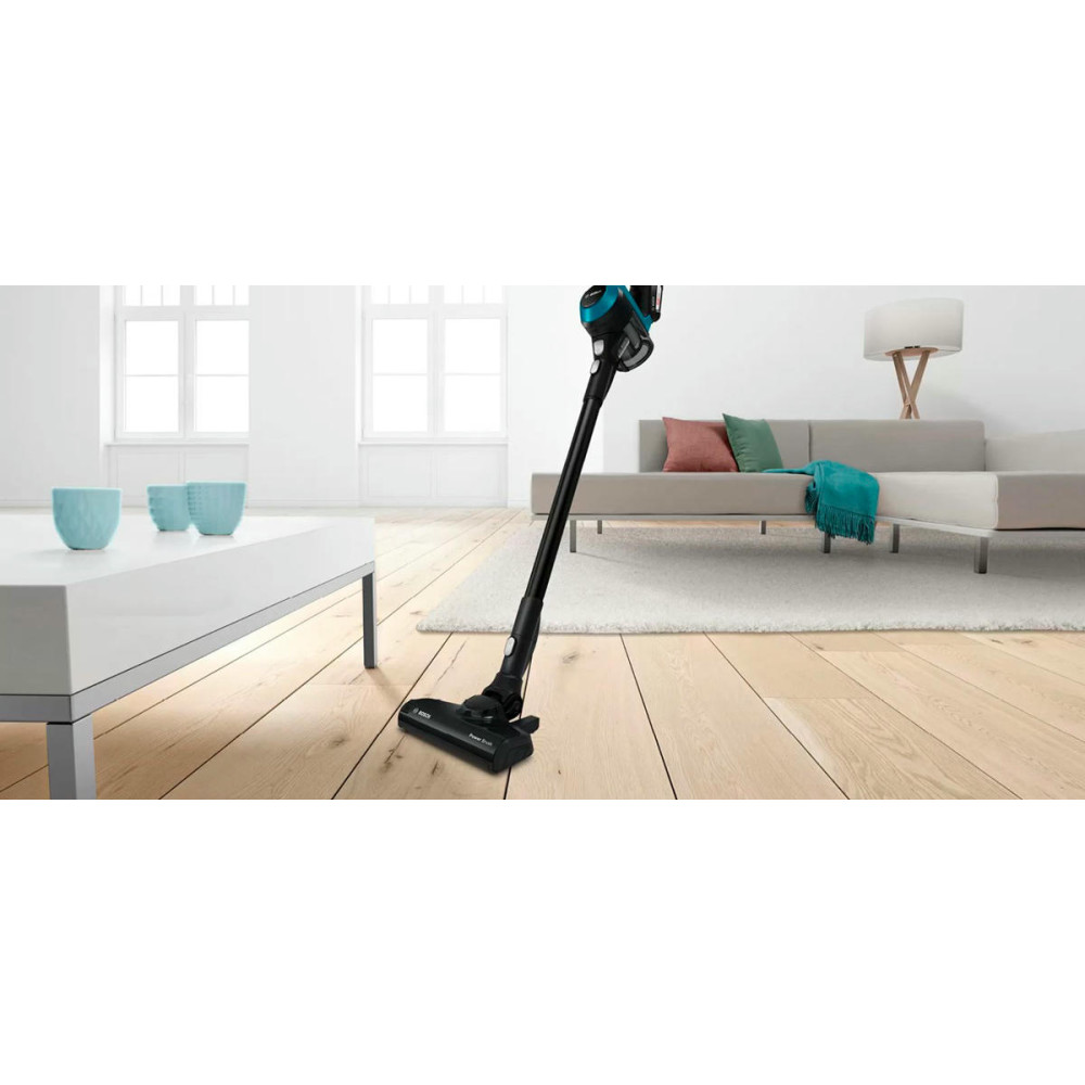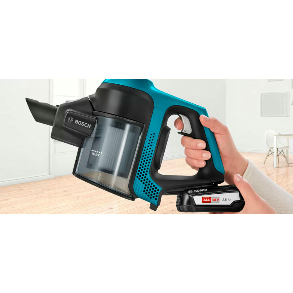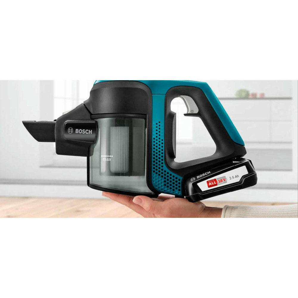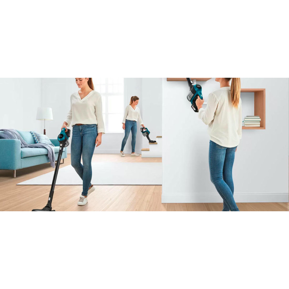 BOSCH BBS611LAG удаляет с поверхности весь мусор, который собирается в пластиковый контейнер и легко утилизируется по мере необходимости. Прибор осуществляет только сухую уборку, работает от аккумулятора, полная зарядка которого происходит за 6 часов. Современный безщеточный мотор DigitalSpin обладает отличными характеристиками и уровнем шума до 80 дБ в процессе эксплуатации. Панель управления находится на ручке и представляет собой регулятор мощности, состоящий из двух режимов. В стандартной комплектации идет электрощетка PowerBrush, зарядное устройство и сменная аккумуляторная батарея. Хранение предусмотрено в вертикальном положении. Гарантия от производителя составляет 12 месяцев.