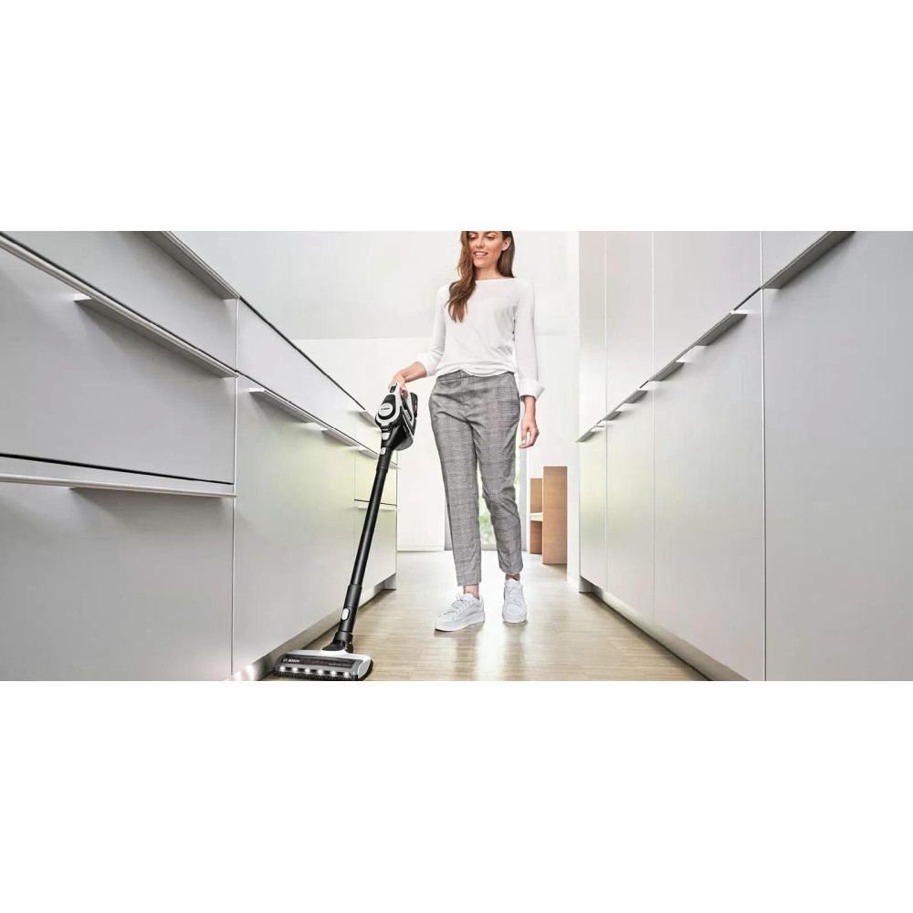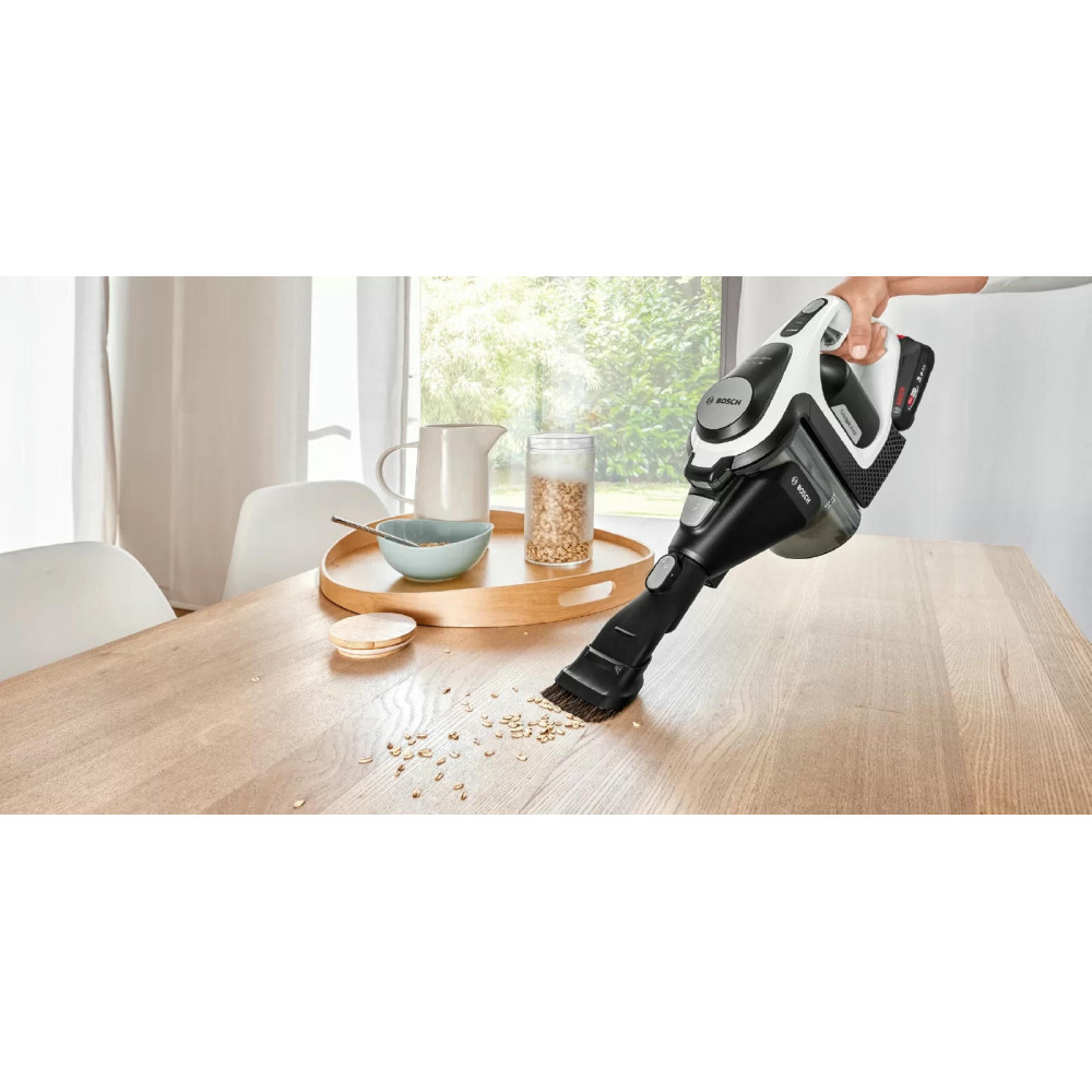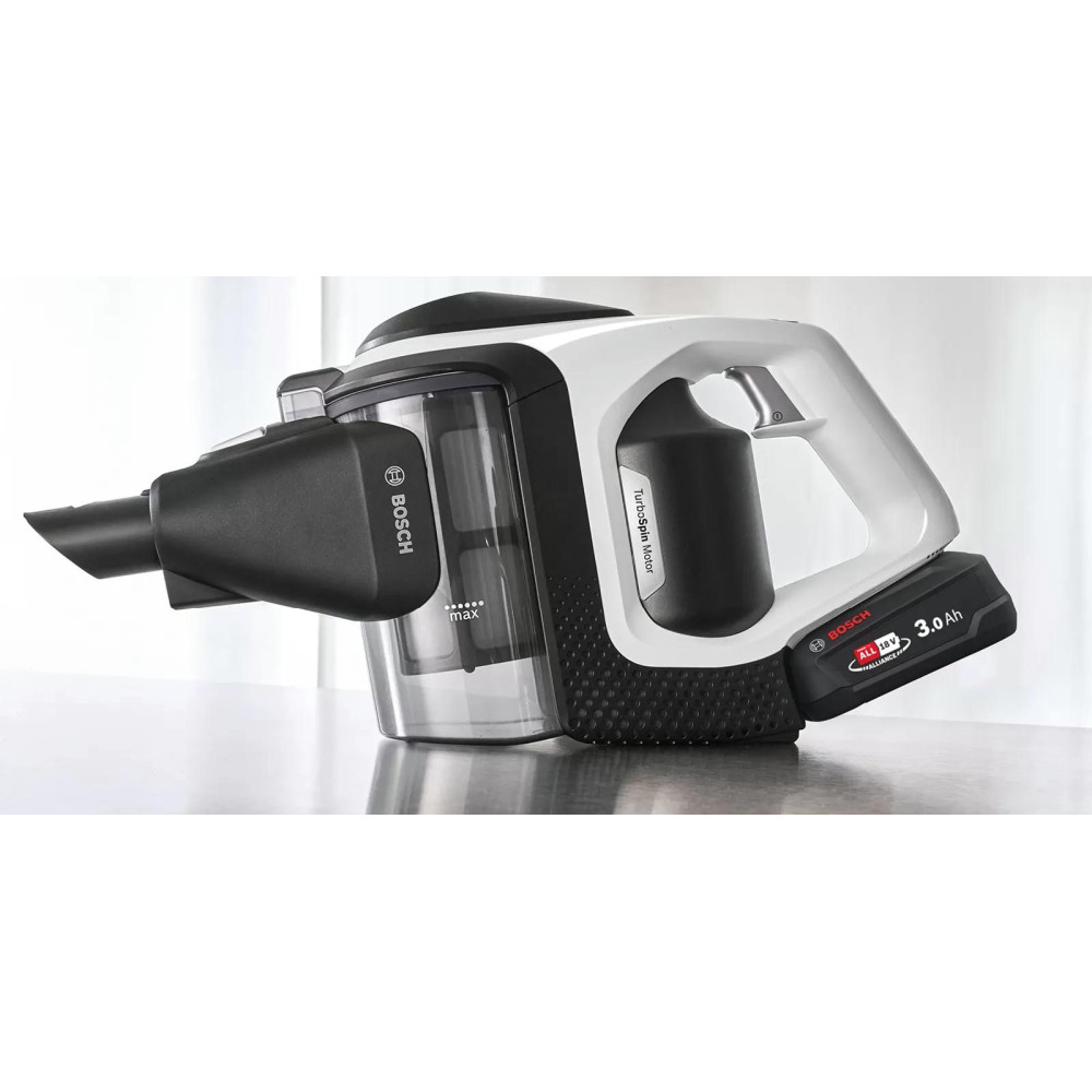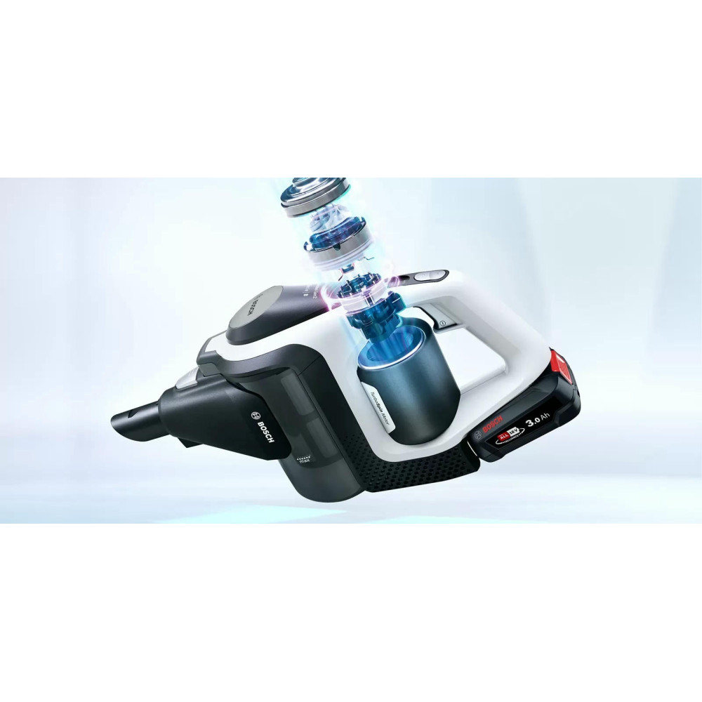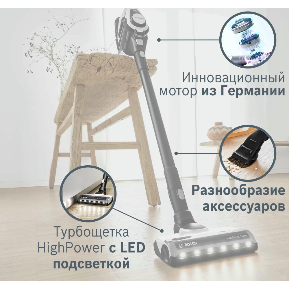Пылесос Bosch BBS8213W работает без проводов на основе аккумулятора, при этом характеризуется высокой производительностью с поглощением до 99.9% пыли. Турбощетка AllFloor HighPower со светодиодной подсветкой обеспечивает тщательную уборку на различных покрытиях. Сбор пыли осуществляется в контейнер емкостью 0.4 л. На рукоятке расположены кнопки регулировки уровня мощности. Аккумулятор гарантирует в пределах 45 минут автономной работы и отличается быстрым процессом восстановления заряда.