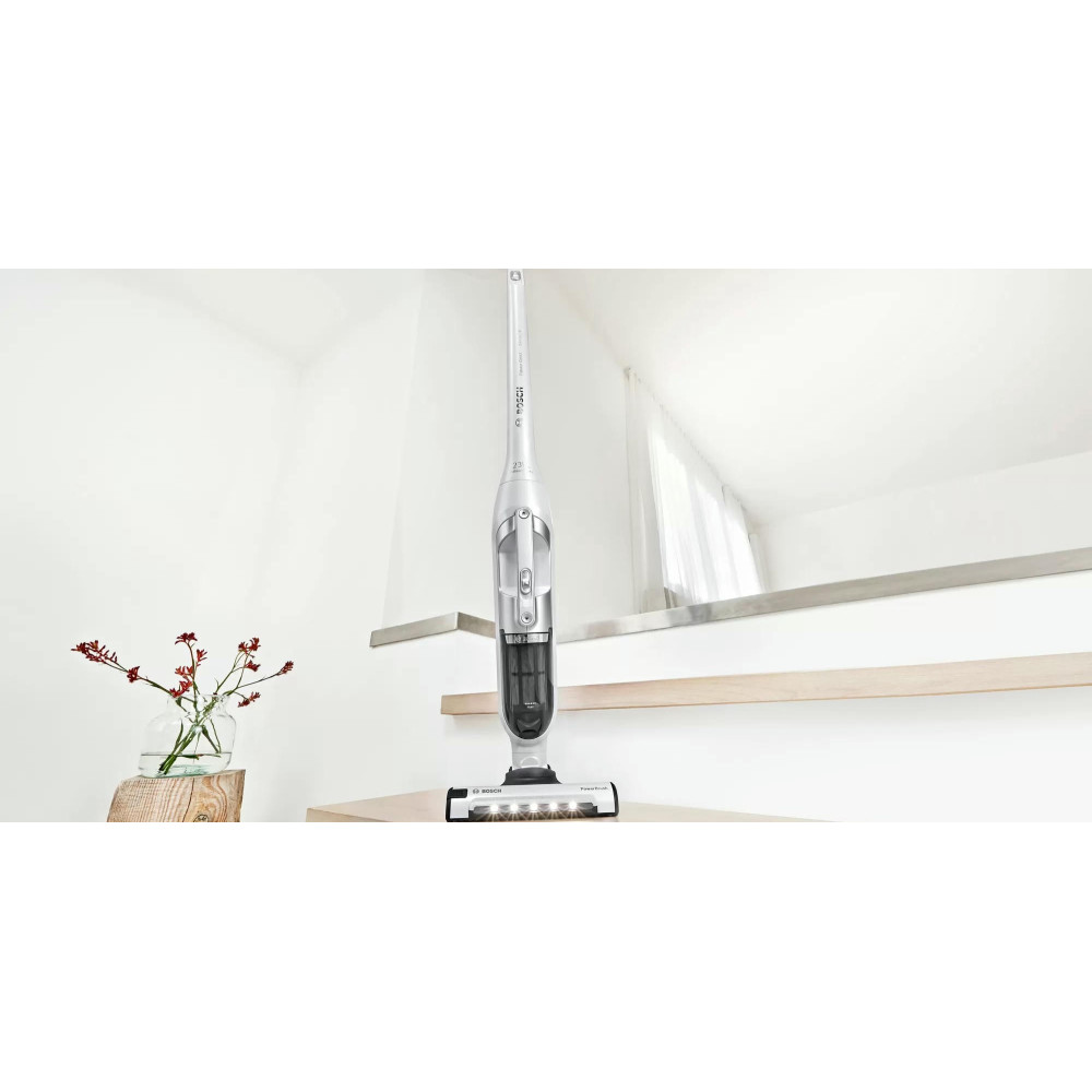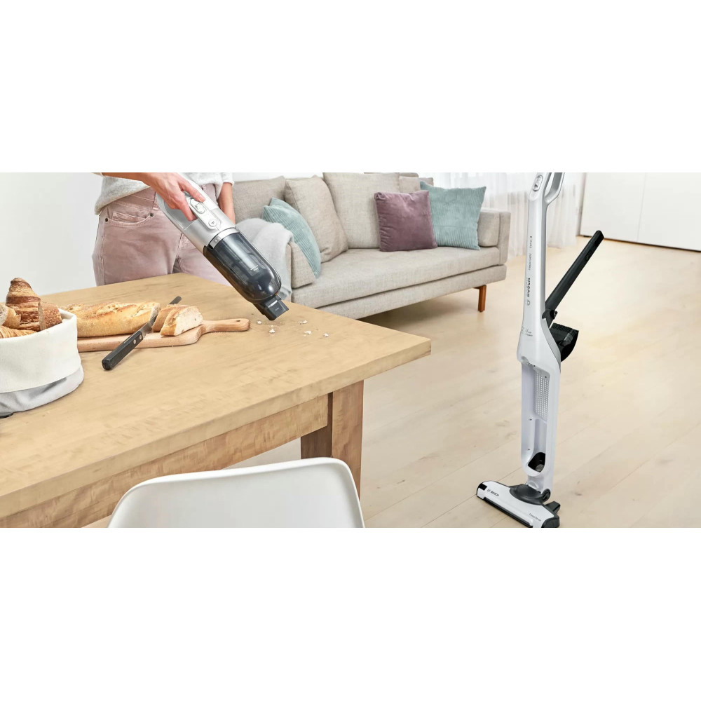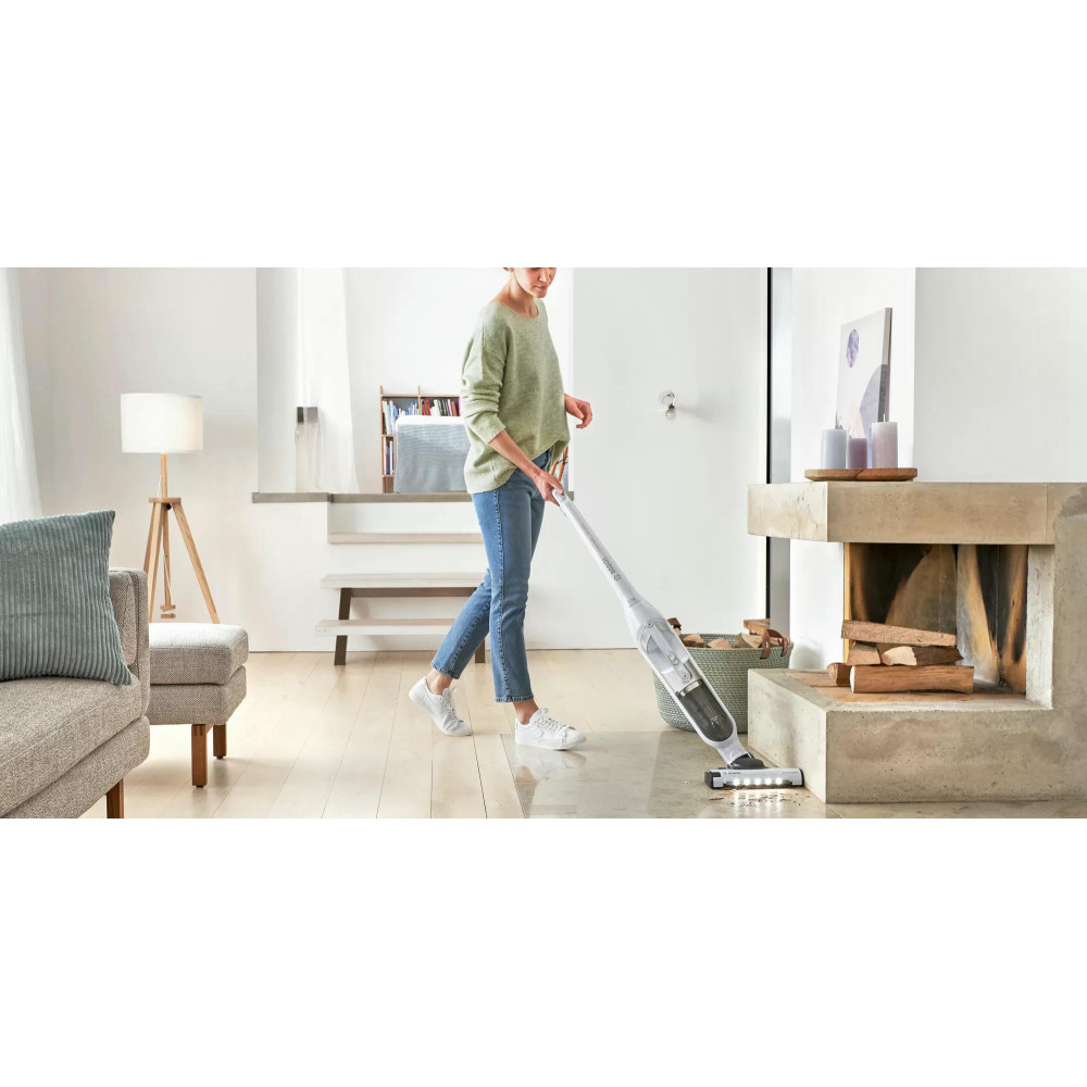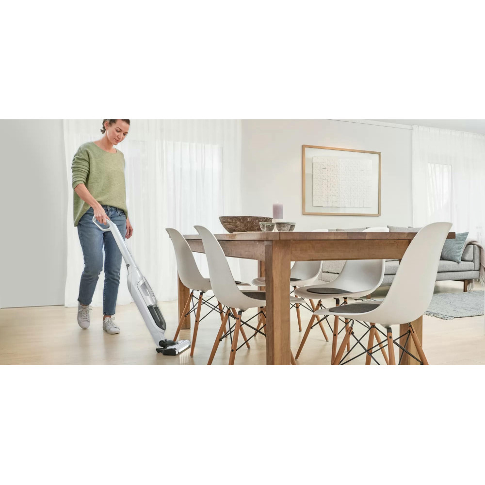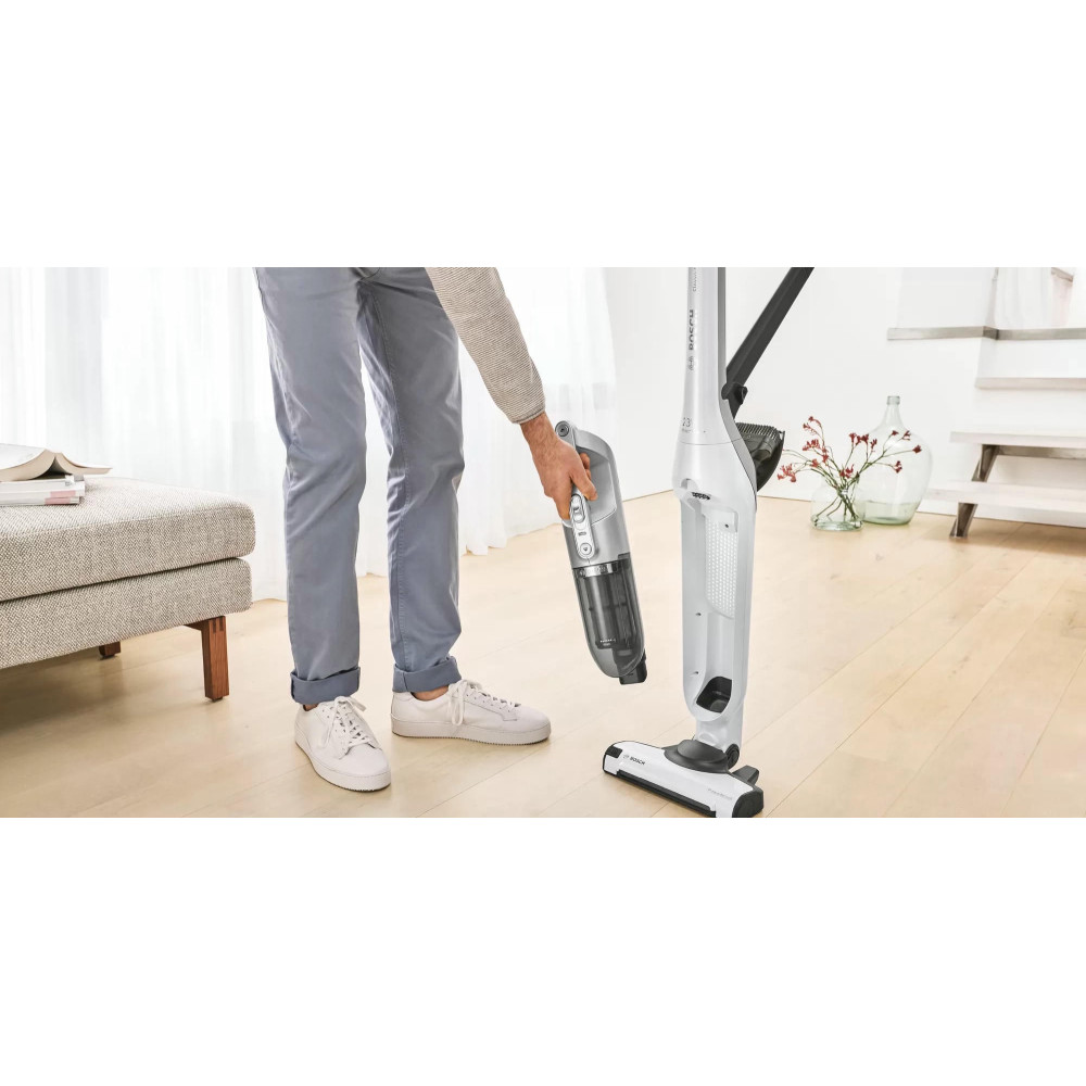 Пылесос Bosch BCH3P2301 занимает минимум места при хранении, ведь расположить его можно вертикально. При этом со своей главной задачей — уборкой в помещении, справляется прибор великолепно. Одного полного заряда аккумулятора достаточно, чтобы устройство до 50 мин работало без подключения к розетке. Конструкцию можно разбирать, чтобы получить портативную модель для уборки в труднодоступных местах, включая салон автомобиля.
