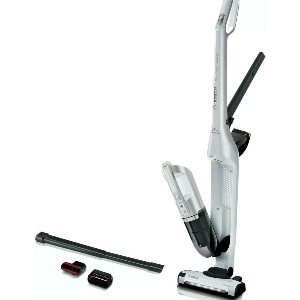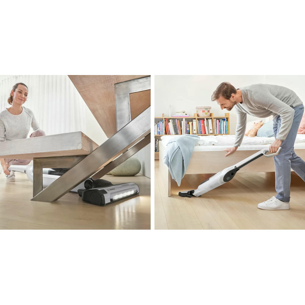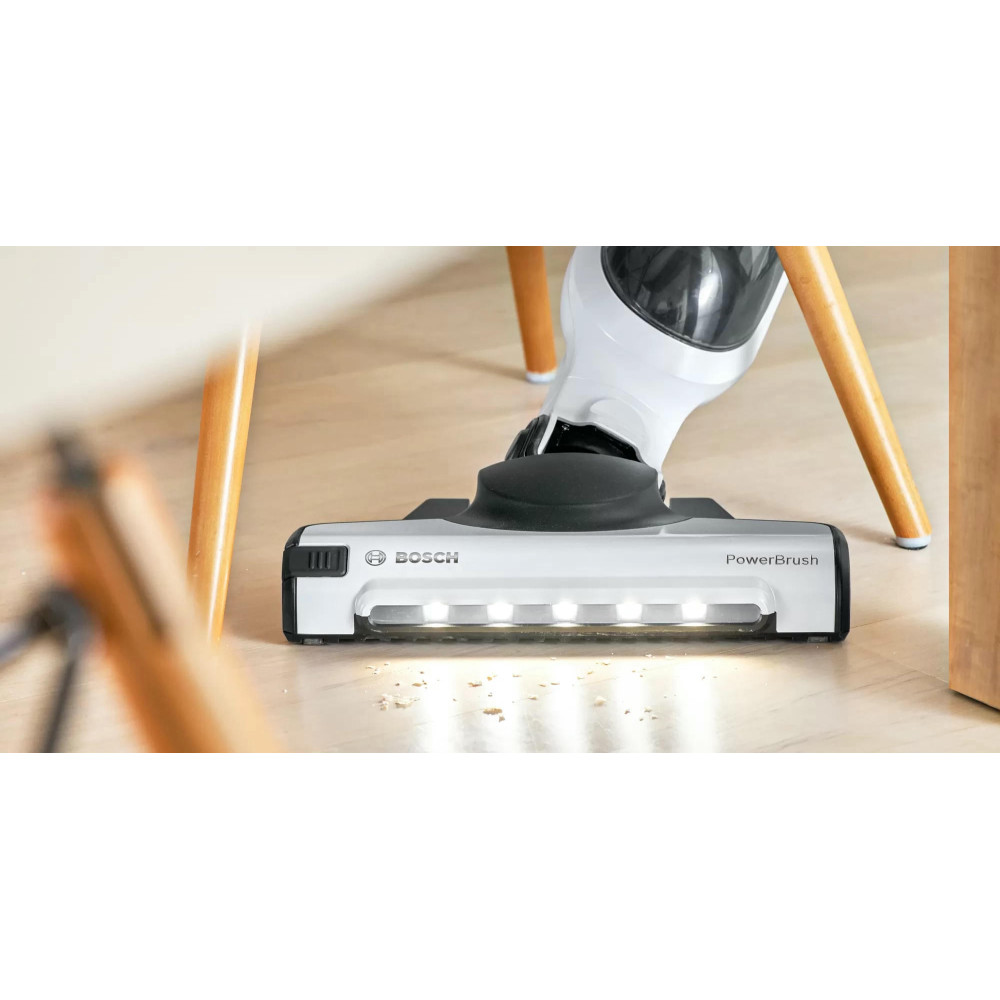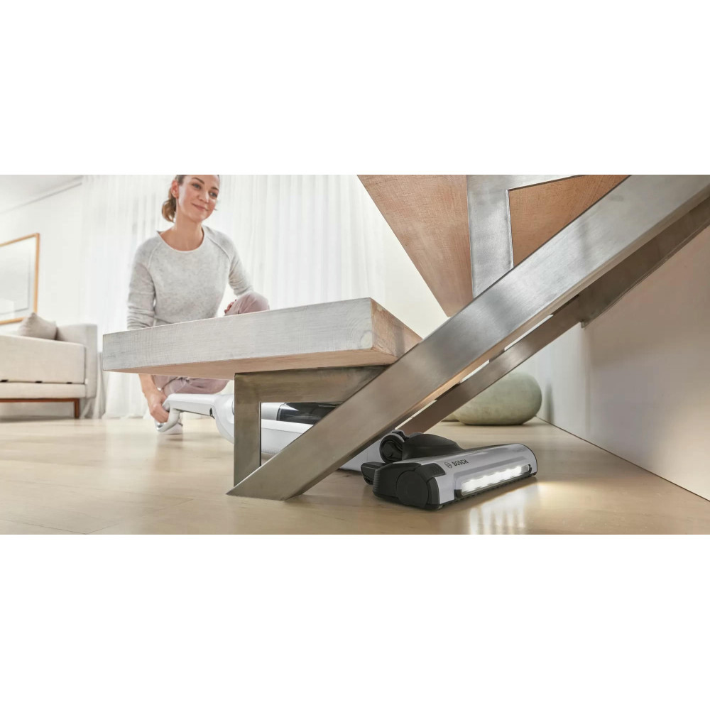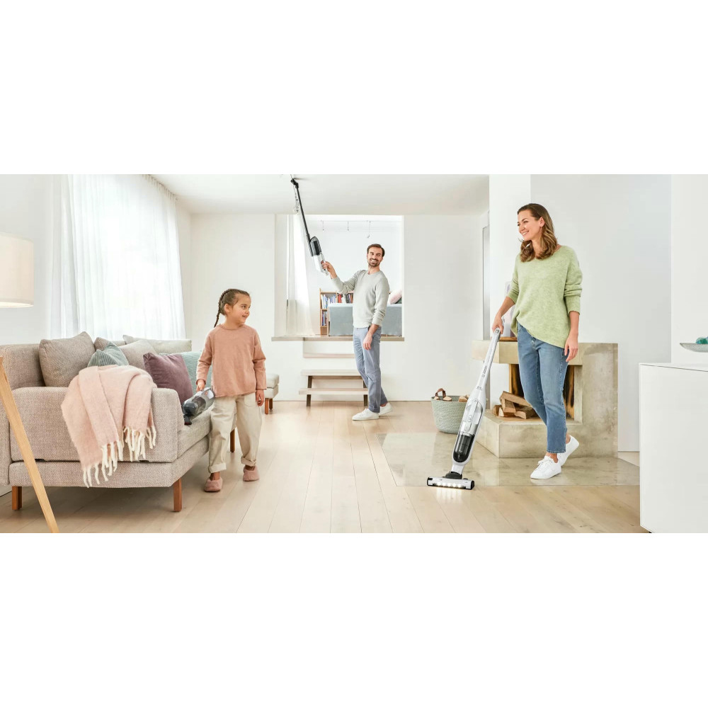 Пылесос Bosch BCH3P2301 занимает минимум места при хранении, ведь расположить его можно вертикально. При этом со своей главной задачей — уборкой в помещении, справляется прибор великолепно. Одного полного заряда аккумулятора достаточно, чтобы устройство до 50 мин работало без подключения к розетке. Конструкцию можно разбирать, чтобы получить портативную модель для уборки в труднодоступных местах, включая салон автомобиля.