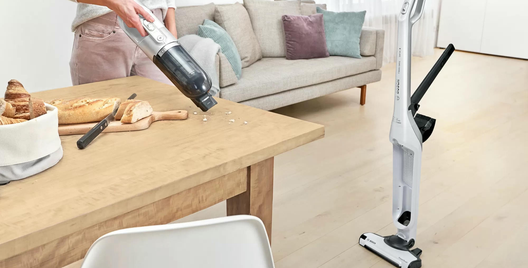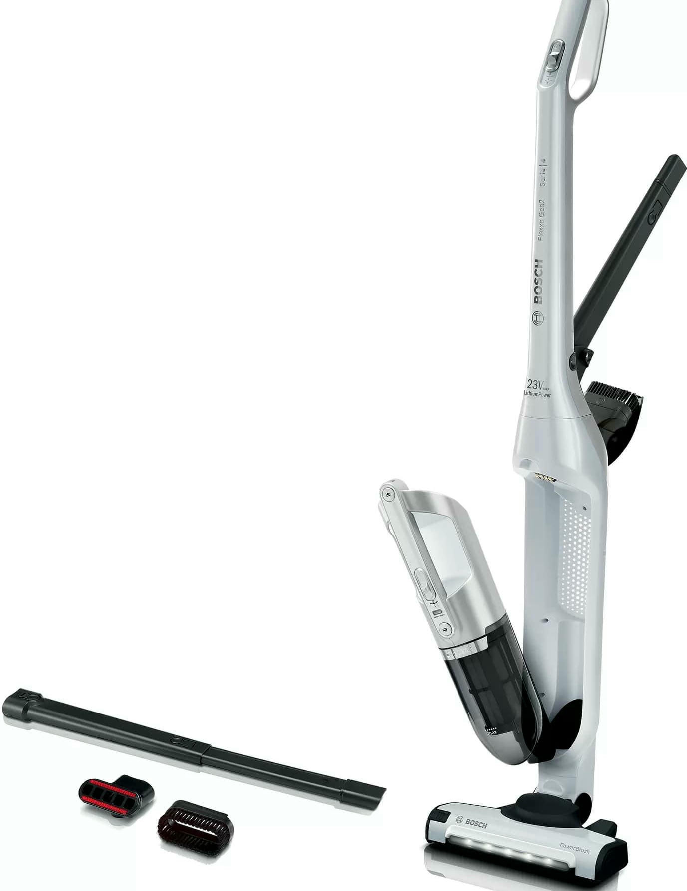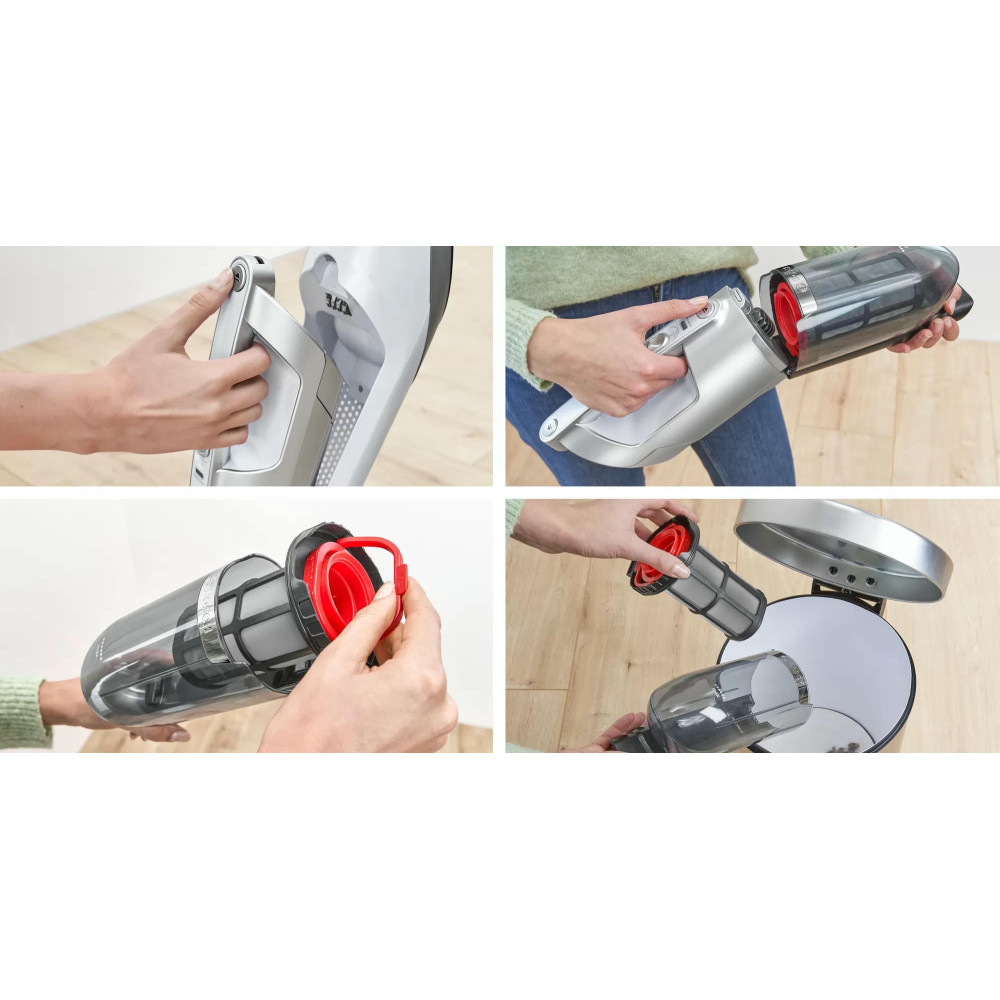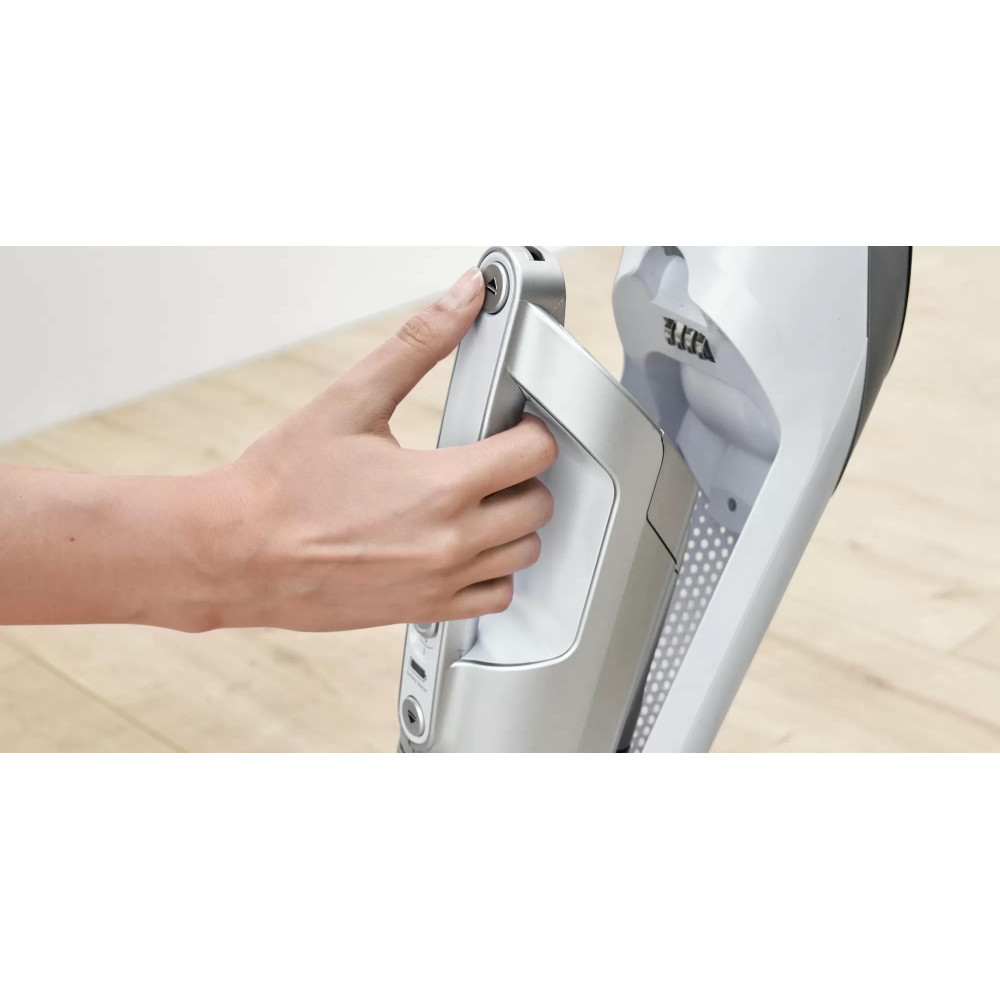 Пылесос Bosch BCH3P2301 занимает минимум места при хранении, ведь расположить его можно вертикально. При этом со своей главной задачей — уборкой в помещении, справляется прибор великолепно. Одного полного заряда аккумулятора достаточно, чтобы устройство до 50 мин работало без подключения к розетке. Конструкцию можно разбирать, чтобы получить портативную модель для уборки в труднодоступных местах, включая салон автомобиля.