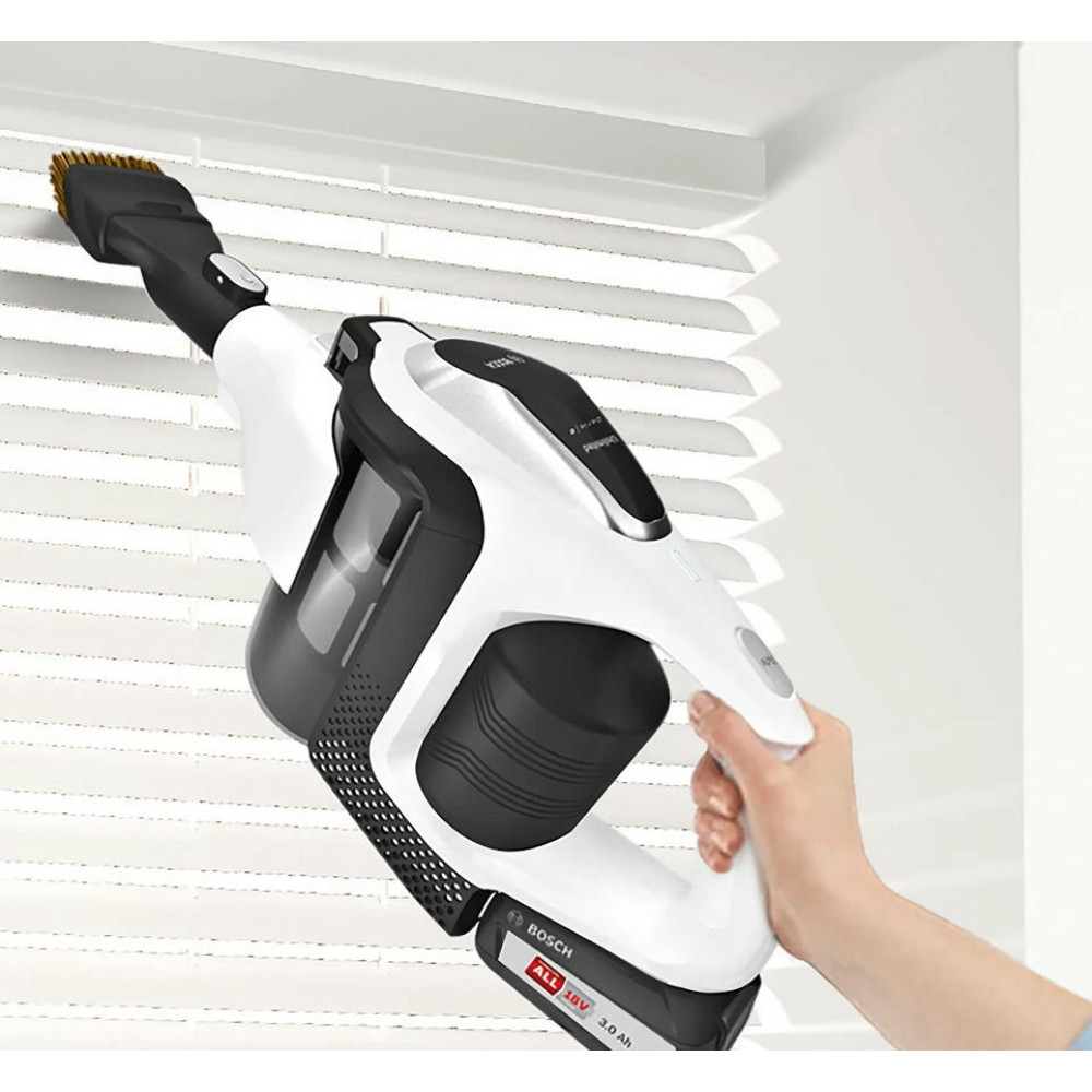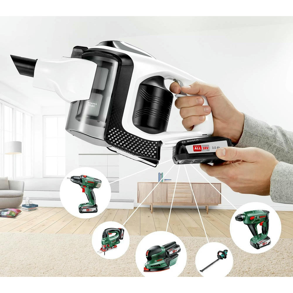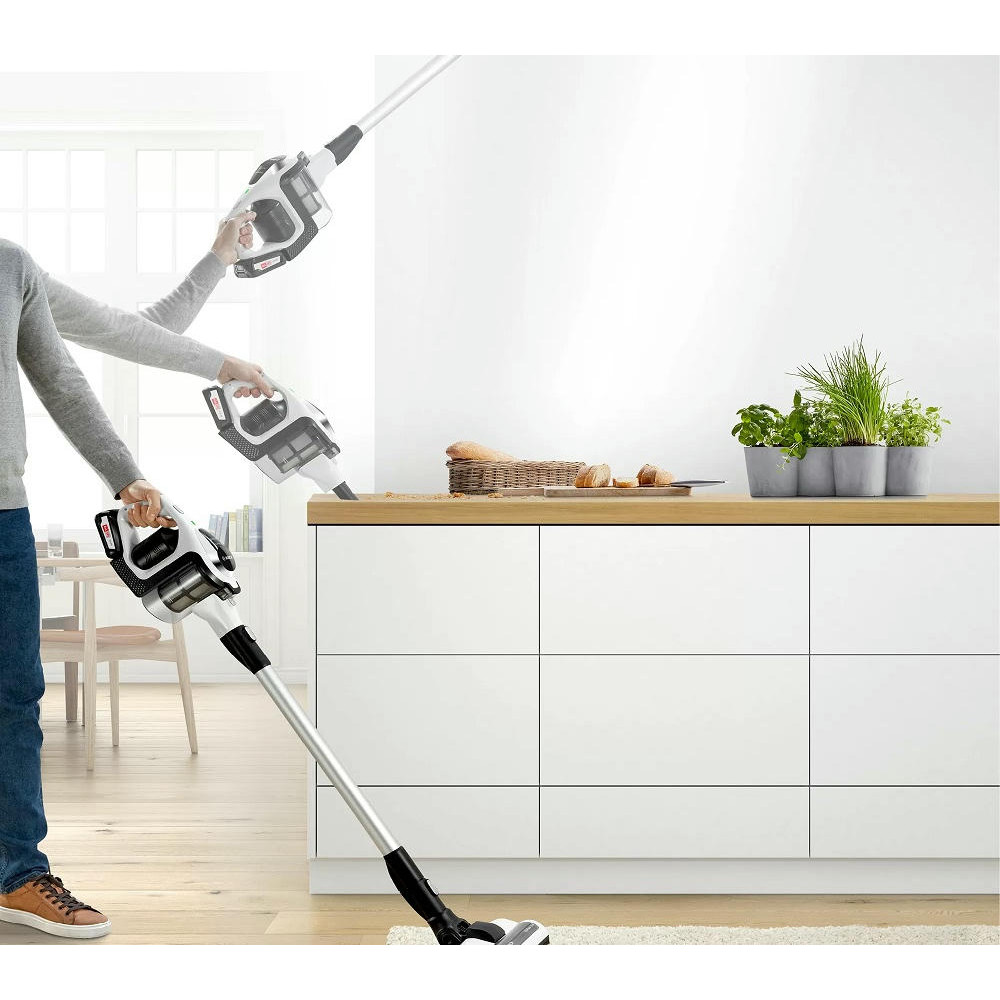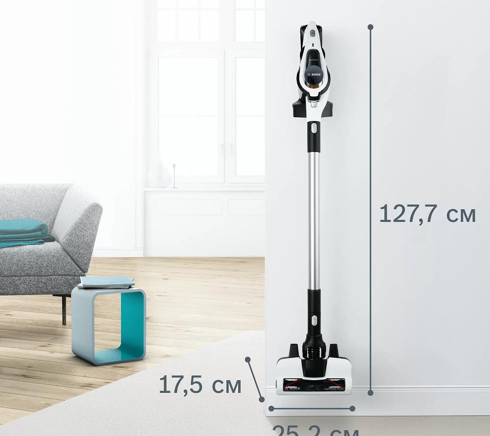 Аккумуляторный пылесос Bosch BCS81EXC хорошо послужит для уборки полов, а сменные насадки и возможность использовать прибор как портативное устройство позволят удалять пыль с других поверхностей. Благодаря функции Rotation Clean фильтр контейнера легко очищается, его даже не надо мыть. Устройство не будет занимать много места, ведь для него предусмотрена док-станция, в которой удобно хранить сам прибор и аксессуары к нему.