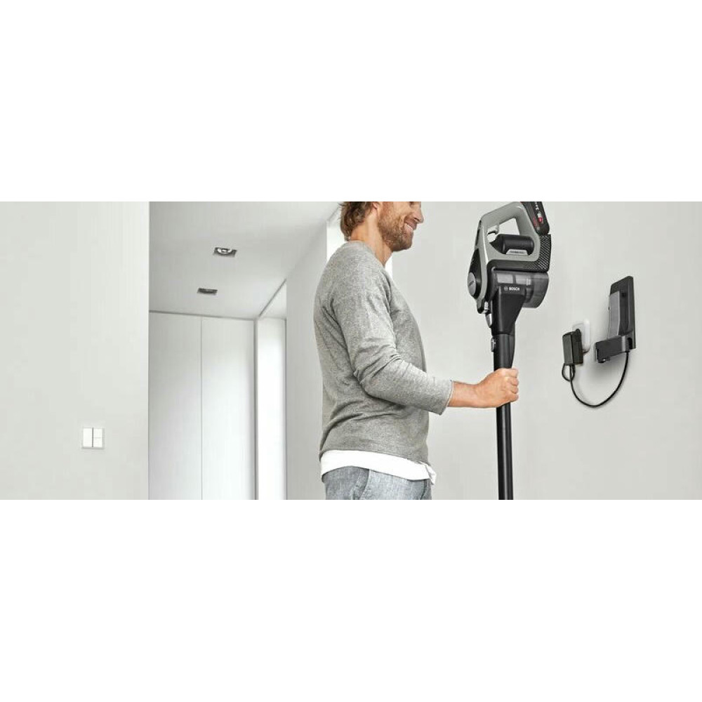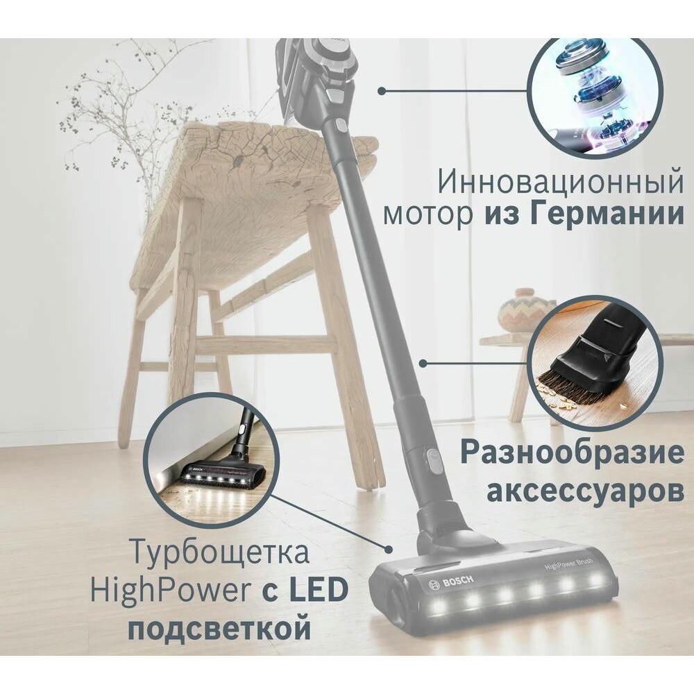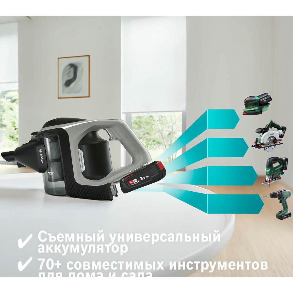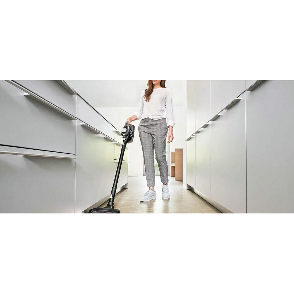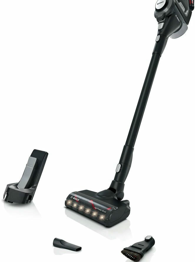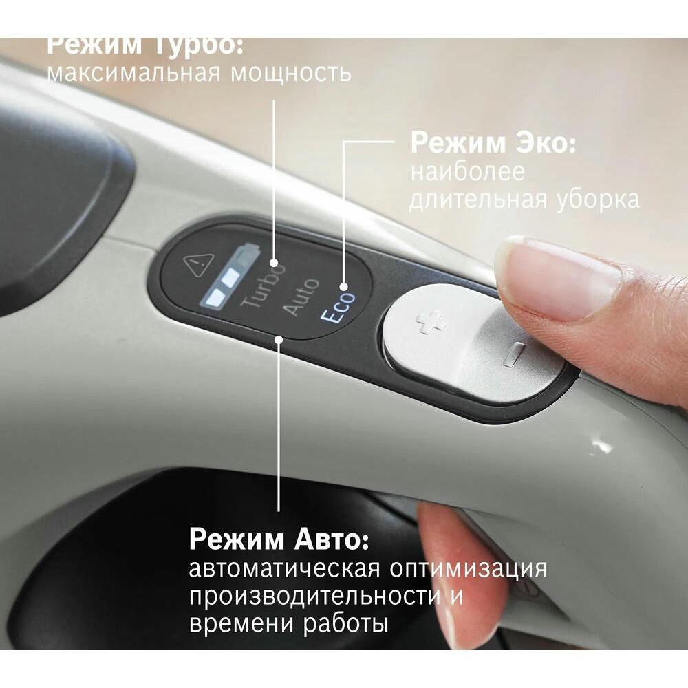Пылесос Bosch BCS82G31 оснащен съемным универсальным аккумулятором Power for ALL 18 В, он подходит для разных приборов и держит время подзарядки до 45 минут. Имеется турбощетка HighPower с LED подсветкой, она отлично справляется с любыми напольными покрытиями. Также есть режим авто, он будет регулировать мощность работы в зависимости от напольного покрытия.