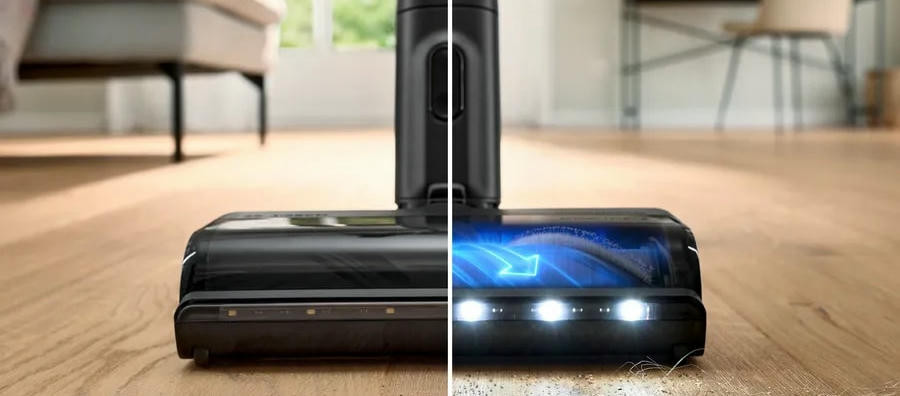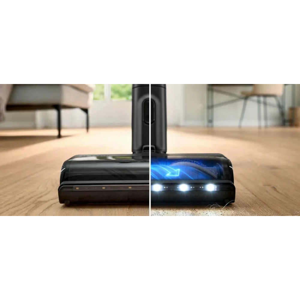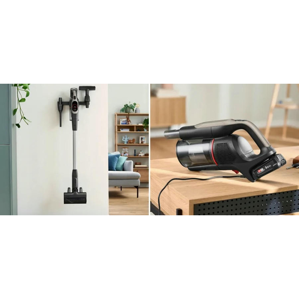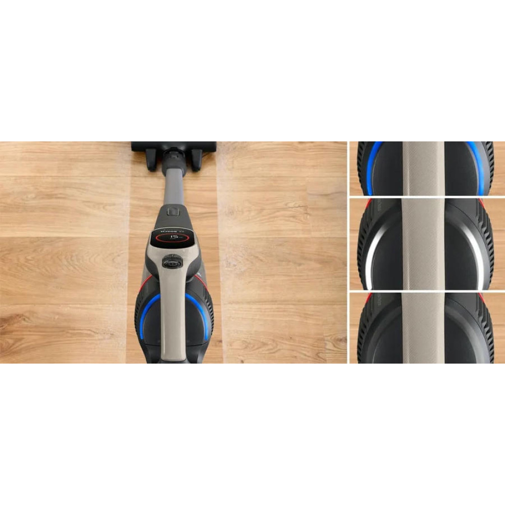 Вертикальный тип пылесоса и безмешковая технология сбора пыли обеспечивают удобство и простоту эксплуатации. Объем контейнера для сбора пыли составляет 0.4 литра, что позволяет проводить уборку без частых перерывов на опорожнение контейнера. Система гигиенической фильтрации контейнерного типа HEPA гарантирует отсутствие мельчайших частиц пыли в воздухе после уборки. Особенностью данной модели является функция 2 в 1: это вертикальный пылесос и съемный портативный пылесос в одном устройстве. Это позволяет быстро и легко переключаться между режимами уборки, в зависимости от потребностей. Регулятор мощности на ручке и три уровня производительности позволяют выбрать оптимальный режим для каждой конкретной задачи.