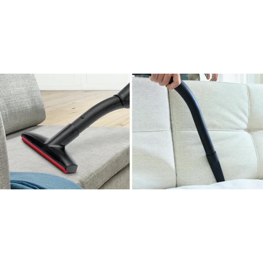 Модель оснащена электронной регулировкой мощности с поворотным регулятором, который расположен на корпусе. Это позволяет вам быстро и без труда настроить уровень мощности, идеально подходящий для конкретной уборки. Пылесос Bosch BGC41X36 обладает широким набором насадок, включая насадки для пола, ковра, мягкой мебели и твердых полов. Это делает его универсальным решением для любых задач уборки. Все насадки можно удобно хранить в специальном отсеке, который, однако, не встроен в корпус устройства.