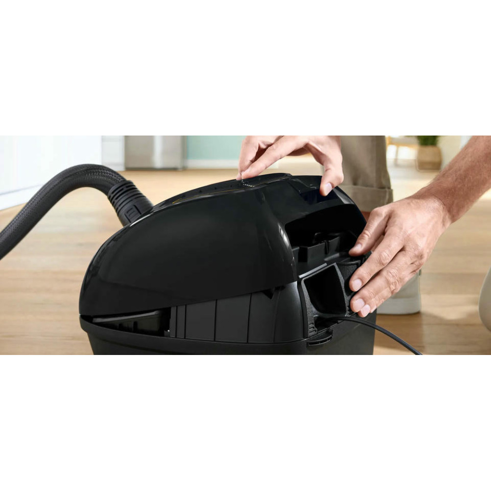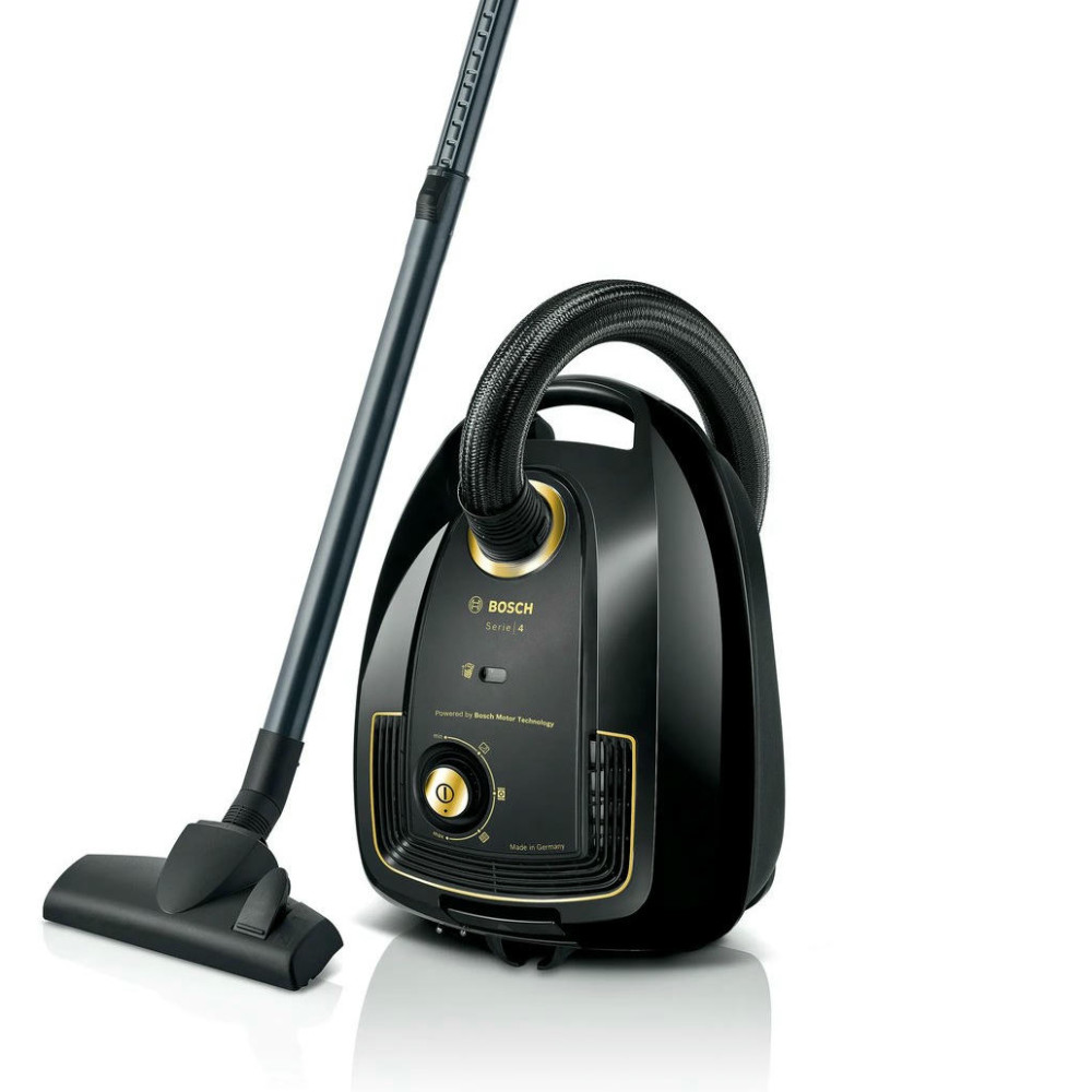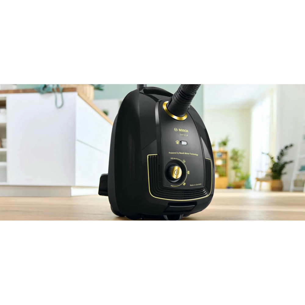Пылесос Bosch BGL38GOLD отличается элегантным дизайном и высокой функциональностью. Черный корпус с золотыми элементами подчеркивает стиль и утонченность модели. Эта модель относится к типу напольных мешковых пылесосов, что обеспечивает легкость в обслуживании и гигиеничность использования. Объем пылесборника составляет 4 литра, что позволяет редко менять мешки для пыли. Автоматическое сматывание сетевого шнура и вертикальная парковка упрощают хранение и транспортировку устройства. Для обеспечения максимальной чистоты и свежести воздуха пылесос оснащен системой гигиенической фильтрации HEPA, известной своей эффективностью в устранении аллергенов и мелкой пыли. Система PowerProtect обеспечивает стабильную мощность всасывания, даже когда мешок для пыли заполняется.