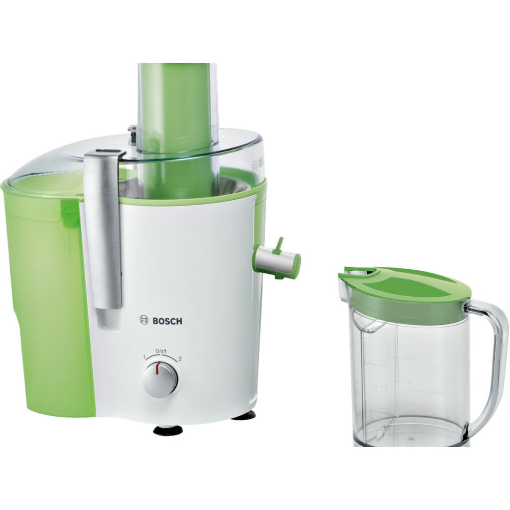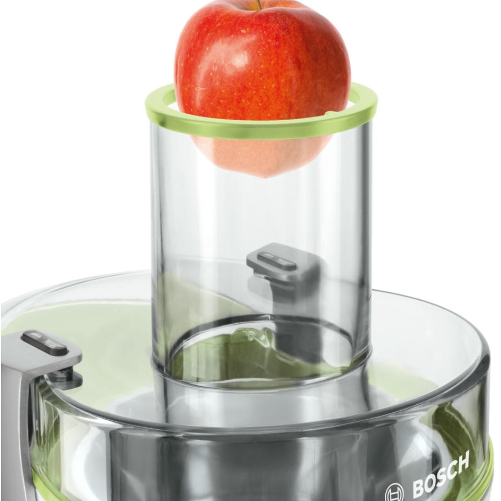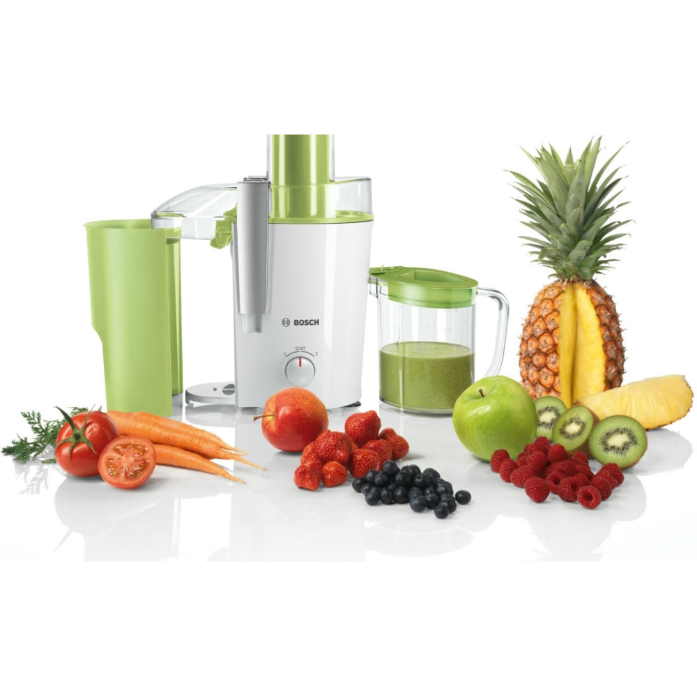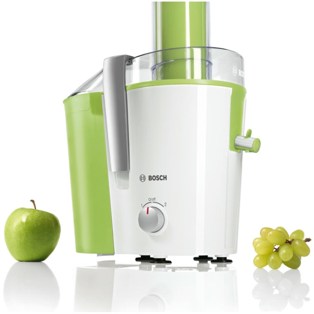 Мощная соковыжималка Bosch MES 25G0 — универсальный прибор для мягких и твердых фруктов. Широкое загрузочное позволяет загружать целые овощи и фрукты. Свежевыжатый сок обладает большим количеством натуральных пигментов, которые при долгой работе оставляют следы на белом пластике. Поэтому то, что элементы соковыжималки (кроме моторного механизма) можно мыть в посудомоечной машине, одно из важных достоинств прибора.