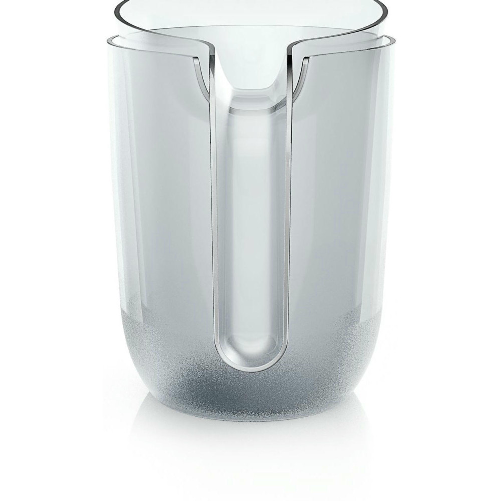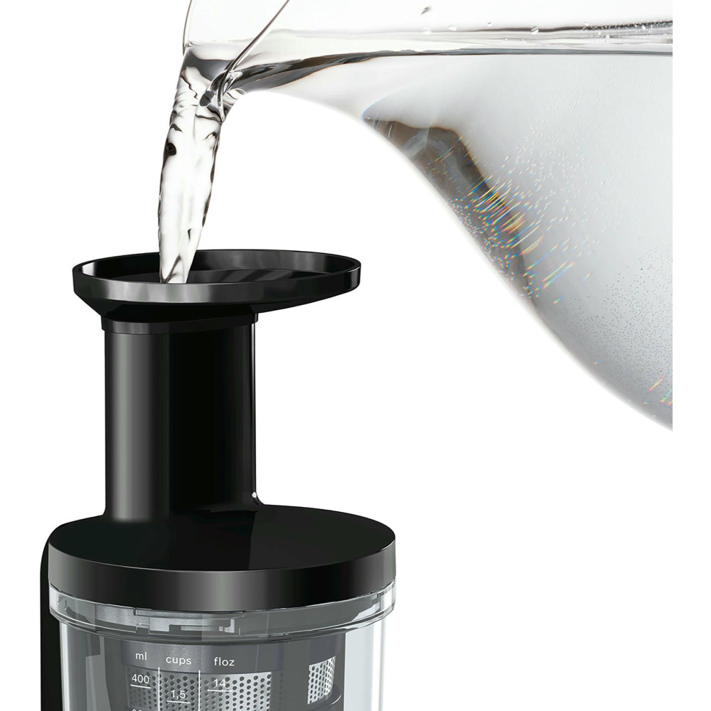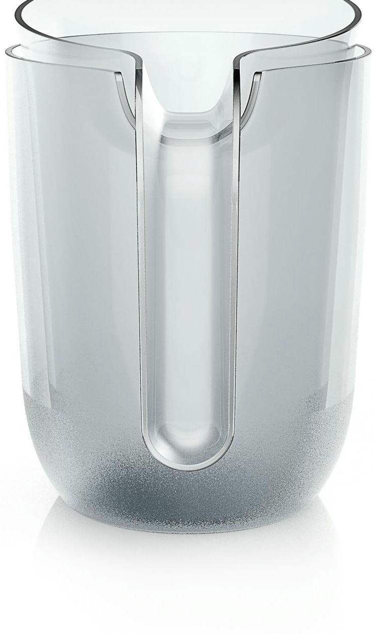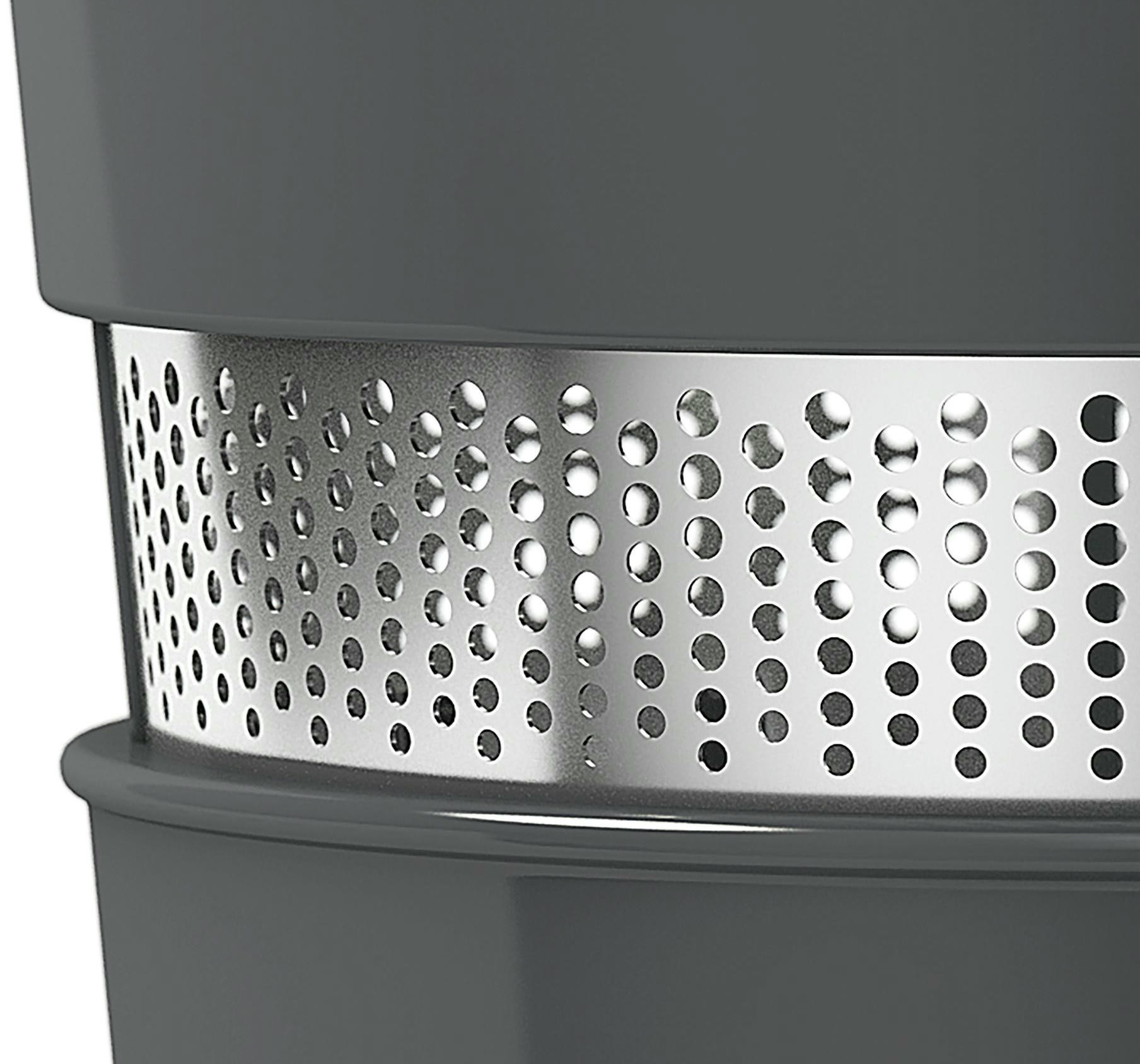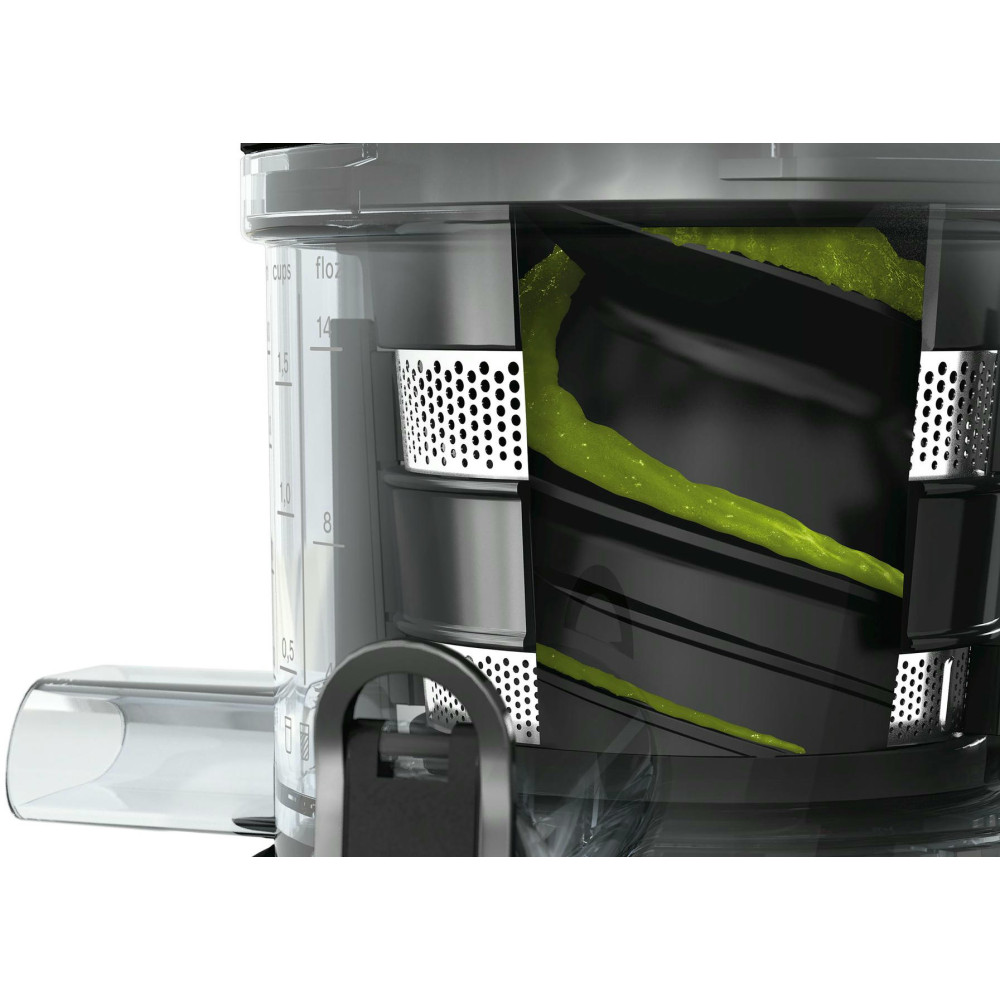 Прочный материал справляется даже с орехами и замороженными фруктами и овощами. При этом сохраняются питательные вещества и витамины. Силиконовые скребки на центрифуге перемешивают жидкость внутри чаши, что важно при измельчении разных ингредиентов. При помощи функции реверса можно извлечь застрявшие продукты и кожицу.