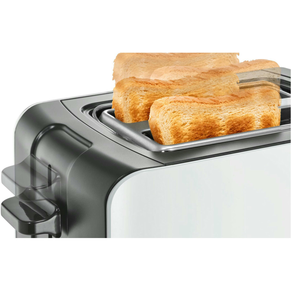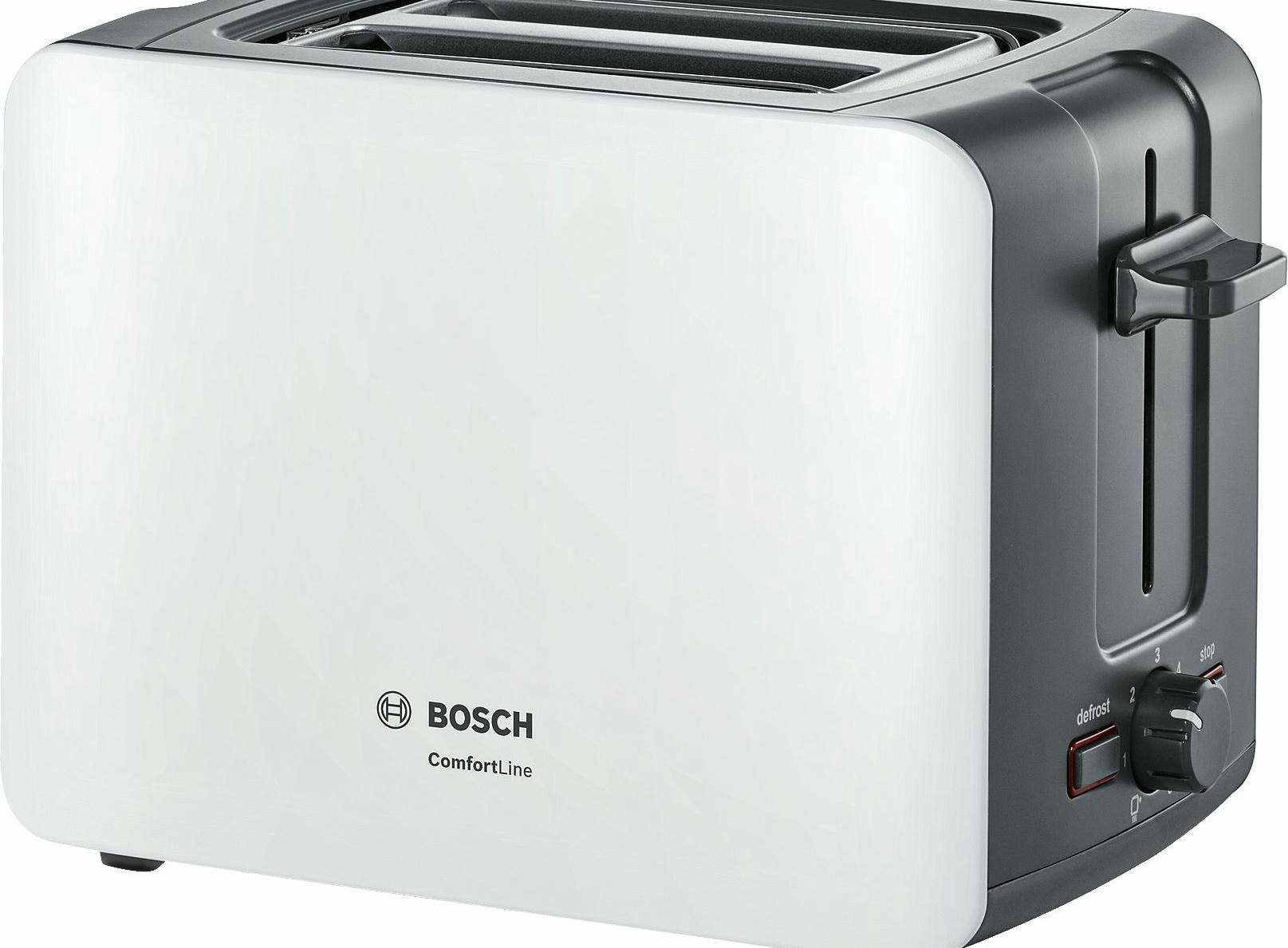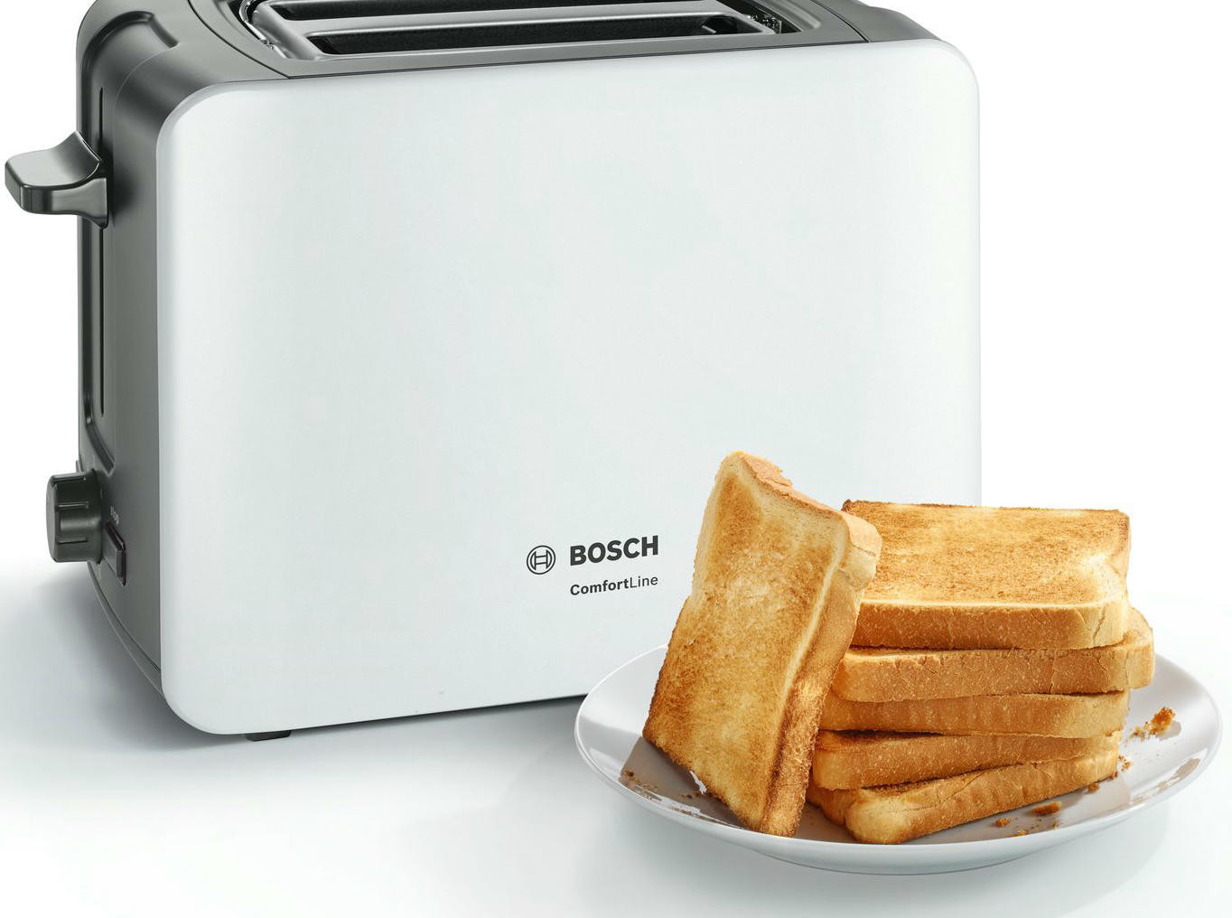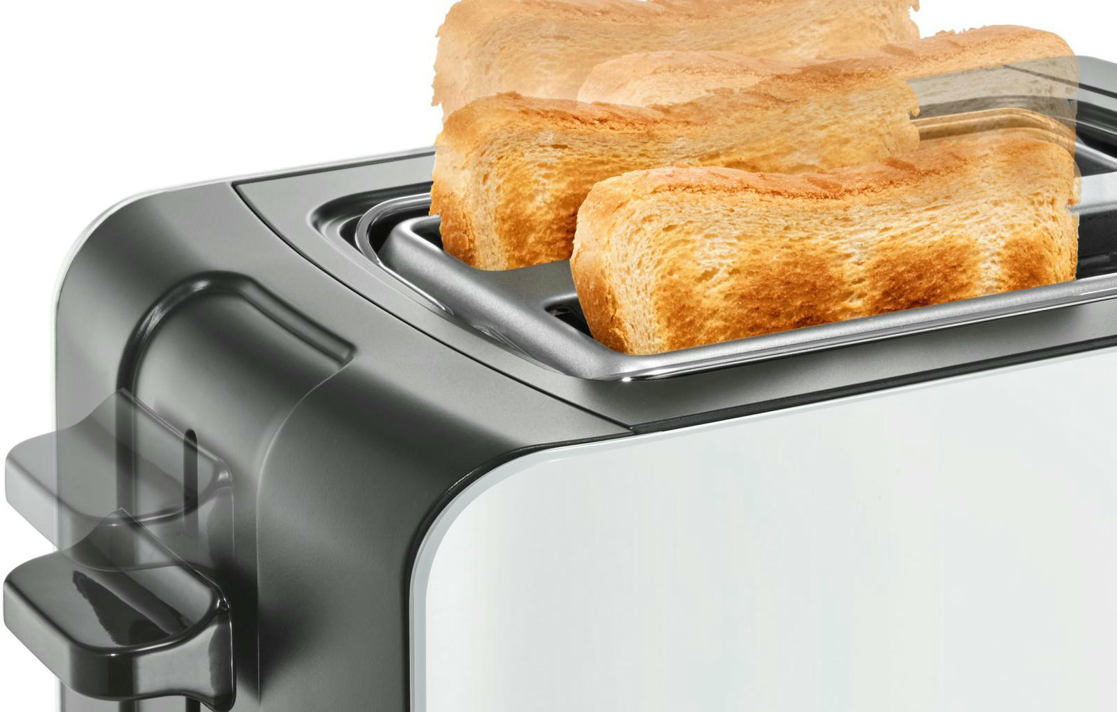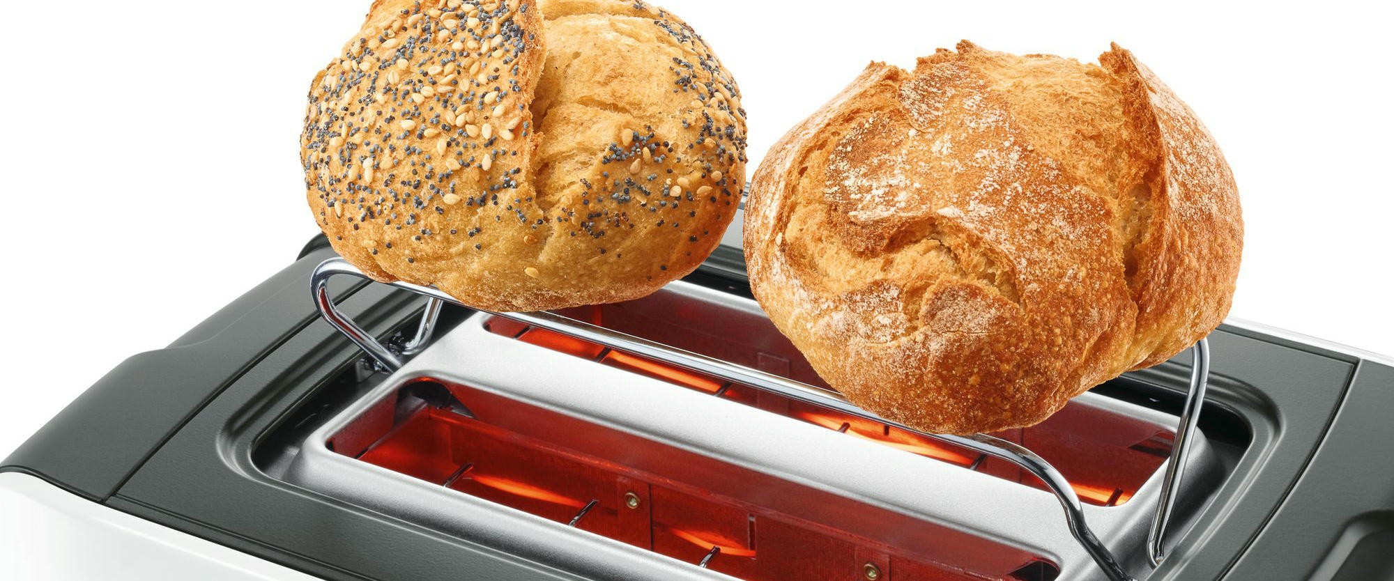 Компактный тостер Bosch TAT6A111 из серии ComfortLine рассчитан на одновременное приготовление двух кусочков. На высокой решетке можно поджаривать булочки. Электронный сенсор отслеживает оптимальную температуру порумянивания хлеба. Режим приготовления замороженных тостов включается отдельной подсвеченной клавишей.