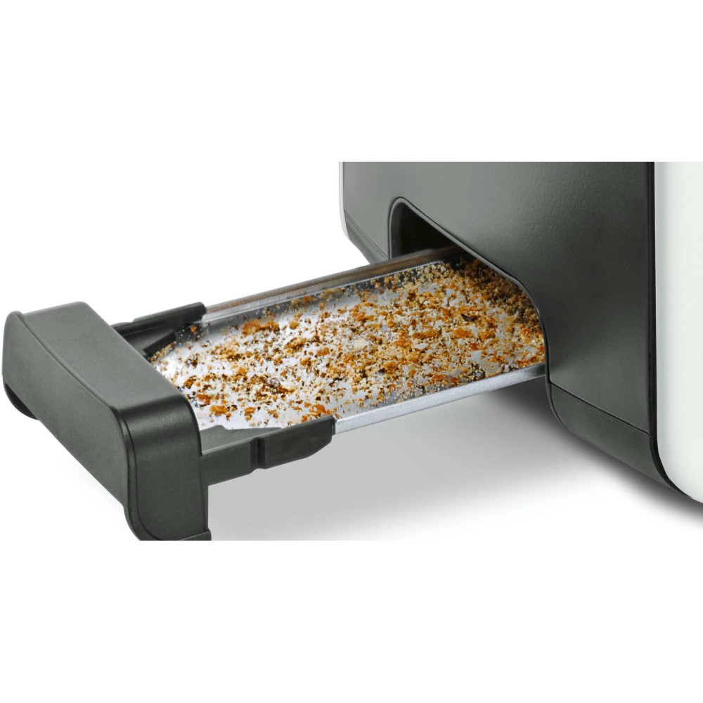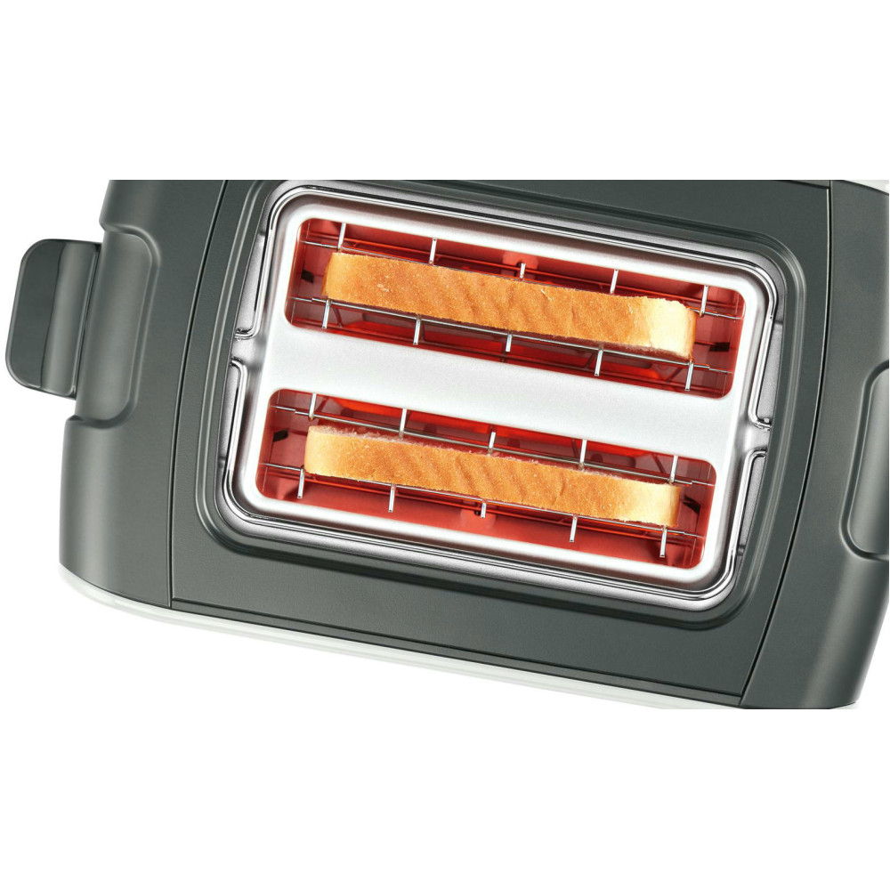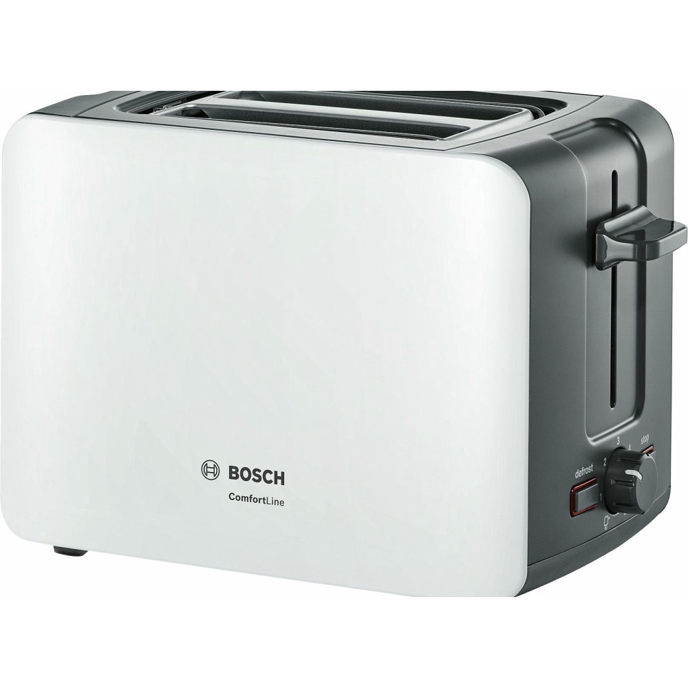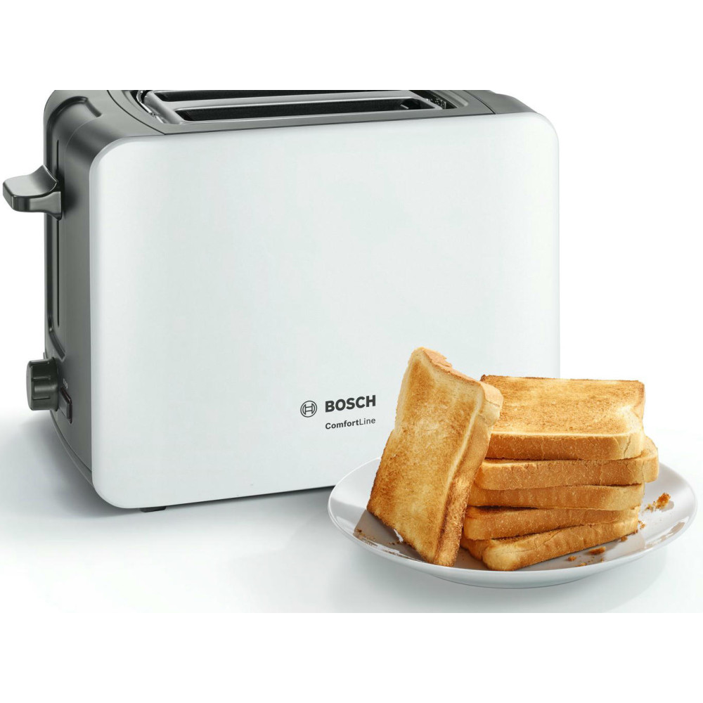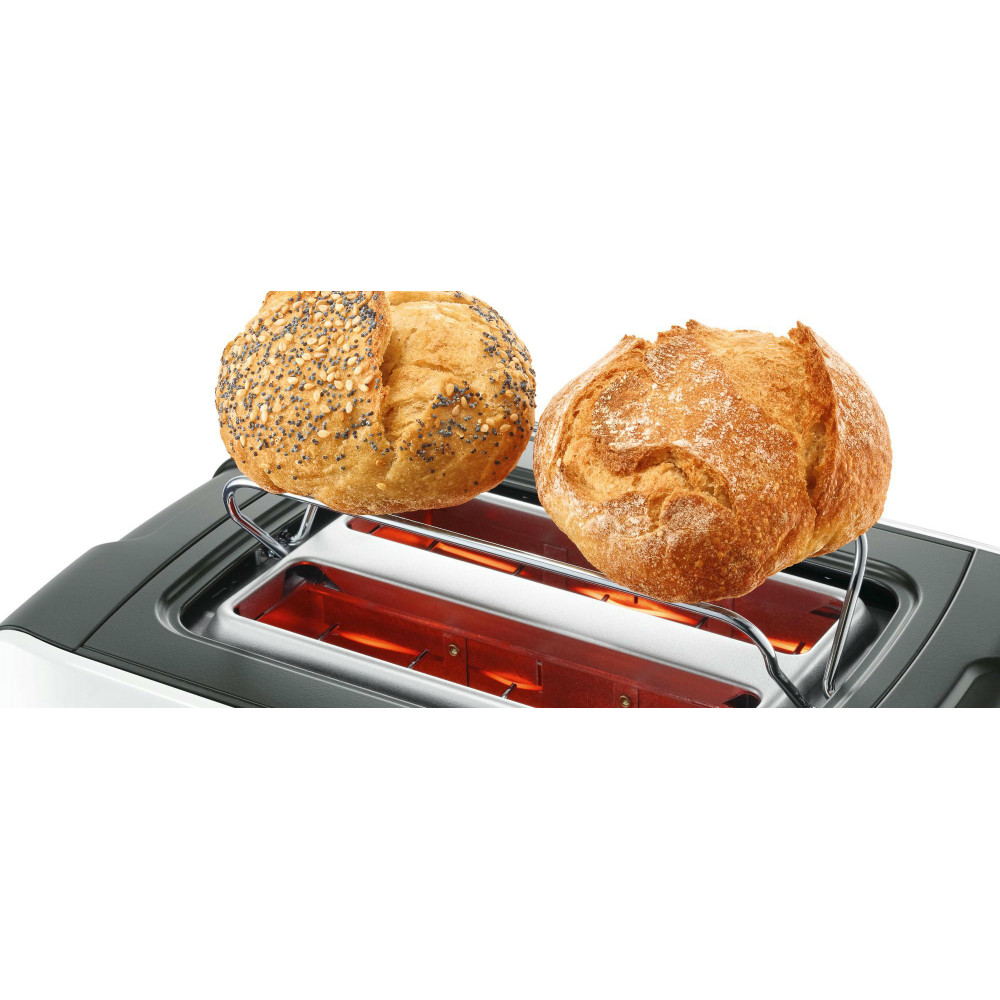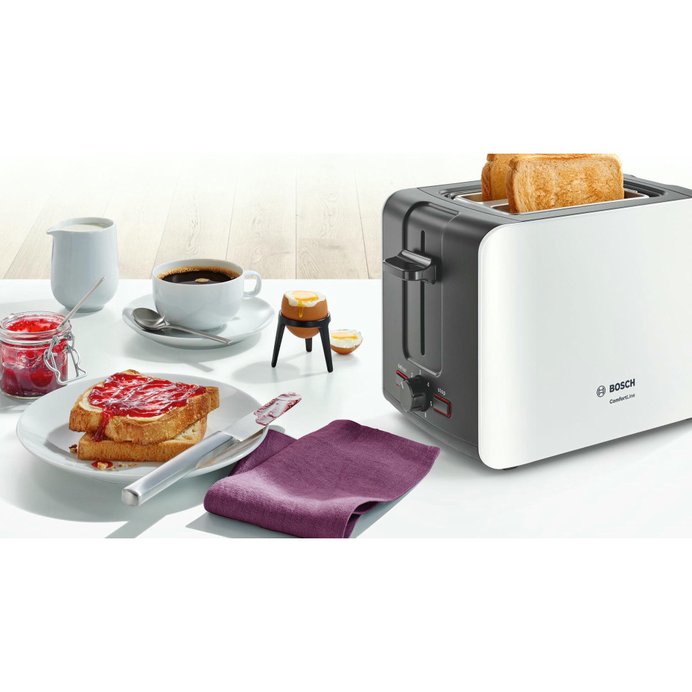 Компактный тостер Bosch TAT6A111 из серии ComfortLine рассчитан на одновременное приготовление двух кусочков. На высокой решетке можно поджаривать булочки. Электронный сенсор отслеживает оптимальную температуру порумянивания хлеба. Режим приготовления замороженных тостов включается отдельной подсвеченной клавишей.