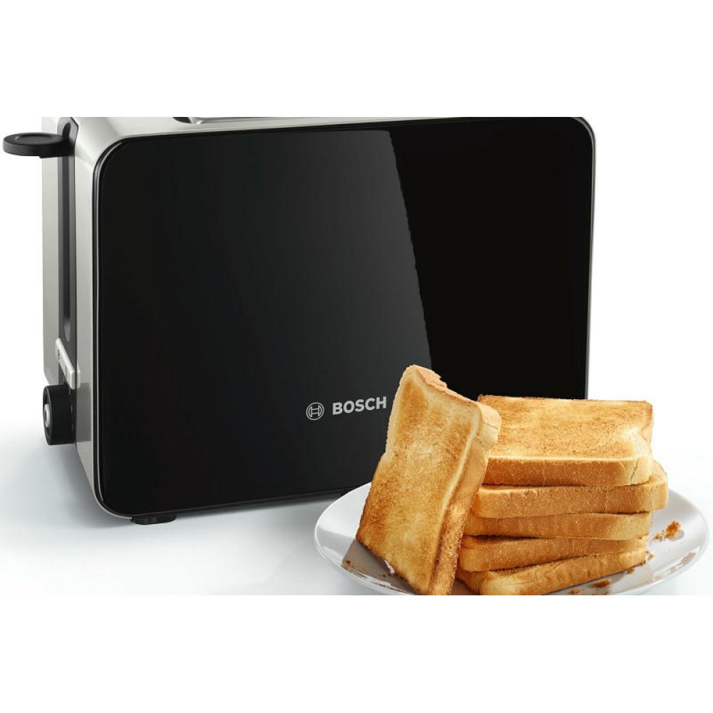 Bosch TAT7203 — электрический тостер из нержавеющей стали. Модель оснащена автоматическим центрированием ломтиков хлеба для равномерного поджаривания. Устройство имеет электронный сенсор для поддержания оптимальной температуры поджаривания. Отдельная подсвеченная клавиша предназначена для включения режима приготовления замороженных тостов.