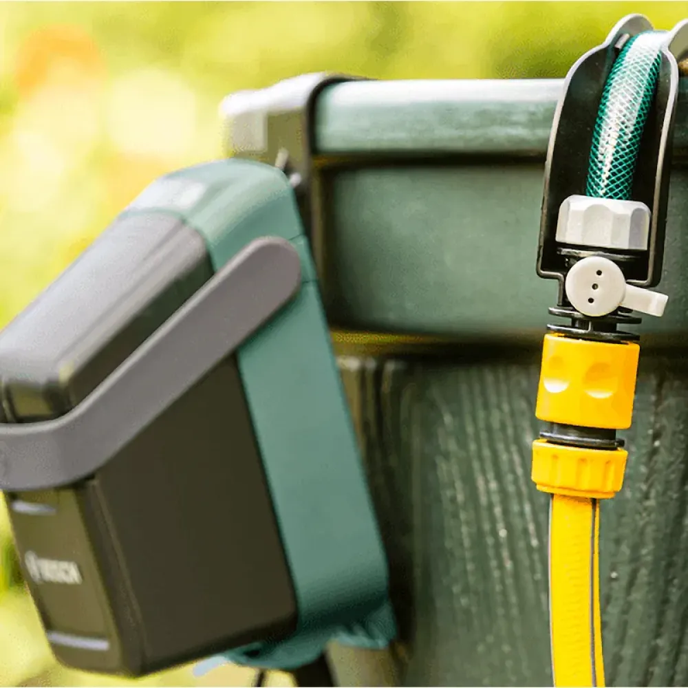 Начните с установки блока управления аккумулятором, который можно удобно подсоединять непосредственно к резервуару или прикреплять к стене. Затем просто погрузите насос дождевой воды в бак. После чего присоедините садовый шланг длиной до 25 м и распылительный пистолет.