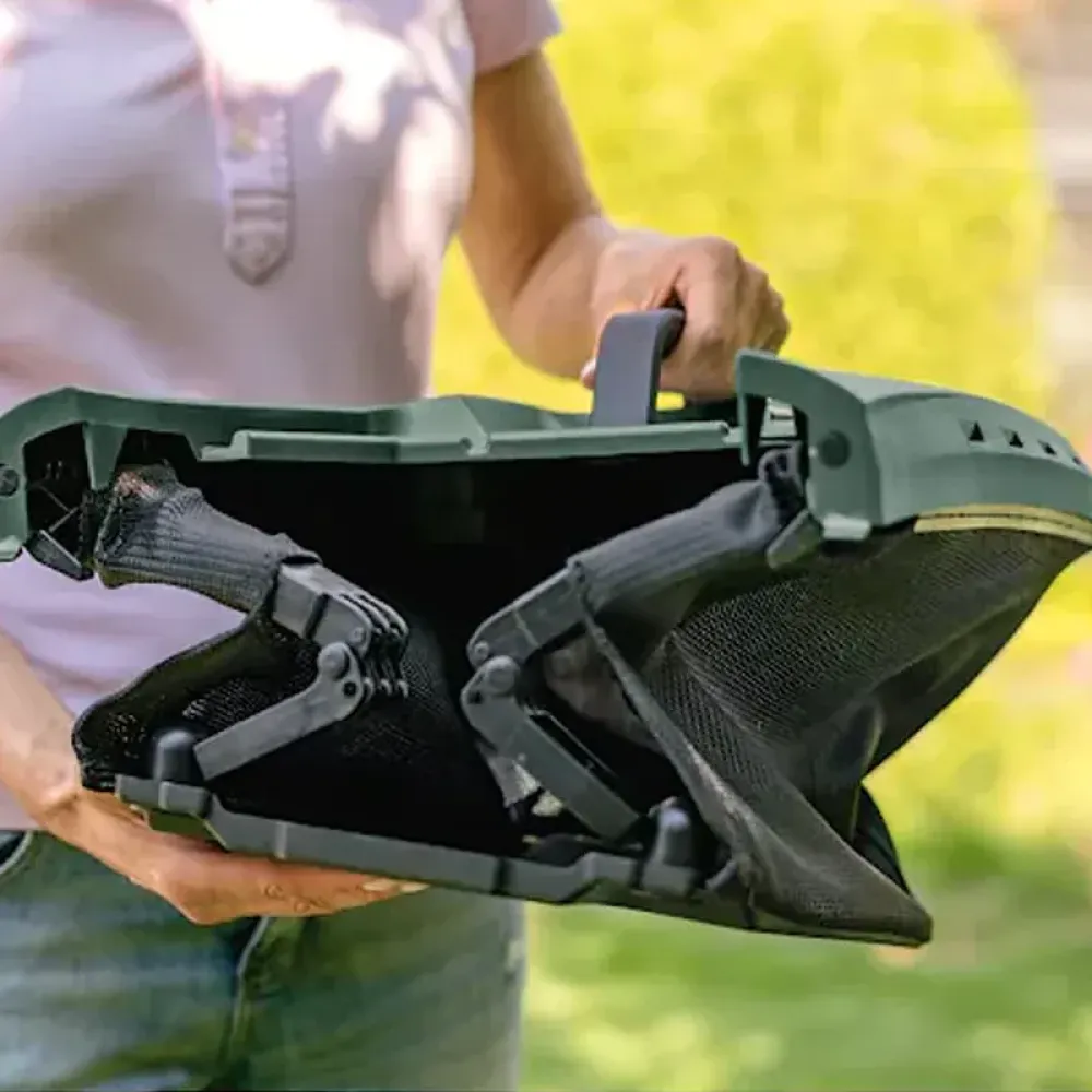 Нож косилки имеет дополнительную функцию сбора листьев. Травосборник с индикатором заполнения травой состоит из двух частей, сделанных из пластика и прочной сетки. Шарнирная конструкция травосборника позволит легко и быстро сложить его и в плоском виде хранить сверху косилки. Такой крупный травосборник объемом 50 л теперь не будет занимать место в помещении для хранения. На корпусе косилки есть направляющие для травы, которые направят траву на нож косилки и помогут ускорить уход за газоном, скашивая с первого раза траву по самой кромке газона, вдоль дорожек и бордюров.