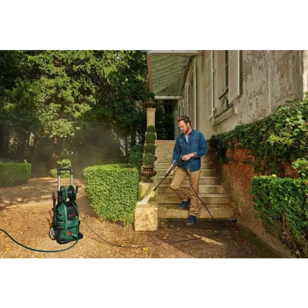 Мойка высокого давления Bosch AdvancedAquatak 150 оснащена выдвижной ручкой, нишами для хранения аксессуаров, колесами для транспортировки и удобной катушкой для шланга. Она отлично подходит для регулярной уборки на территории загородного дома или дачи.