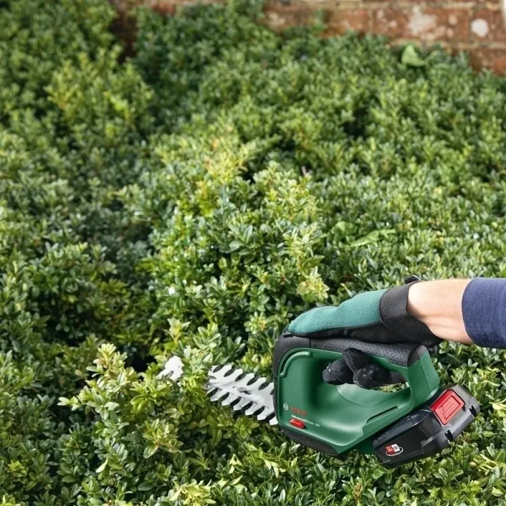 Аккумуляторные ножницы Bosch Advanced Shear 18V-10 комфортно держать в руках благодаря сбалансированному корпусу и нескользящей рукоятке. Универсальный инструмент поддерживает применение двух ножей — для травы и кустарников. Замена оснастки выполняется одним движением, что позволяет быстро переходить от одной задачи к другой. Например: от подравнивания кромок газона к стрижке живой изгороди. Устройство работает от Li-Ion аккумулятора 18 В емкостью 2 Ач, совместимого с другими аккумуляторными инструментами Bosch.