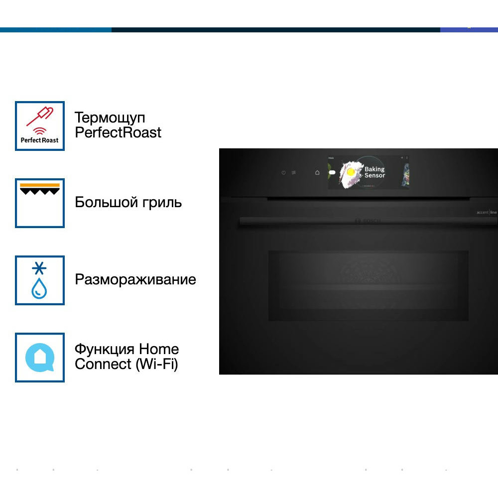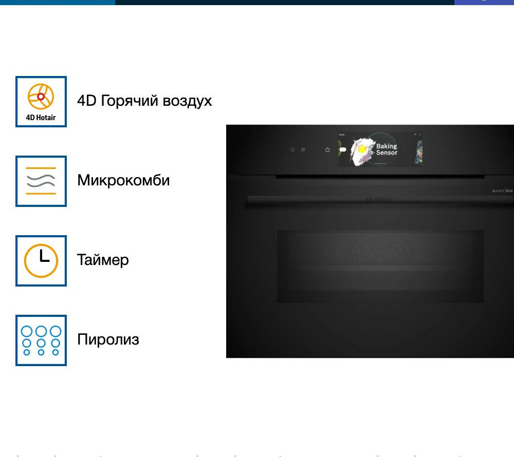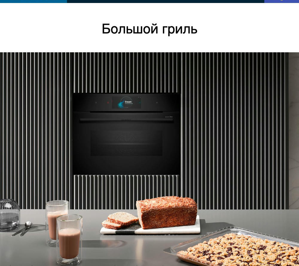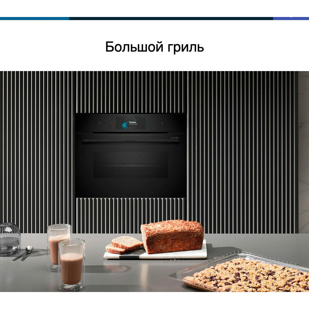 Духовой шкаф Bosch CMG978NB1 оснащена программой Assist, она отслеживает приготовление блюда и сама отключает устройство. Система Home connect позволяет управлять удаленно с помощью голосового управления. 4D горячий воздух равномерно распределяется на всех уровнях приготовления.