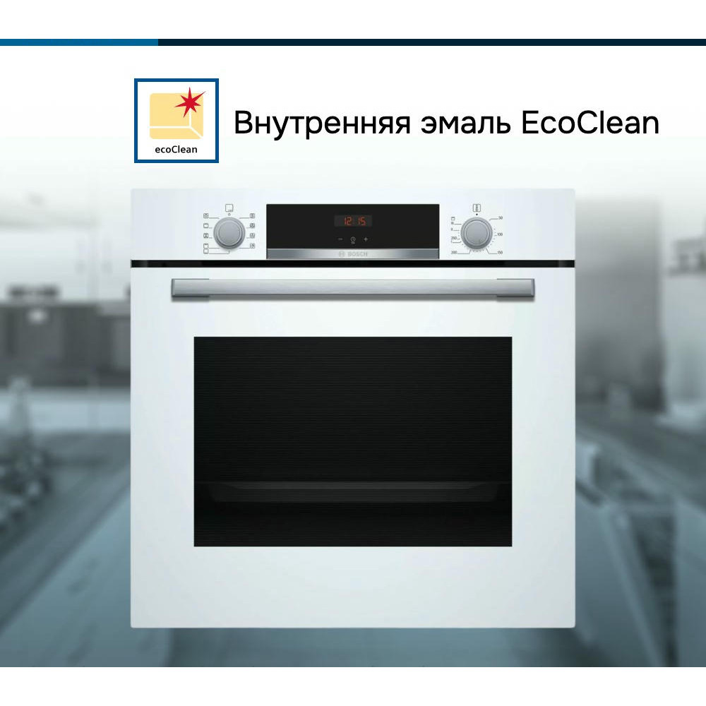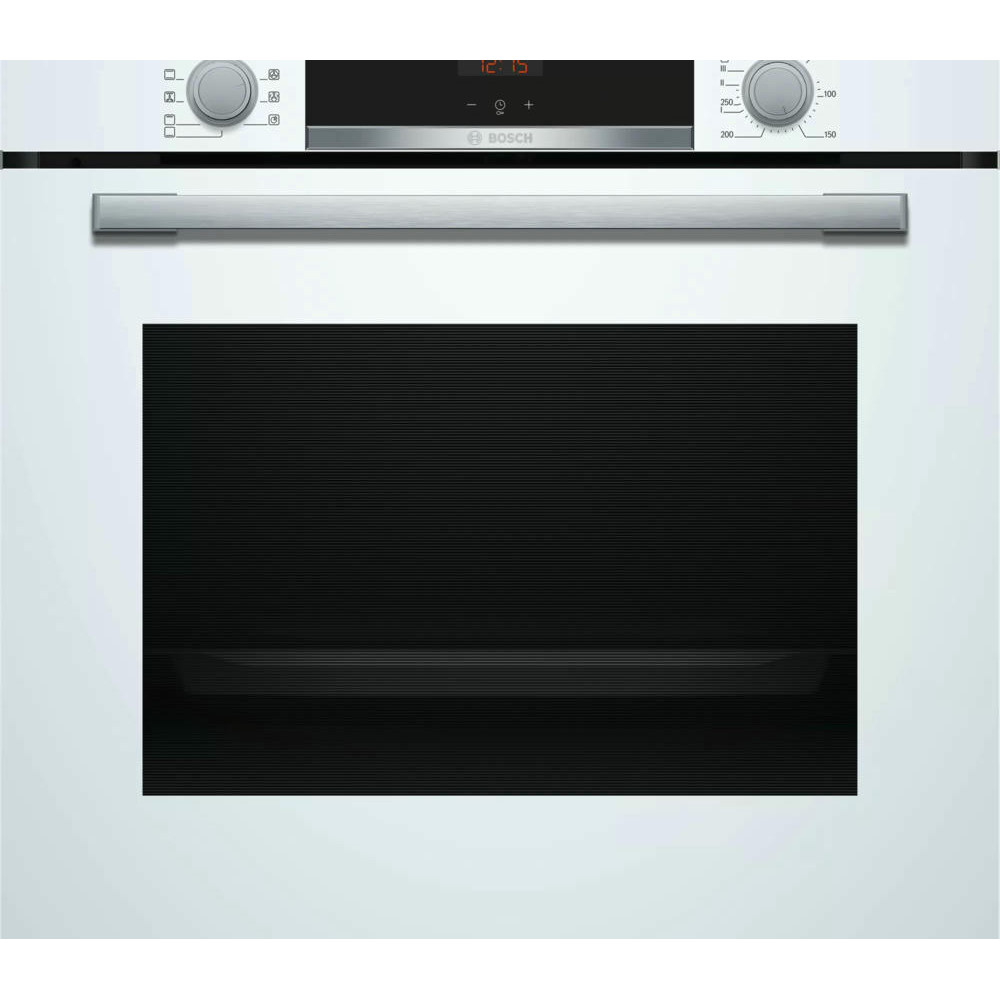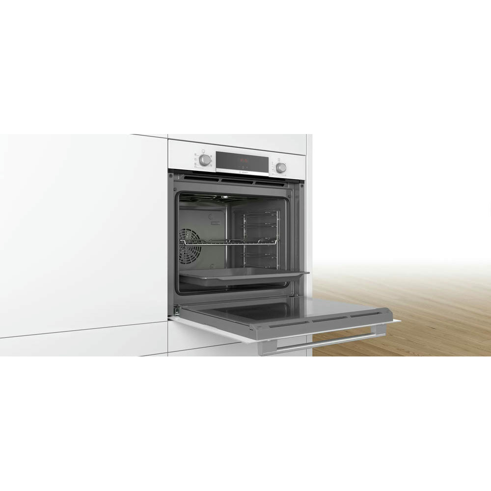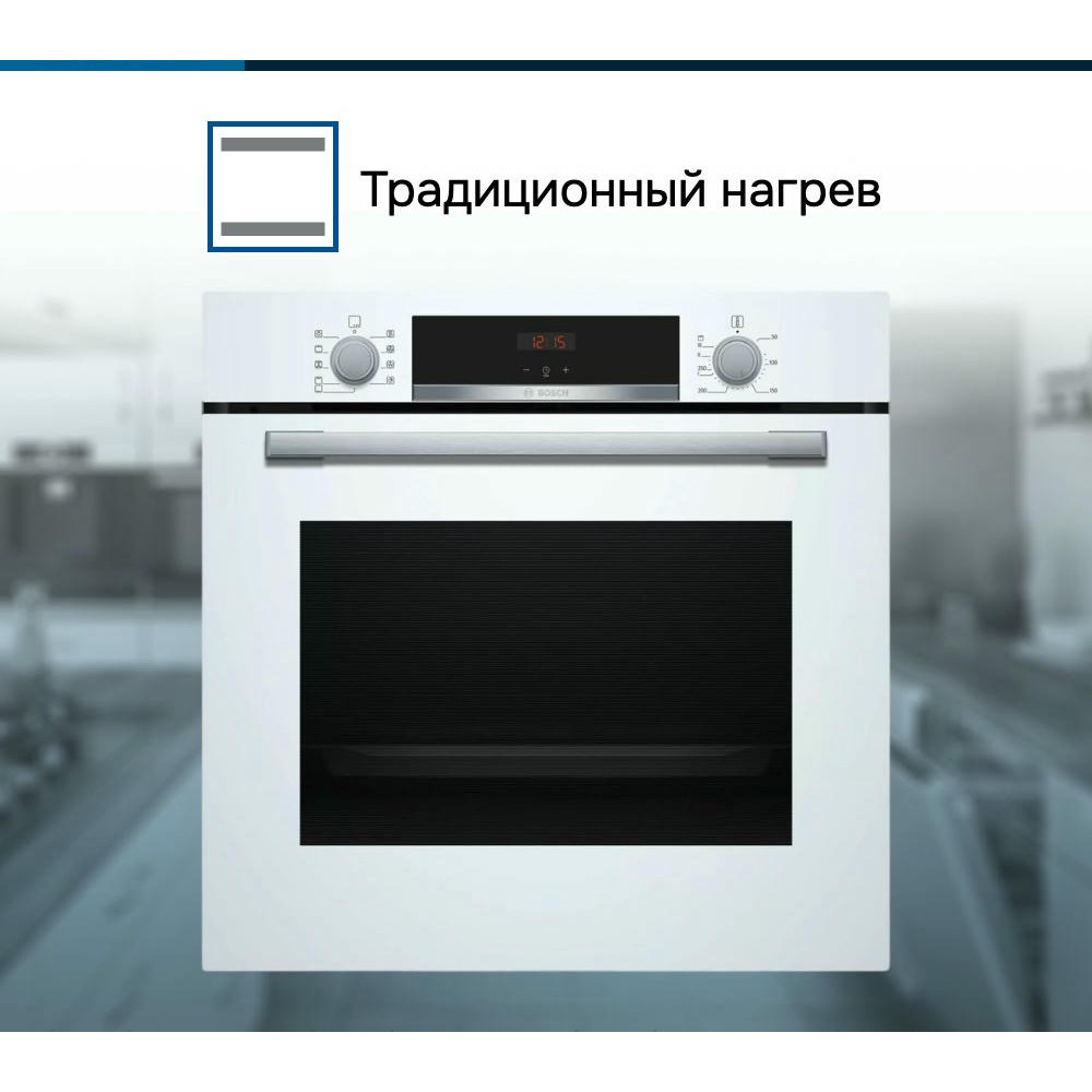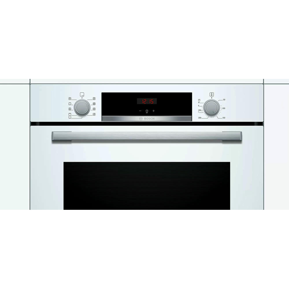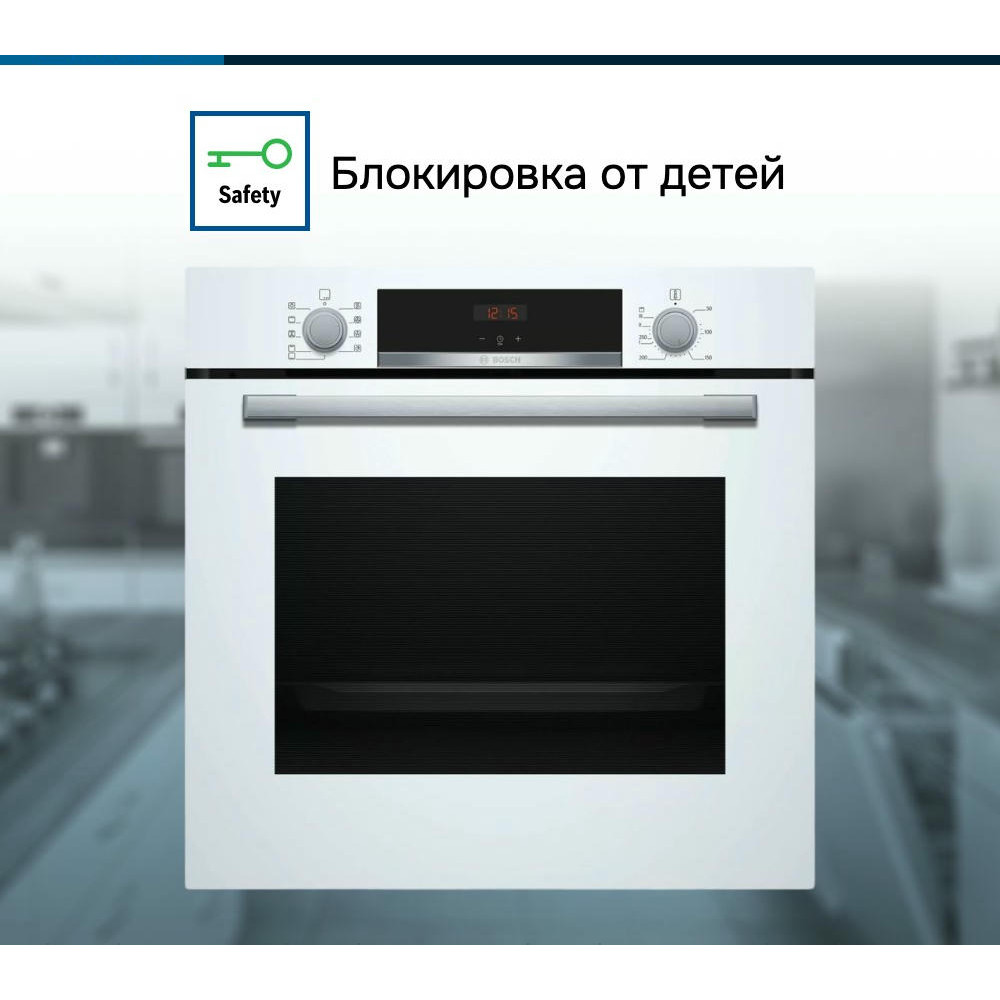 Духовой шкаф Bosch HBA534BW0 — это электрическая независимая модель. Ее внутренний объем составляет 71 литр, благодаря чему есть возможность запекать большие блюда. Она оформлена в белом цвете, благодаря чему отлично впишется в любой современный кухонный интерьер. Управление осуществляется посредством использования сенсорных кнопок, а также поворота переключателей. Благодаря многофункциональным часам Easy Clock можно с легкостью отслеживать время до окончания работы одной из программ.
