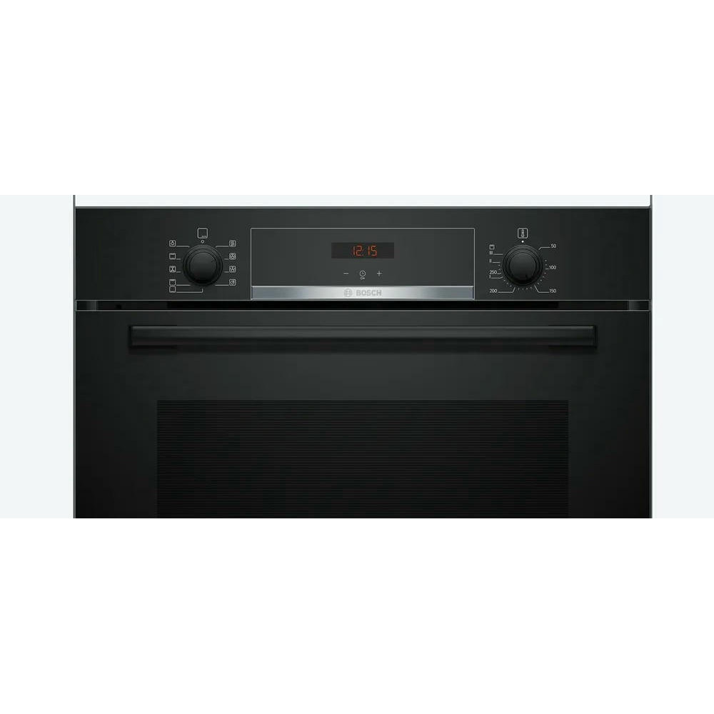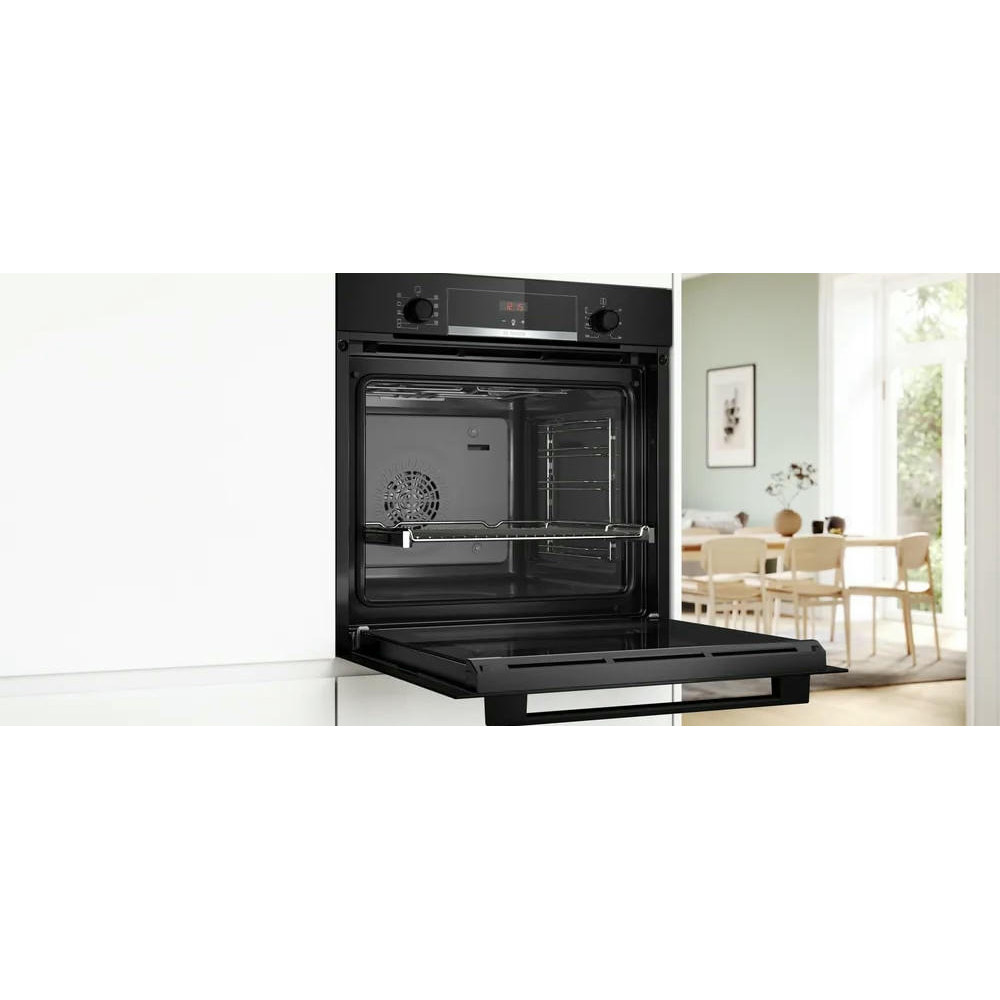 Духовой шкаф Bosch HBA534EB3 выполнен в строгом чёрном цвете, что позволяет гармонично интегрировать прибор в любые интерьерные решения кухни и подчеркнуть сдержанную элегантность пространства. Компактные габариты при высоте 59.5 см, ширине 59.4 см и глубине 56.7 см делают агрегат удобным для встраивания в стандартную нишу, соответствующую параметрам 60-60.4 х 56-56.8 х 55 см, при этом внушительный внутренний объём 71 литр обеспечивает простоту размещения крупногабаритных противней и нескольких уровней одновременно. Эргономика линии подчёркнута откидной дверцей с тройным остеклением, создающим надёжную термоизоляцию и минимизирующим нагрев фасадных панелей во время работы.