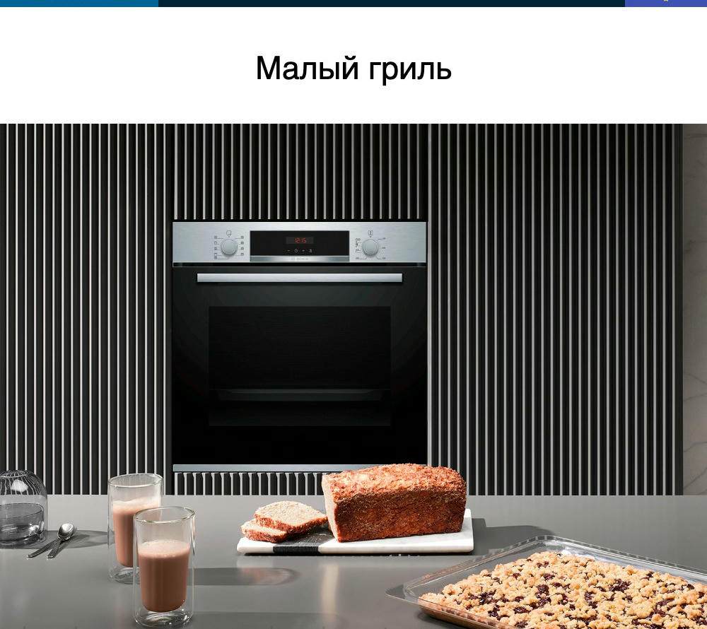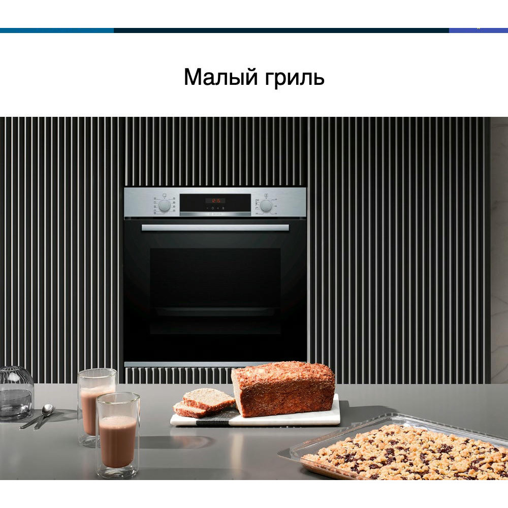 Духовка Бош HBA573BS1 вместительная, ее объем — 71 литр, так что помещается в нее много. Можно готовить одновременно сразу на нескольких уровнях. Например, на противне и на решетке. Особенно хорошо это получается, если включить режим 3d. Тогда горячий воздух будет обдувать блюдо со всех сторон, и оно получится полностью прожаренным и с хрустящей корочкой. Среди режимов есть нижний и верхний жар, большой и малый гриль, а также гриль с конвекцией. Это функция попеременного включения нагревательных элементов, что позволяет приготовить еду, которая по вкусу напомнит те, что приготовлены на вертеле. Для кулинарных экспериментов можно выбрать любую из 10 автоматических программ.
