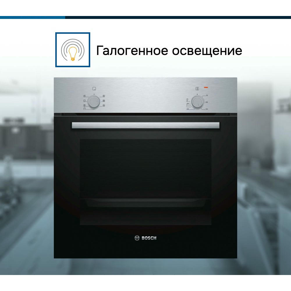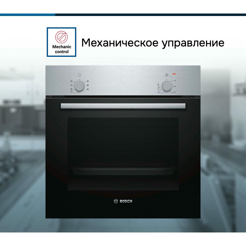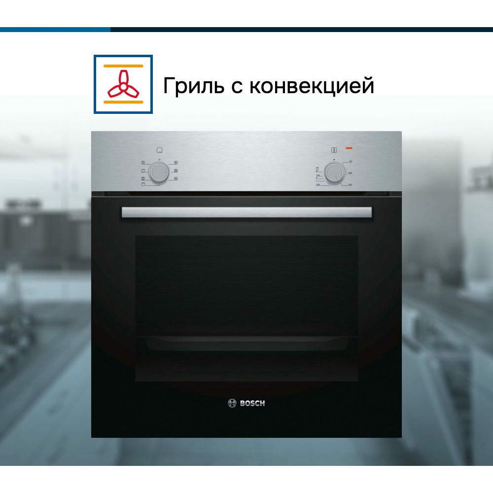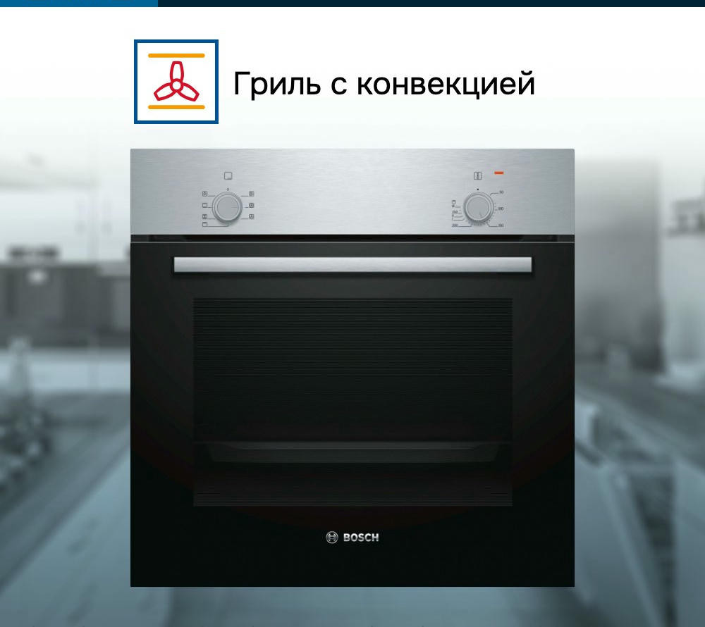 Духовой шкаф Bosch HBF010BR1S оснащен 6 режимами работы. Подсветка даст возможность точно определить момент превосходной готовности блюд. Двойное стекло надежно удерживает тепло и защищает ручку дверцы от нагревания. Система охлаждения прибора позволяет встроить духовку в любой кухонный гарнитур. Используйте режим «Гриль + конвекция», и тогда на мясе или выпечке появится потрясающая хрустящая корочка.