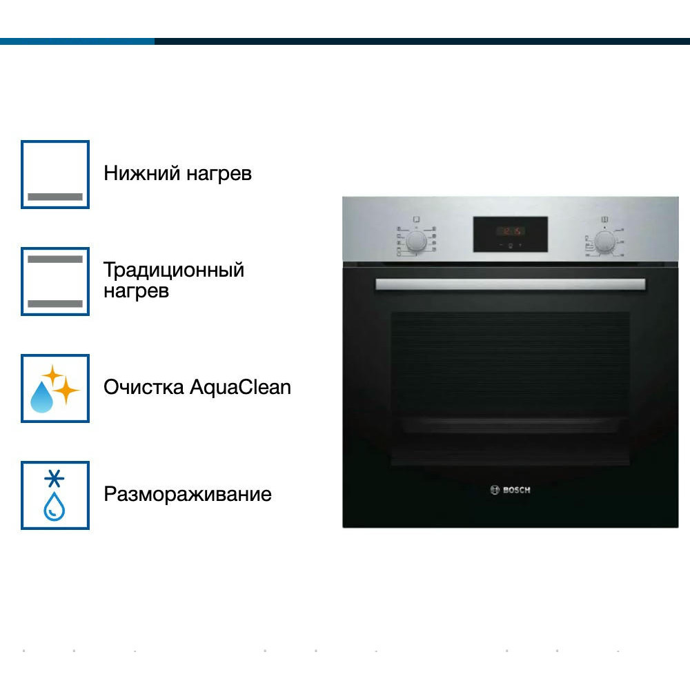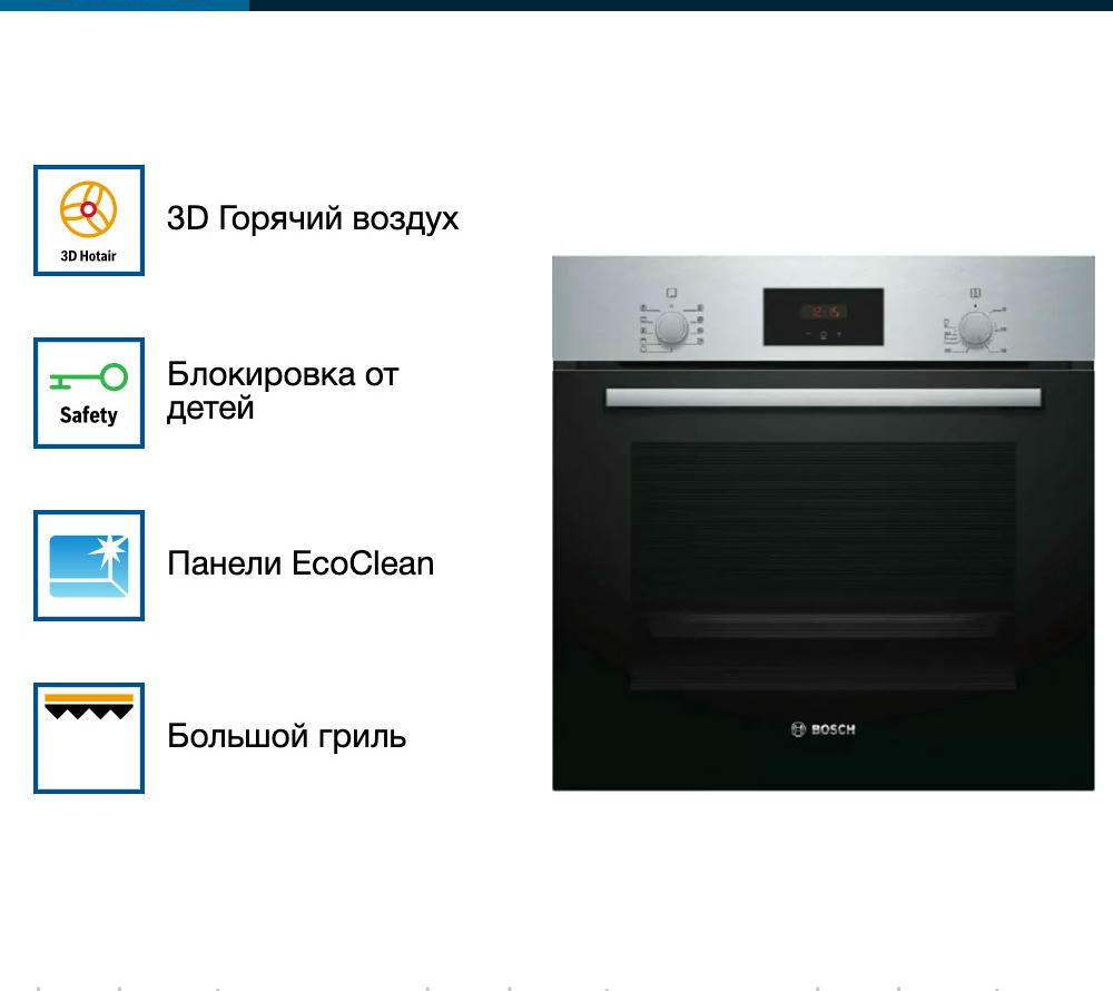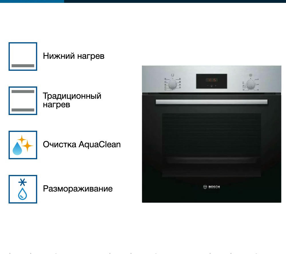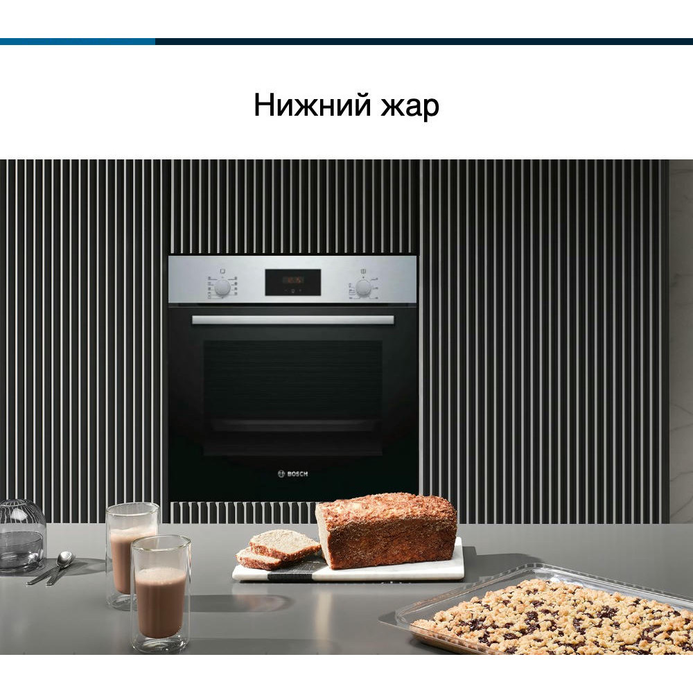 Электрический духовой шкаф Bosch HBF114ES0 есть внутренняя камера объемом 66 л, оснащенная галогенной подсветкой. Пользователь может выбирать один из семи режимов работы устройства или создавать индивидуальные программы для приготовления различных блюд. Благодаря технологии равномерной термической обработки «3D-горячий воздух» снижен риск пригорания пищи. Прибор оборудован электрическим грилем, который помогает получать хрустящую корочку.