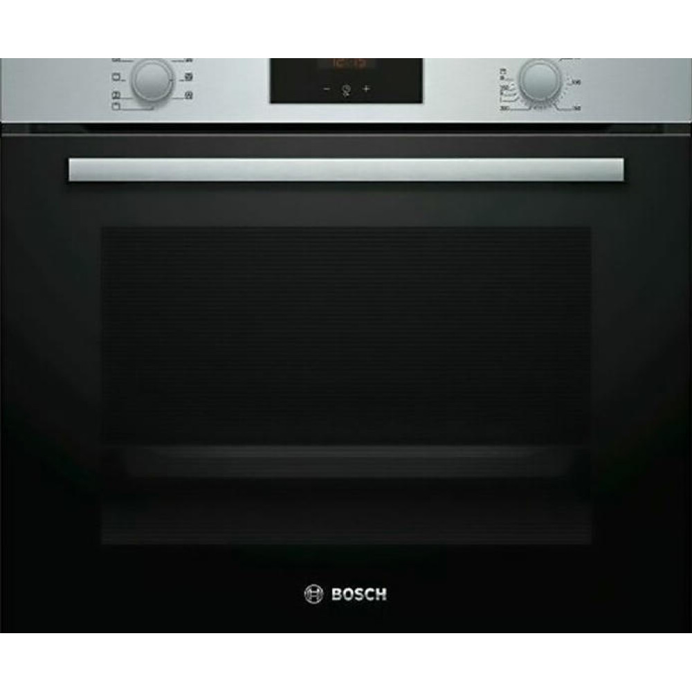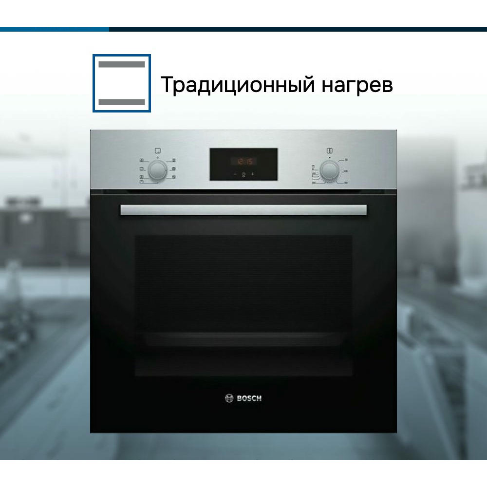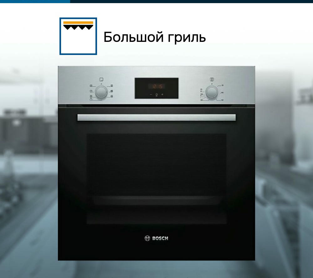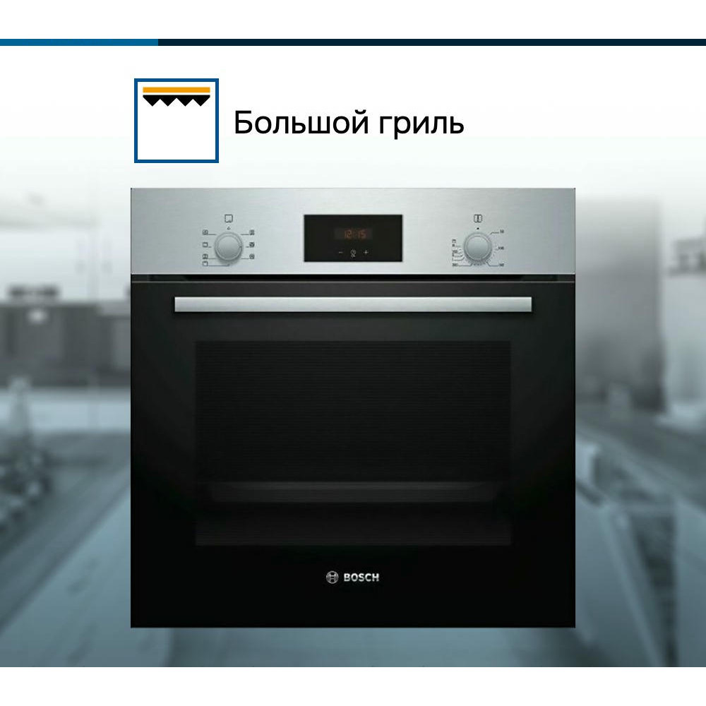 Духовой шкаф Bosch HBF133BR0 — это электрическая независимая модель. Она выполнена в цвете «нержавеющая сталь», благодаря чему отлично вписывается в современный кухонный интерьер. Ее внутренний объем составляет 66 литров, благодаря чему есть возможность запекать большие блюда. Управление осуществляется посредством нажатия кнопок, поворота переключателей, а также использования сенсорных кнопок. Благодаря многофункциональным часам Easy Clock можно с легкостью отслеживать время до окончания работы одной из программ. LED-дисплей имеет высокое качество изображения и устойчив к высоким температурам. Откидная дверца с двухслойным стеклом надежно удерживает пар внутри. Имеются телескопические направляющие, благодаря которым противень легко выдвигается, а риск получения ожога снижен..