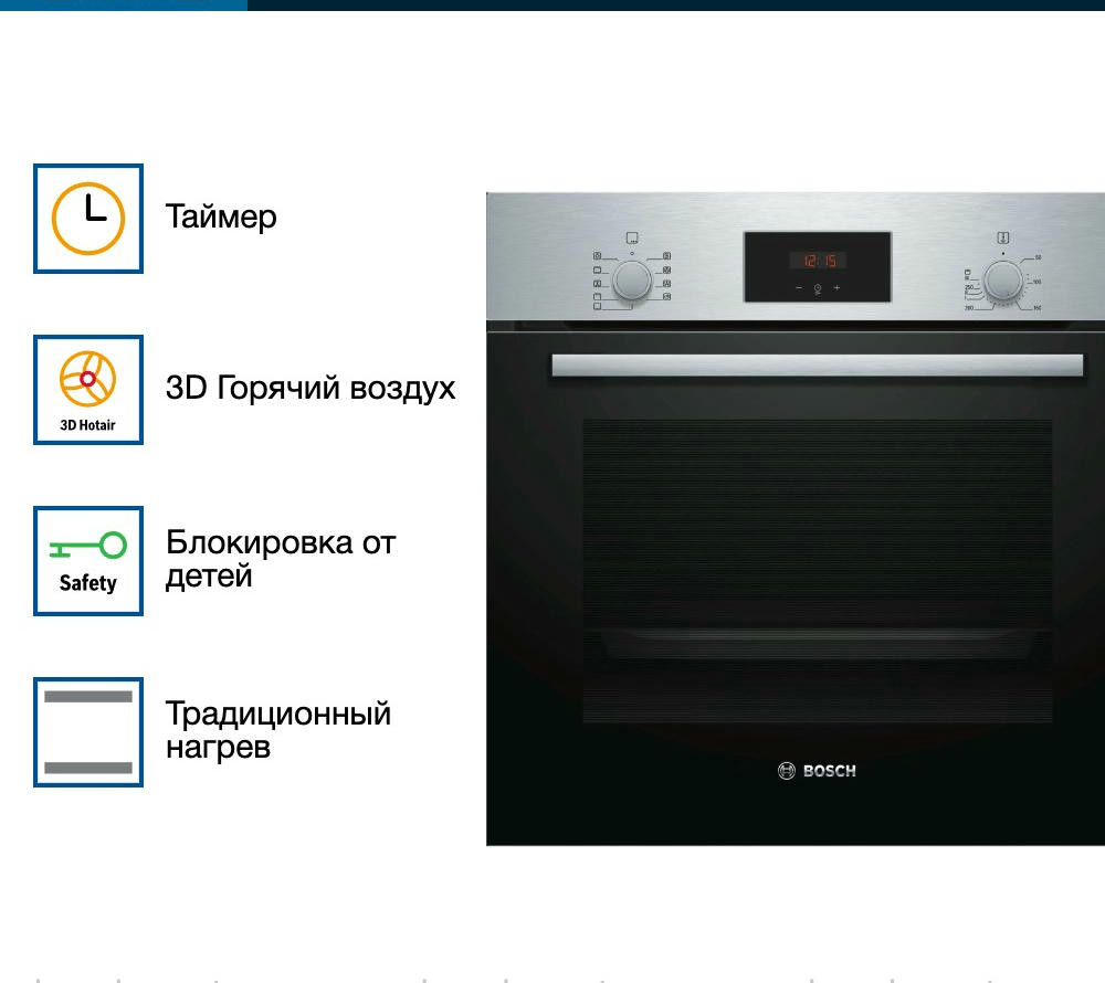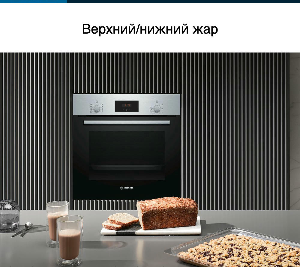Дверца духового шкафа Бош HBF134ES1с двойным стеклом хорошо удерживает горячий воздух в камере и в тоже время позволяет следить за тем, что происходит внутри. Она сделана по принципу «Холодный фронт» и практически не нагревается снаружи.