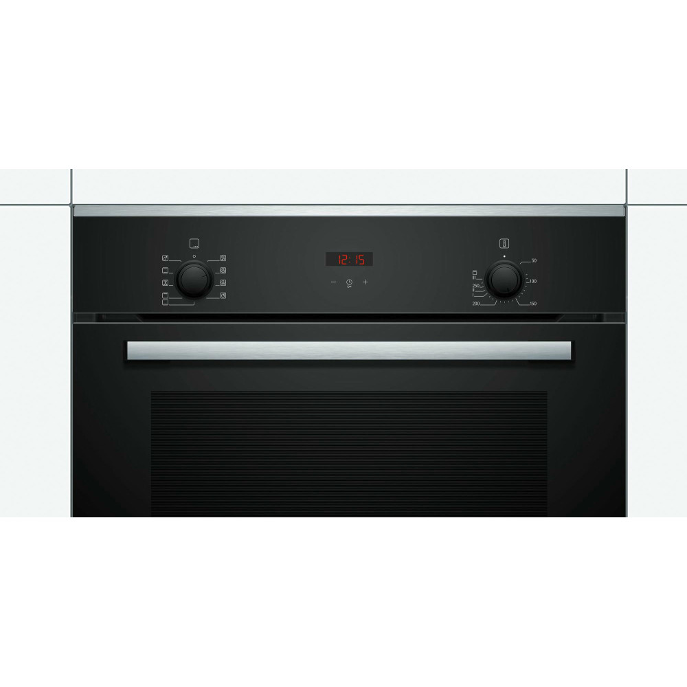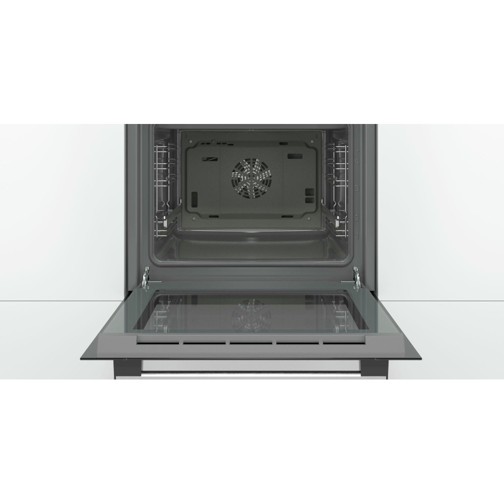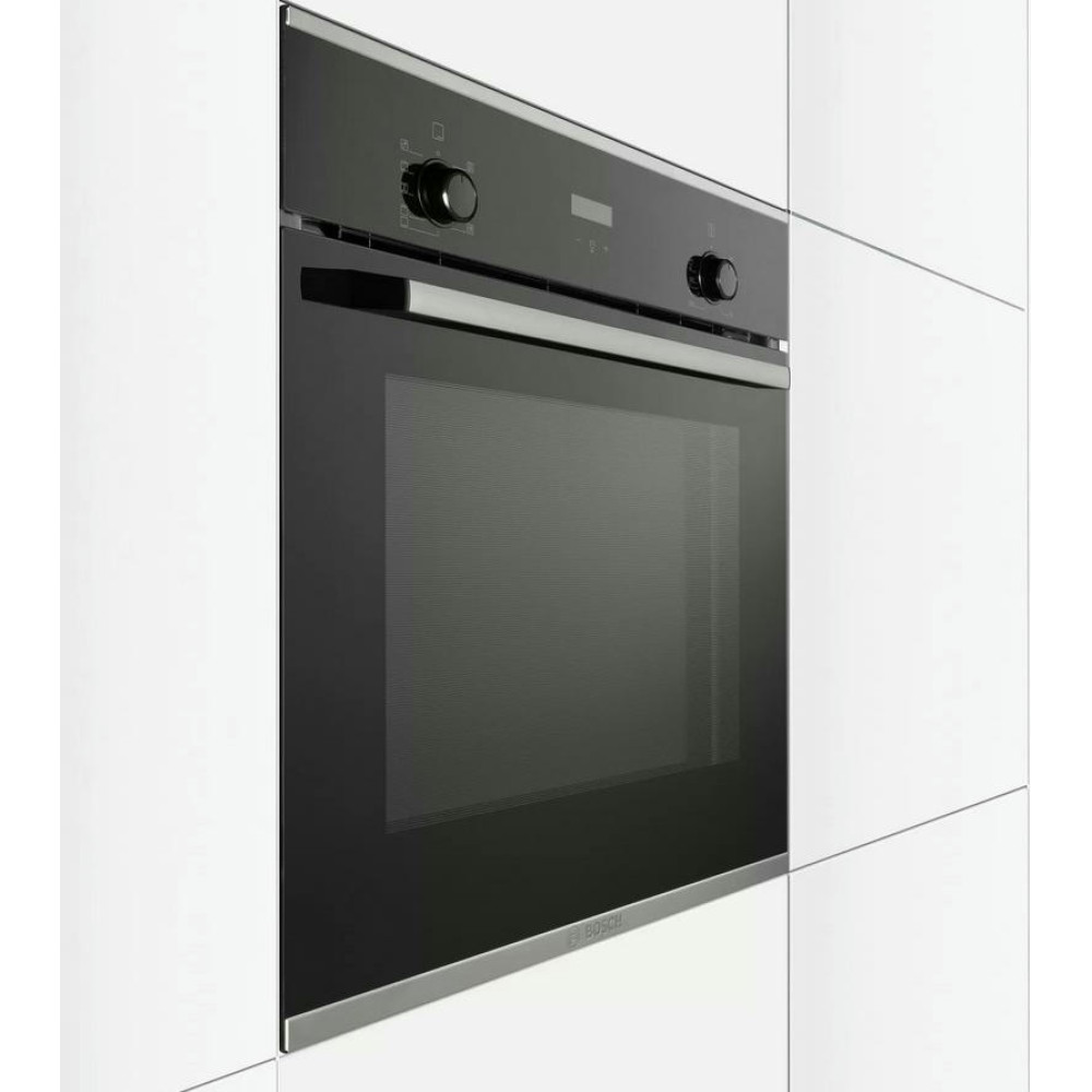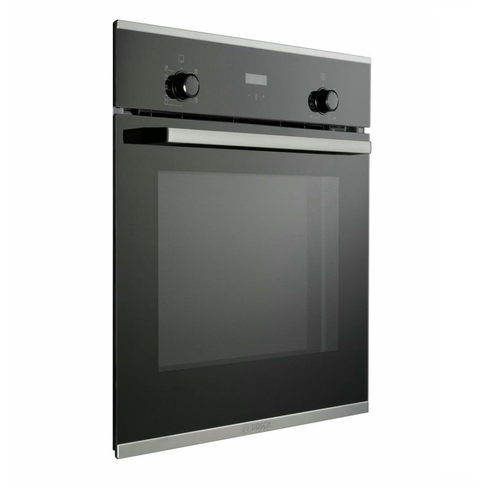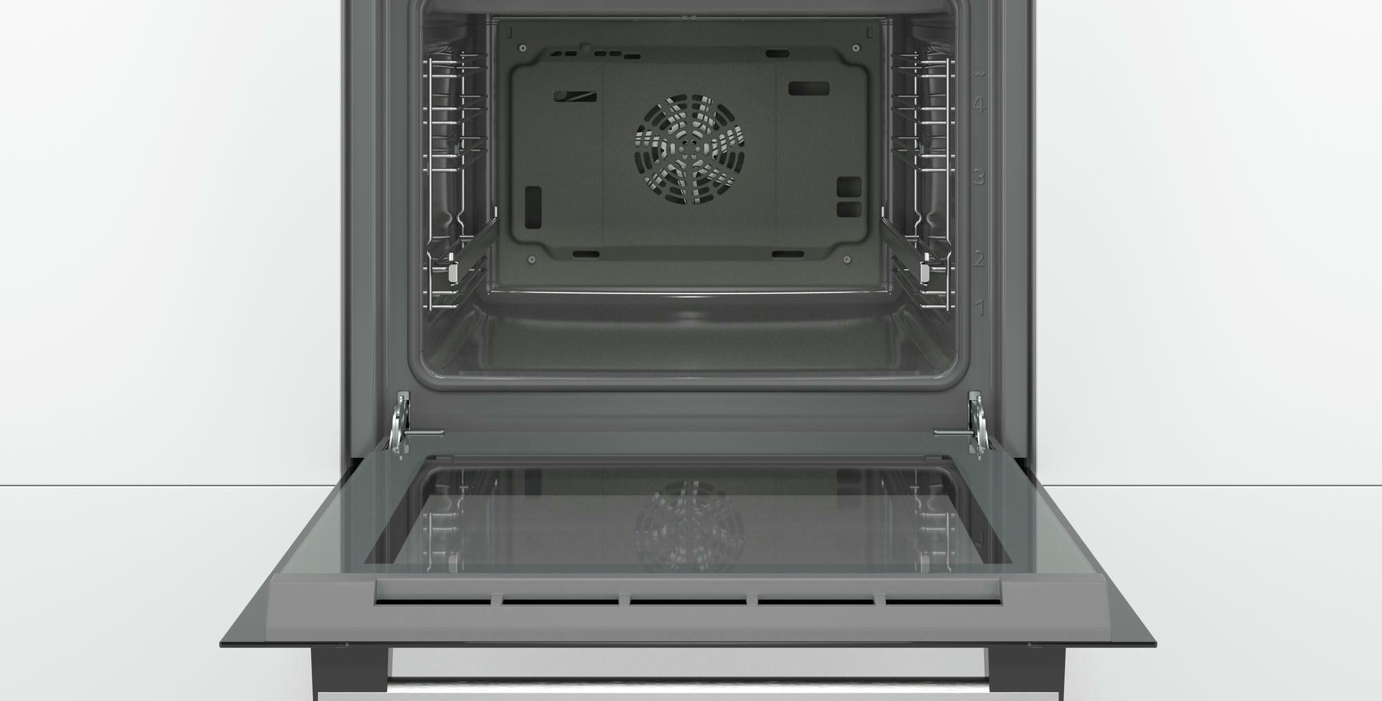 На панели управления расположены часы, которые при помощи сенсора переводятся в режим таймера. Ими также можно задать время приготовления блюда или время окончания готовки. Регулятор температуры позволяет установить степень нагрева от 50 до 275 _C. Бош HBF234EB0R включает в себя восемь режимов нагрева. В их число входит конвекция, позволяющая использовать горячий воздух в щадящем режиме. Это так называемый «умный» вид нагрева, используемый для приготовления мяса и рыбы. С его помощью прекрасно получается выпечка из дрожжевого теста, бисквиты и пирожные. Доступно также размораживание продуктов.