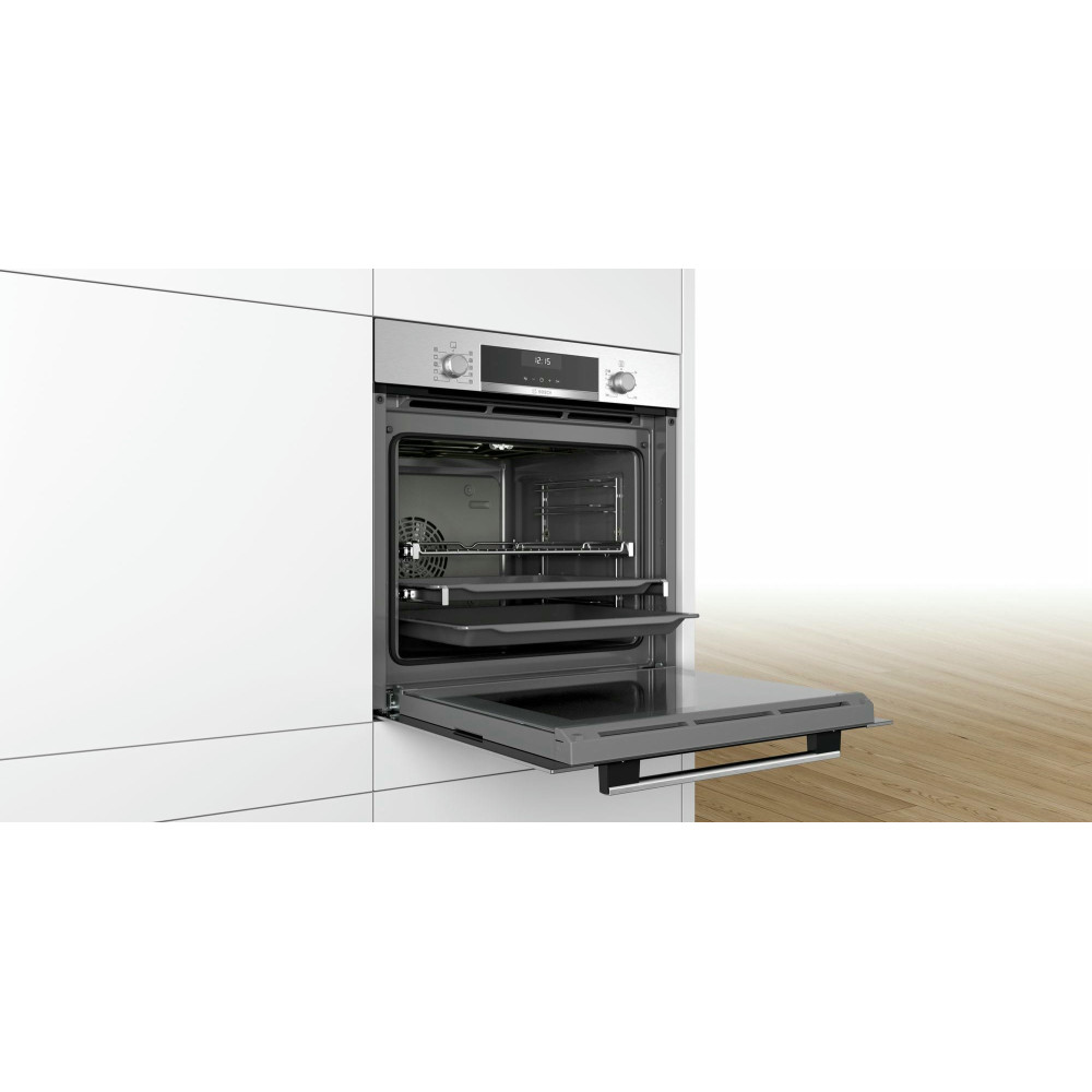 Эмаль лёгкой очистки GranitEnamel предотвращает появление пятен от пригоревшего жира. Задняя стенка рабочей камеры, благодаря покрытию EcoClean, легко очищается в режиме «3D-Горячий воздух». Противни можно размещать на пяти уровнях. Два из них оборудованы телескопическими направляющими со стоп-функцией. Глубокий и мелкий противни и металлическая решётка дают возможность готовить несколько порций одновременно. Галогенная лампочка позволяет наблюдать за процессом готовки, не открывая дверцу.