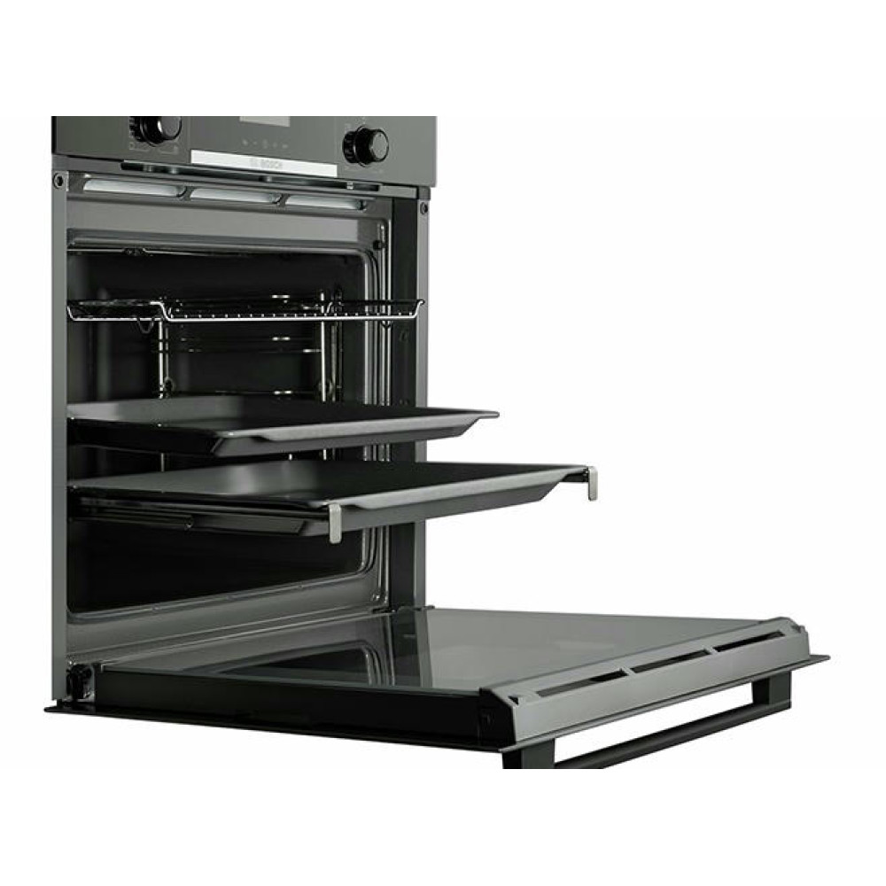 Внутреннее пространство модели Бош HBG537NB0R разделено на пять уровней. Самый верхний предназначен для гриля. Телескопические выдвижные направляющие установлены в средней части камеры: удобное положение для пирога, запекания большого противня с мясом и других объемных блюд.