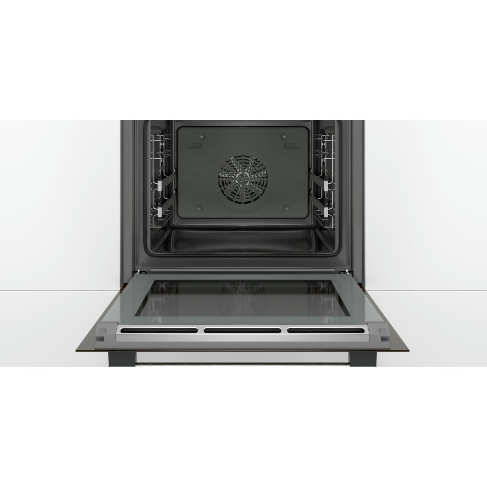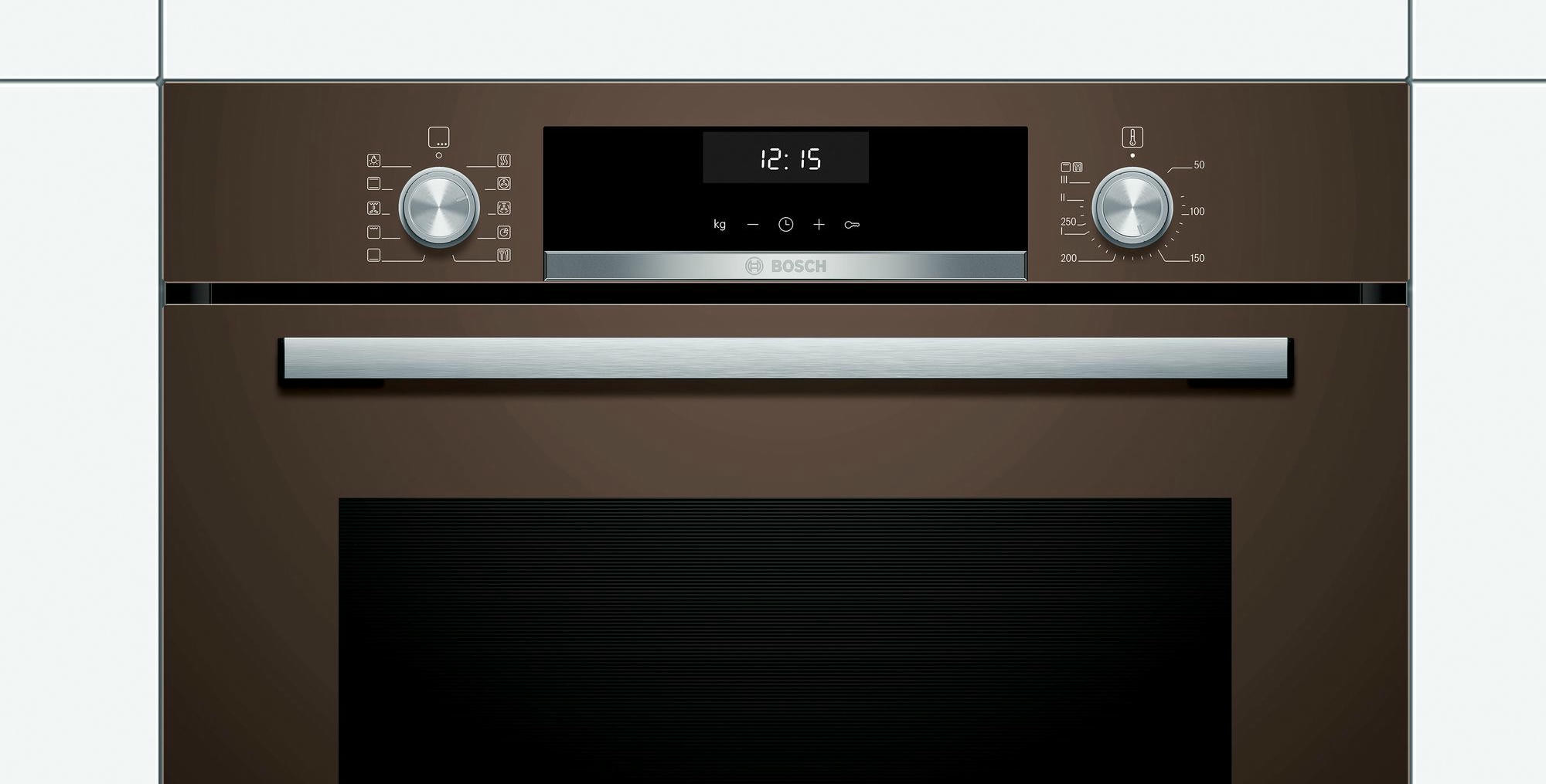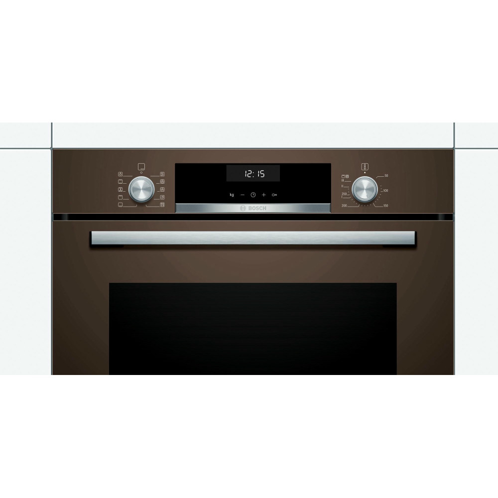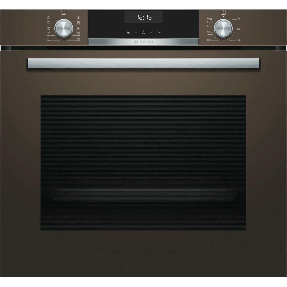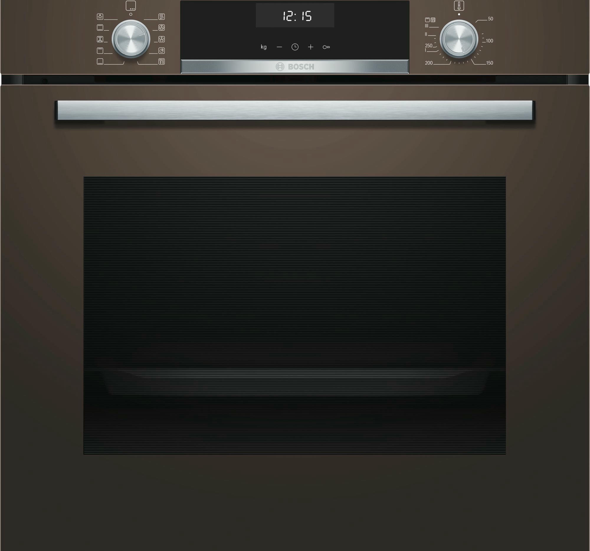 Bosch HBG537YM0R — это электрический духовой шкаф коричневого цвета объёмом 71 л. Камеру внутри освещает галогенная лампочка мощностью 25 Вт. Есть дисплей с индикацией температуры. Уровней установки противней — пять, в том числе два — с телескопическими направляющими. Предусмотрена блокировка от детей с возможностью настройки. В комплекте идут два противня (универсальный и эмалированный) и комбинированная решётка.