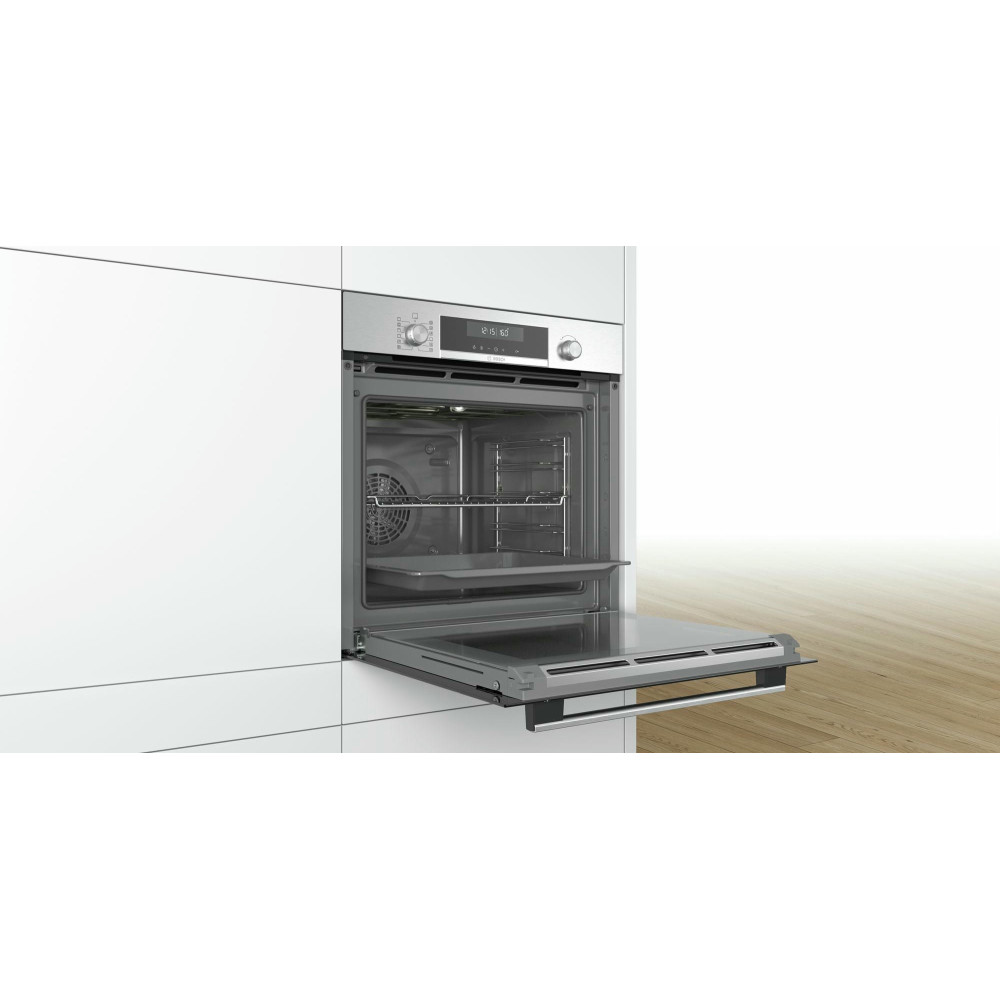 Дверца оснащена амортизатором SoftClose, позволяющим закрывать её плавно и бесшумно. Во время работы внешнее стекло нагревается не более чем 30°С, что сводит к минимуму риск ожогов. Для размещения противней предусмотрено пять уровней, направляющие навесные, но возможно установить телескопические.