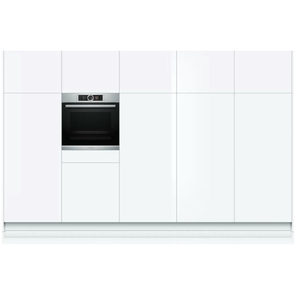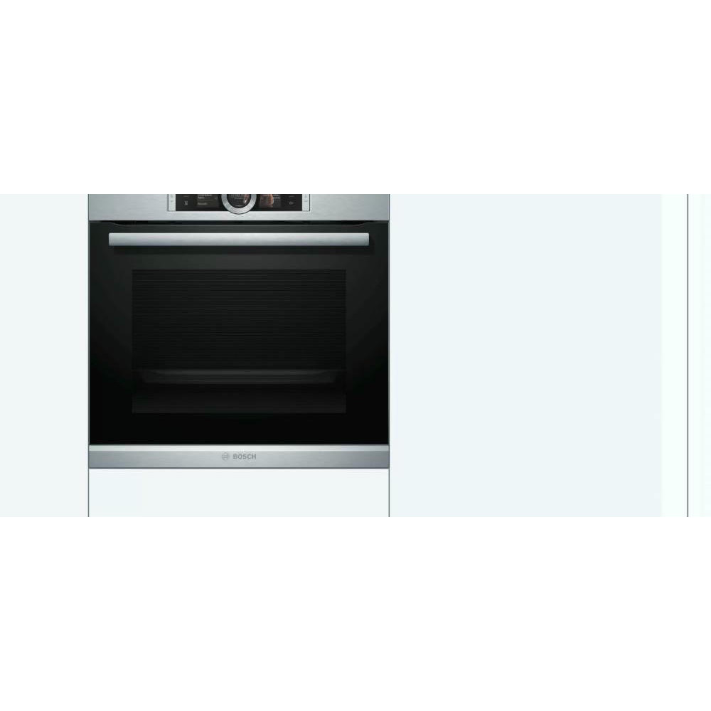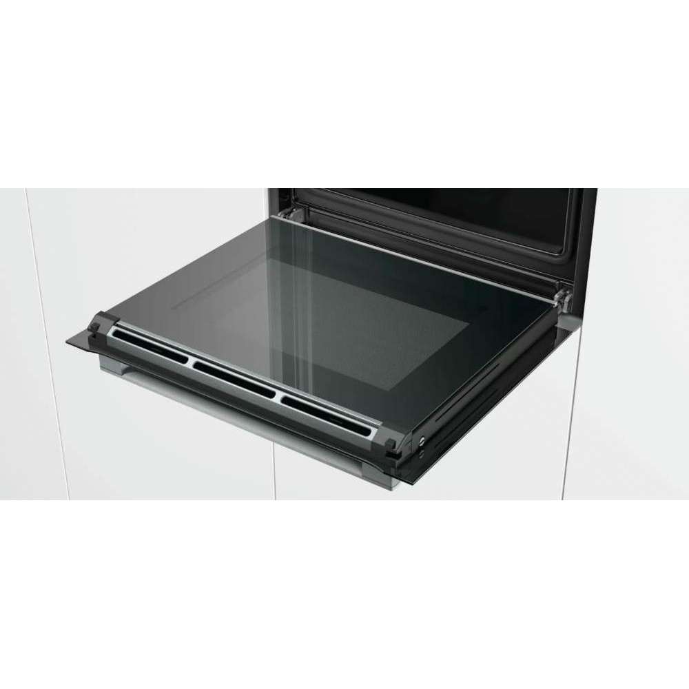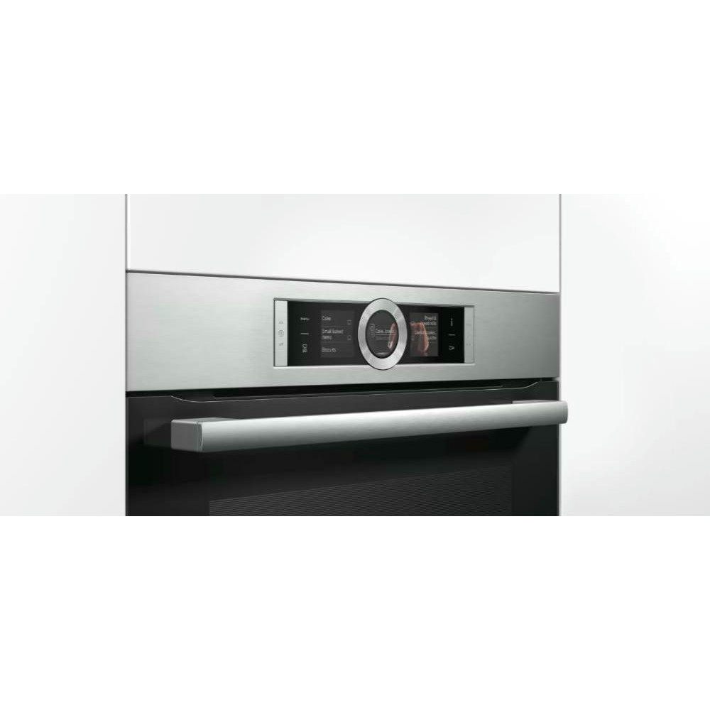 Духовой шкаф Bosch HBG636NS1 управляется при помощи сенсорного дисплея с кольцевым индикатором. За панелью управления легко ухаживать, она интуитивно понятна и удобна. Диапазон температур от 30 до 300 градусов позволяет готовить различные блюда — от йогурта и каши до пирогов и запеченного мяса.
