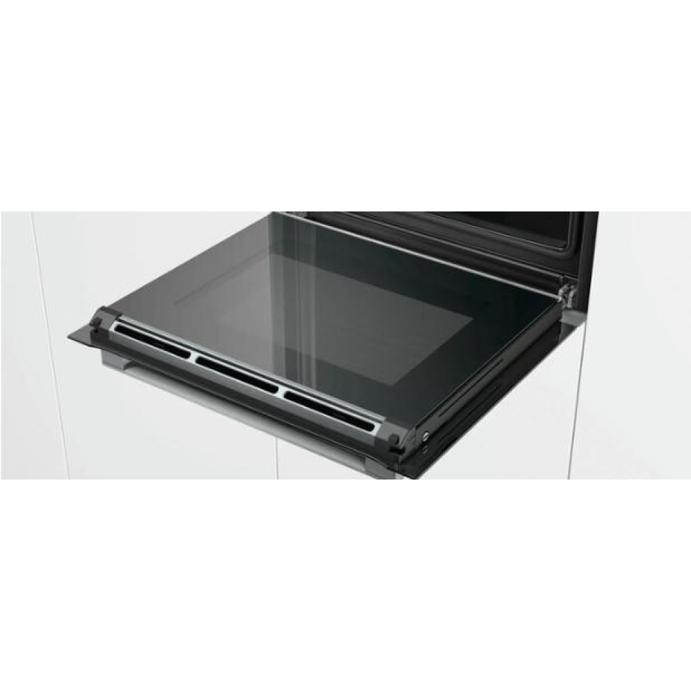 Функция 4D Горячий воздух дает возможность готовить разные продукты на нескольких уровнях одновременно, запахи при этом не смешиваются. На металлические направляющие может быть установлена телескопическая рельсовая система для удобства эксплуатации.