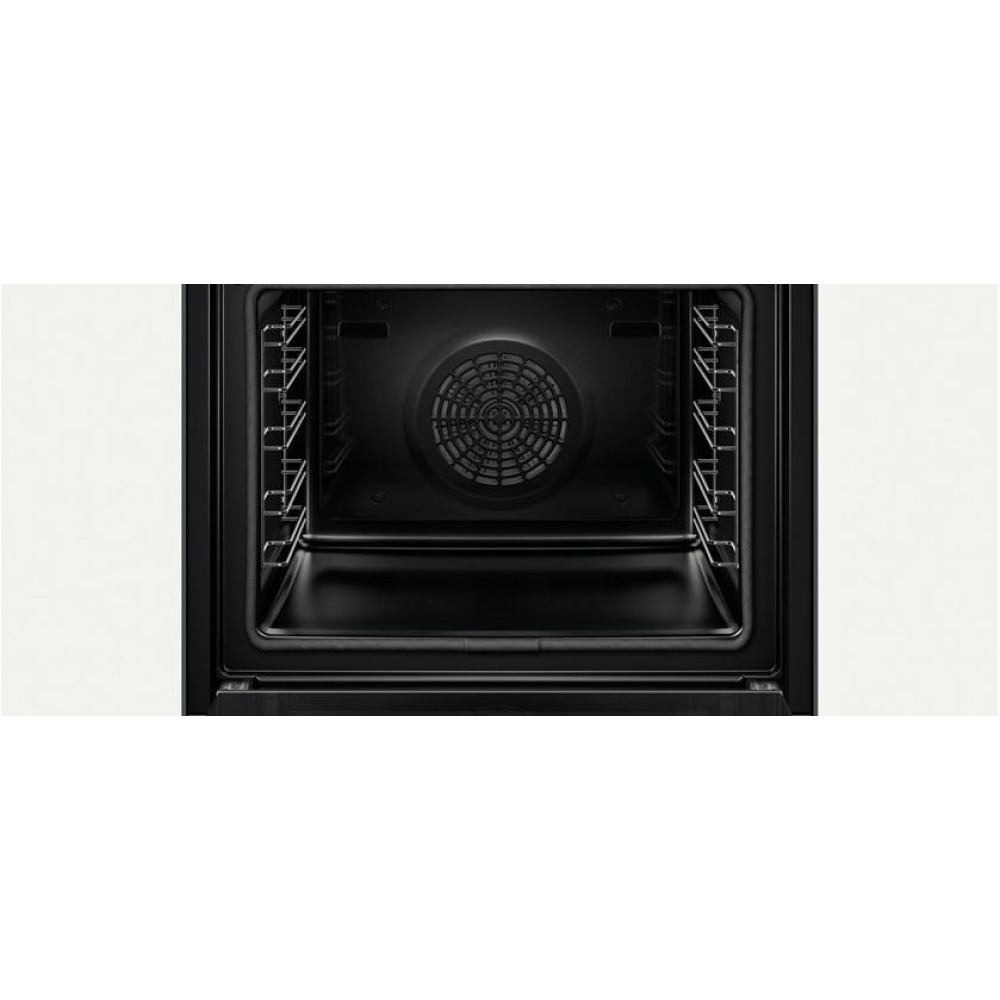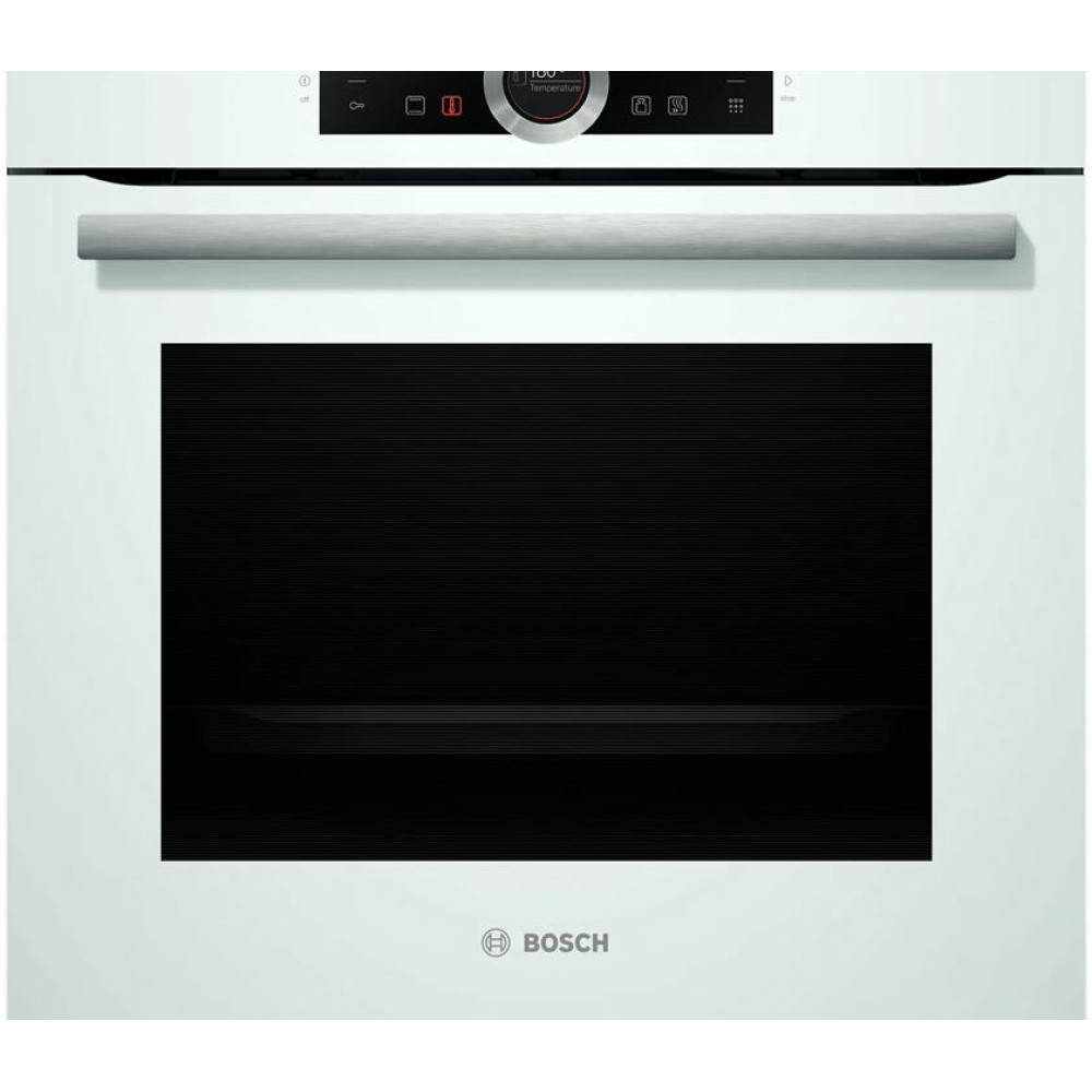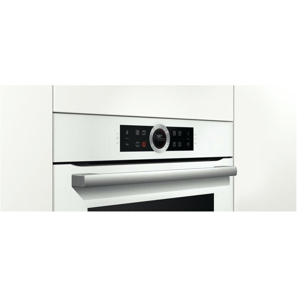 Духовой шкаф Bosch HBG672BW1F выполнен из комбинации белого стекла и нержавеющей стали. Панель управления — полностью сенсорная, с центральным плоским поворотным регулятором в виде кольца.